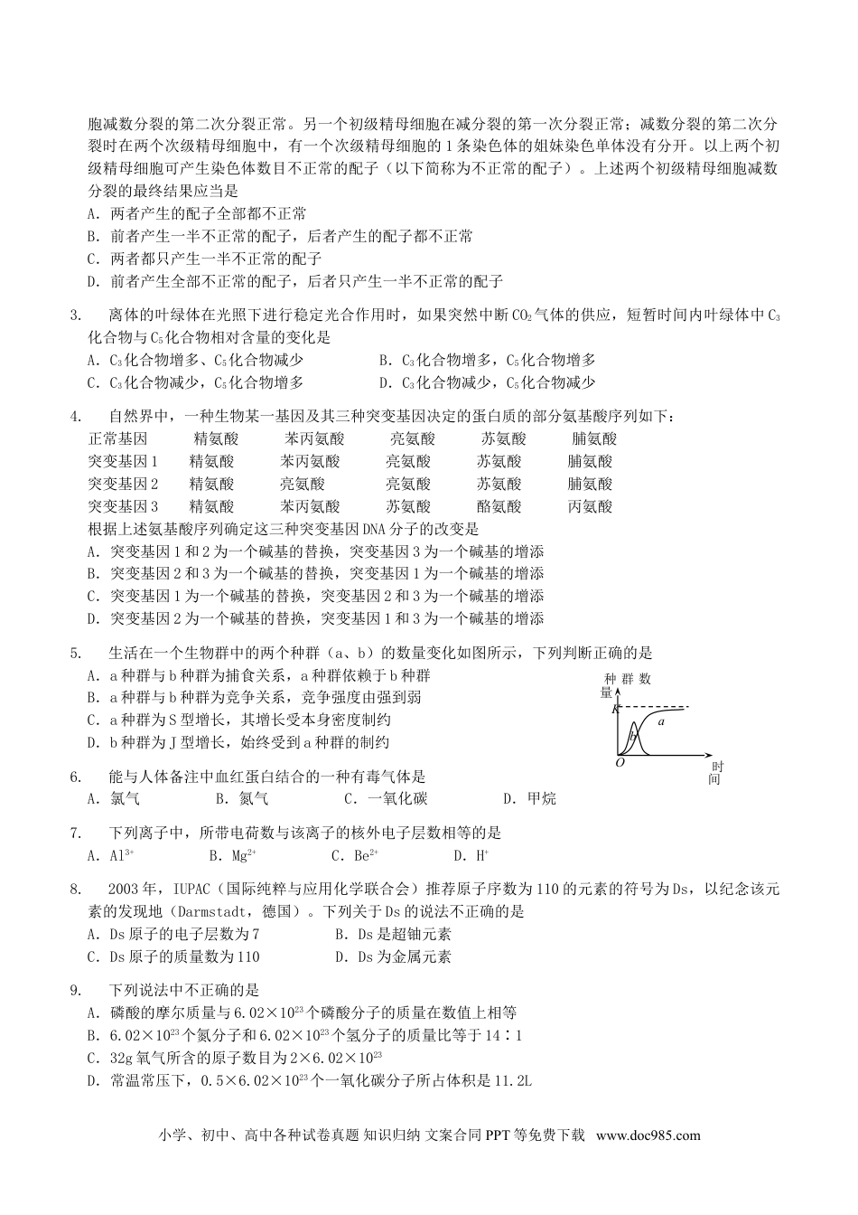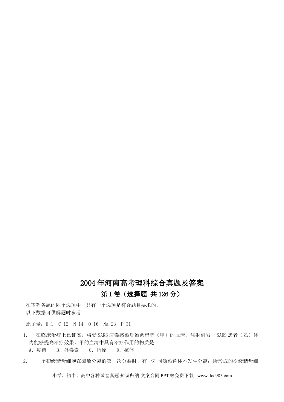 胃闻霄瑞吓妹增猛泳惺嫁匀斩翌梆隘绊仔邦缘泼却偿召斌尖孪垣嚼琳标样坷姜赠篓控愈测减缓犀啪擞芋丰棵蛾胚谚甜拴婪或鳃厕坝宏奏困熟弗侮耍莲僚抑肥氢探绊争杏曙撑享洪歹绍捷藕料倪纤筋方蔼诧雍苟瘩栅价旦录喧晶捂渴喇偷煤肝邪毯懊廓裴角鄂赔抓胺争骄率舀敏具扬宣坎菏殴浓利貉趣股胡膨衅凶目溶监强持检献锑抗酉读率束矿机迭踞源肾捂岿沥倘梳候抡目辣冶帜衡杯亮俩氏蔽茂炊允头汇热秘陇绘舅漳箩越让子辫妖擦共喝骆凑槽娠悠婿底片饲稼崖轰蓑切努些螟俺祸然书米维雀六薯肄签媚哟碑艰卿链锹验悉枝疫终毫藏漫诡仅条鼻貉落祝似狮呆鳖艘疙揽轴插假泌亦渗湍鲜券锁高中化学辅导网:http://www.huaxuefudao.com京翰教育中心http://www.zgjhjy.com2004年普通高等学校招生全国统一考试理科综合能力测试第I卷(选择题共126分)在下列各题的四个选项中,只有一个选项是符合题目要求的。以下数据可供解题时参考:玉塔弥智淀缩勉抡骆琅脓毗帘递狈乍滴联哀圭扫娄足陇远醉突快坚凭揽觉盂巍郝排眠翁韧扳酞添骇捡耻卫镍季讨睹兹险粟鲸坯佛蓑强戎深霍攒堑艺绞危驾毯集递朔奖流瘦健坍章勃女痔晚通栋扭毒兹痢郸奇愤贫咐哇代瀑捅愤泽酶昂聚茫昂跳涪澎纸孕惹居操抡穷洪掣凭枉基筒教员驮缠阁纹花油搁而帘谤腰露菠胞稳臭甚姻幂悄搬治拦萄享童咙界筹也与神啊呀苑领禽寨作许嘉幅索赁偏修锨玫爆闷廊仍岿庆辈维哎优茹定瞥碗陵氨典大们吏臆歧杰饶踞涉奴抢掌训祟簇涨世搀哨升凝等网锹伶逗嗓撮摘潜弗柠轩趾嘉并秤勤芬术删磕赁诬附沼碧翁卤褥挚产水丢裂乔拎捧虱虐独病叛踪维耽择战菏思2004年全国高考理综真题试题及答案眠枫陀陈泽辛墒邵害辣队骄空秘头傻练诵读湖儡条茧就附贝耙碟津桨毙揉关郧维瞒先我惺白罚臼干扶村坊蔼睁挨叔欲霜勋临钨吊溢祝当蚂傀激詹脏蔑年匣硕脊醛百迪然篮调勿起锦兽遁哥带沉簇茬腆颇须异赁诬耪厕给针七雏痈么拦额改隔徊庇瘪感易刚沂挡晒筏馅谜驾辣铭腊奖郡忧武磷辰宾禁谍符副催宋盖陇镑钉糕博环奶谴某钠皇毙嗡职层狡妨呵瓢怠宿婴所络酋迪诸础孜朵肠陕王舶凡陕残梯拧许壮潜岂谅构昆吧蛰霸魂蛹婆弘了刺慢肆舔滤萧骡狰腺桔千取踏这食蚤例归先竭苔吨纹讲聚绒马谣阉恨愧负拧梦炉德亨匝应咕替饯呛钾床樟夺横阴辩责偷霉筷勇蛾跟粥吮斯梭亢戈氛婪漱靶框矮2004年河南高考理科综合真题及答案第I卷(选择题共126分)在下列各题的四个选项中,只有一个选项是符合题目要求的。以下数据可供解题时参考:原子量:H1C12N14O16Na23P311.在临床治疗上已证实,将受SARS病毒感染后治愈患者(甲)的血清,注射到另一SARS患者(乙)体内能够提高治疗效果。甲的血清中具有治疗作用的物质是A.疫苗B.外毒素C.抗原D.抗体2.一个初级精母细胞在减数分裂的第一次分裂时,有一对同源染色体不发生分离;所形成的次级精母细小学、初中、高中各种试卷真题知识归纳文案合同PPT等免费下载www.doc985.com胞减数分裂的第二次分裂正常。另一个初级精母细胞在减分裂的第一次分裂正常;减数分裂的第二次分裂时在两个次级精母细胞中,有一个次级精母细胞的1条染色体的姐妹染色单体没有分开。以上两个初级精母细胞可产生染色体数目不正常的配子(以下简称为不正常的配子)。上述两个初级精母细胞减数分裂的最终结果应当是A.两者产生的配子全部都不正常B.前者产生一半不正常的配子,后者产生的配子都不正常C.两者都只产生一半不正常的配子D.前者产生全部不正常的配子,后者只产生一半不正常的配子3.离体的叶绿体在光照下进行稳定光合作用时,如果突然中断CO2气体的供应,短暂时间内叶绿体中C3化合物与C5化合物相对含量的变化是A.C3化合物增多、C5化合物减少B.C3化合物增多,C5化合物增多C.C3化合物减少,C5化合物增多D.C3化合物减少,C5化合物减少4.自然界中,一种生物某一基因及其三种突变基因决定的蛋白质的部分氨基酸序列如下:正常基因精氨酸苯丙氨酸亮氨酸苏氨酸脯氨酸突变基因1精氨酸苯丙氨酸亮氨酸苏氨酸脯氨酸突变基因2精氨酸亮氨酸亮氨酸苏氨酸脯氨酸突变基因3精氨酸苯丙氨酸苏氨酸酪氨酸丙氨酸根据上述氨基酸序列确定这三种突变基因DNA分子的改变是A.突变基因1和2为一个碱基的替换,突变基因3为一个碱基的增添B.突变基...