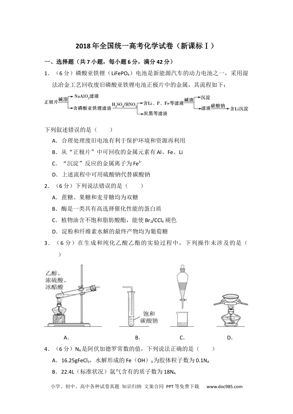 小学、初中、高中各种试卷真题知识归纳文案合同PPT等免费下载www.doc985.com2018年全国统一高考化学试卷(新课标Ⅰ)一、选择题(共7小题,每小题6分,满分42分)1.(6分)磷酸亚铁锂(LiFePO4)电池是新能源汽车的动力电池之一,采用湿法冶金工艺回收废旧磷酸亚铁锂电池正极片中的金属,其流程如下:下列叙述错误的是()A.合理处理废旧电池有利于保护环境和资源再利用B.从“正极片”中可回收的金属元素有Al、Fe、LiC.“沉淀”反应的金属离子为Fe3+D.上述流程中可用硫酸钠代替碳酸钠2.(6分)下列说法错误的是()A.蔗糖、果糖和麦芽糖均为双糖B.酶是一类具有高选择催化性能的蛋白质C.植物油含不饱和脂肪酸酯,能使Br2/CCl4褪色D.淀粉和纤维素水解的最终产物均为葡萄糖3.(6分)在生成和纯化乙酸乙酯的实验过程中,下列操作未涉及的是()A.B.C.D.4.(6分)NA是阿伏加德罗常数的值,下列说法正确的是()A.16.25gFeCl3,水解形成的Fe(OH)3为胶体粒子数为0.1NAB.22.4L(标准状况)氩气含有的质子数为18NA小学、初中、高中各种试卷真题知识归纳文案合同PPT等免费下载www.doc985.comC.92.0g甘油(丙三醇)中含有羟基数为1.0NAD.1.0molCH4与Cl2在光照下生成CH3Cl的分子数为1.0NA5.(6分)环之间共用一个碳原子的化合物称为螺环化合物,螺(2,2)戊烷()是最简单的一种,下列关于该化合物的说法错误的是()A.与环戊烯互为同分异构体B.二氯化物超过两种C.所有碳原子均处同一平面D.生成1molC5H12,至少需要2molH26.(6分)主族元素W、X、Y、Z的原子序数依次增加,且均不大于20.W、X、Z最外层电子数之和为10;W与Y同族;W与Z形成的化合物可与浓硫酸反应,其生成物可腐蚀玻璃。下列说法正确的是()A.常温常压下X的单质为气态B.Z的氢化物为离子化合物C.Y和Z形成的化合物的水溶液呈碱性D.W与Y具有相同的最高化合价7.(6分)最近我国科学家设计了一种CO2+H2S协同转化装置,实现对天然气中CO2和H2S的高效去除。示意图如右所示,其中电极分别为ZnO@石墨烯(石墨烯包裹的ZnO)和石墨烯,石墨烯电极区发生反应为:①EDTAFe﹣2+e﹣﹣=EDTAFe﹣3+②2EDTAFe﹣3++H2S=2H++S+2EDTAFe﹣2+该装置工作时,下列叙述错误的是()小学、初中、高中各种试卷真题知识归纳文案合同PPT等免费下载www.doc985.comA.阴极的电极反应:CO2+2H++2e﹣═CO+H2OB.协同转化总反应:CO2+H2S═CO+H2O+SC.石墨烯上的电势比ZnO@石墨烯上的低D.若采用Fe3+/Fe2+取代EDTAFe﹣3+/EDTAFe﹣2+,溶液需为酸性二、解答题(共3小题,满分43分)8.(14分)醋酸亚铬[(CH3COO)2Cr•2H2O]为砖红色晶体,难溶于冷水,易溶于酸,在气体分析中用作氧气吸收剂。一般制备方法是先在封闭体系中利用金属锌作还原剂,将三价铬还原为二价络;二价铬再与醋酸钠溶液作用即可制得醋酸亚铬。实验装置如图所示。回答下列问题:(1)实验中所用蒸馏水均需经煮沸后迅速冷却,目的是仪器a的名称是。(2)将过量锌粒和氯化铬固体置于c中,加入少量蒸馏水,按图连接好装置。打开K1、K2,关闭K3。①c中溶液由绿色逐渐变为亮蓝色,该反应的离子方程式为②同时c中有气体产生,该气体的作用是(3)打开K3,关闭K1和K2.c中亮蓝色溶液流入d,其原因是;d中析出砖红色沉淀。为使沉淀充分析出并分离,需采用的操作是、洗涤,干燥。(4)指出装置d可能存在的缺点9.(14分)焦亚硫酸钠(Na2S2O5)在医药、橡胶、印染、食品等方面应用广泛。回答下列问题:(1)生产Na2S2O5,通常是由NaHSO3过饱和溶液经结晶脱水制得。写出该过程小学、初中、高中各种试卷真题知识归纳文案合同PPT等免费下载www.doc985.com的化学方程式(2)利用烟道气中的SO2生产Na2S2O5,的工艺为:①pH=4.1时,Ⅰ中为溶液(写化学式)。②工艺中加入Na2CO3固体,并再次充入SO2的目的是。(3)制备Na2S2O5也可采用三室膜电解技术,装置如图所示,其中SO2碱吸收液中含有NaHSO3和Na2SO3.阳极的电极反应式为。电解后,室的NaHSO3浓度增加。将该室溶液进行结晶脱水,可得到Na2S2O5(4)Na2S2O5可用作食品的抗氧化剂。在测定某葡萄酒中Na2S2O5残留量时,取50.00...