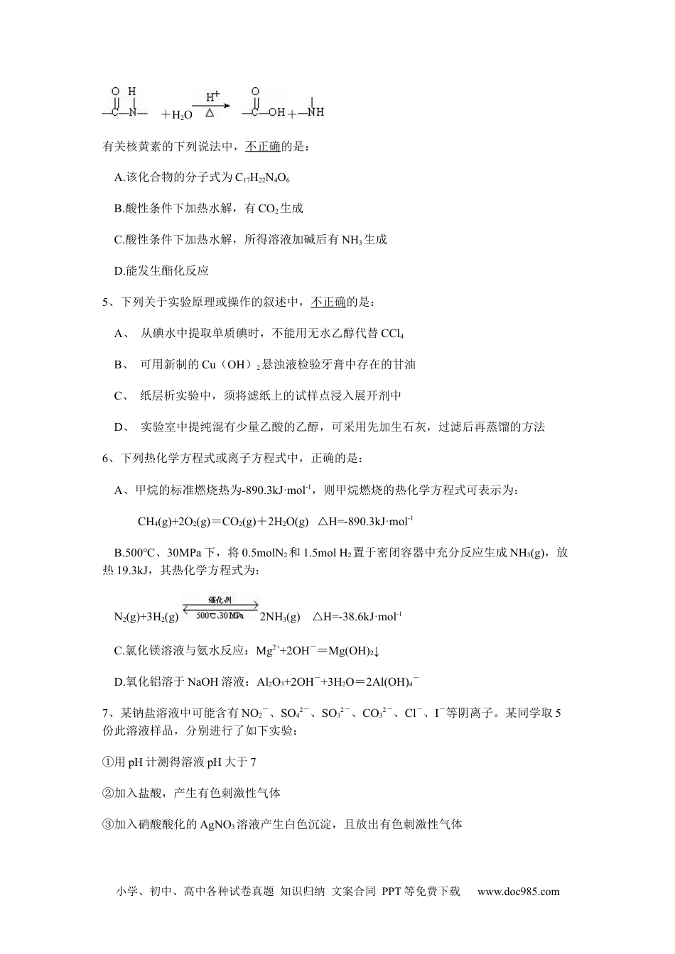 小学、初中、高中各种试卷真题知识归纳文案合同PPT等免费下载www.doc985.com2010年高考理综化学试题(浙江卷)1、下列说法中正确的是A.光导纤维、棉花、油脂、ABS树脂都是由高分子化合物组成的物质B.开发核能、太阳能等新能源,推广基础甲醇汽油,使用无磷洗涤剂都可直接降低碳排放C.红外光谱仪、核磁共振仪、质谱仪都可用于有机化合物结构的分析D.阴极射线、-粒子散射现象及布朗运动的发现都对原子结构模型的建立作出了贡献2、有X、Y、Z、W、M五种短周期元素,其中X、Y、Z、W同周期,Z、M同主族;X+与M2-具有相同的电子层结构;离子半径:Z2->W-;Y的单质晶体熔点高、硬度大,是一种重要的半导体材料。下列说法中,正确的是A.X、M两种元素只能形成X2M型化合物B.由于W、Z、M元素的氢气化物相对分子质量依次减小,所以其沸点依次降低C.元素Y、Z、W的单质晶体属于同种类型的晶体D.元素W和M的某些单质可作为水处理中的消毒剂3、Li-Al/FeS电池是一种正在开发的车载电池,该电池中正极的电极反应式为:2Li+FeS+2e-=Li2S+Fe有关该电池的下列中,正确的是A.Li-Al在电池中作为负极材料,该材料中Li的化合价为+1价B.该电池的电池反应式为:2Li+FeS=Li2S+FeC.负极的电极反应式为Al-3e-=Al3+D.充电时,阴极发生的电极反应式为:Li2S+Fe-2e-=2Li++FeS4、核黄素又称为维生素B2,可促进发育和细胞再生,有利于增进视力,减轻眼睛疲劳。核黄素分子的结构为:已知:小学、初中、高中各种试卷真题知识归纳文案合同PPT等免费下载www.doc985.com+H2O+有关核黄素的下列说法中,不正确的是:A.该化合物的分子式为C17H22N4O6B.酸性条件下加热水解,有CO2生成C.酸性条件下加热水解,所得溶液加碱后有NH3生成D.能发生酯化反应5、下列关于实验原理或操作的叙述中,不正确的是:A、从碘水中提取单质碘时,不能用无水乙醇代替CCl4B、可用新制的Cu(OH)2悬浊液检验牙膏中存在的甘油C、纸层析实验中,须将滤纸上的试样点浸入展开剂中D、实验室中提纯混有少量乙酸的乙醇,可采用先加生石灰,过滤后再蒸馏的方法6、下列热化学方程式或离子方程式中,正确的是:A、甲烷的标准燃烧热为-890.3kJ·mol-1,则甲烷燃烧的热化学方程式可表示为:CH4(g)+2O2(g)=CO2(g)+2H2O(g)H=-890.3kJ·mol△-1B.500℃、30MPa下,将0.5molN2和1.5molH2置于密闭容器中充分反应生成NH3(g),放热19.3kJ,其热化学方程式为:N2(g)+3H2(g)2NH3(g)H=-38.6kJ·mol△-1C.氯化镁溶液与氨水反应:Mg2++2OH-=Mg(OH)2↓D.氧化铝溶于NaOH溶液:Al2O3+2OH-+3H2O=2Al(OH)4-7、某钠盐溶液中可能含有NO2-、SO42-、SO32-、CO32-、Cl-、I-等阴离子。某同学取5份此溶液样品,分别进行了如下实验:①用pH计测得溶液pH大于7②加入盐酸,产生有色刺激性气体③加入硝酸酸化的AgNO3溶液产生白色沉淀,且放出有色刺激性气体小学、初中、高中各种试卷真题知识归纳文案合同PPT等免费下载www.doc985.com④加足量BaCl2溶液,产生白色沉淀,该沉淀溶于稀硝酸且放出气体,将气体通入品红溶液,溶液不褪色⑤加足量BaCl2溶液,产生白色沉淀,在滤液中加入酸化的(NH4)2Fe(SO4)2溶液,再滴加KSCN溶液,显红色该同学最终确定在上述六种离子中仅含NO2-、CO32-、Cl-三种阴离子。请分析,该同学只需要完成上述哪几个实验,即可得出此结论。A.①②④⑤B.③④C.③④⑤D.②③⑤8、洗车安全气囊是行车安全的重要保障。当车辆发生碰撞的瞬间,安全装置通电点火使其中的粉末分解释放出大量的氮气形成气囊,从而保护司机及乘客免受伤害。为研究安全气囊工作的化学原理,取安全装置中的固体粉末进行实验。经组成分析,确定该粉末仅Na、Fe、N、O四种元素。水溶性试验表明,固体粉末部分溶解。经检测,可溶物为化合物甲;不溶物为红棕色固体,可溶于盐酸。取13.0g化合物甲,加热使其完全分解,生成氮气和单质乙,生成的氮气折合成标准状况下的体积为6.72L。单质乙就在高温隔绝空气的条件下与不溶物红棕色粉末反应生成化合物丙和另和一种单质。化合物丙与空气接触可转化为可溶性盐。请回答下列问题:(1)甲的化学方程式为,丙的电子式为。(2)若丙在空气...