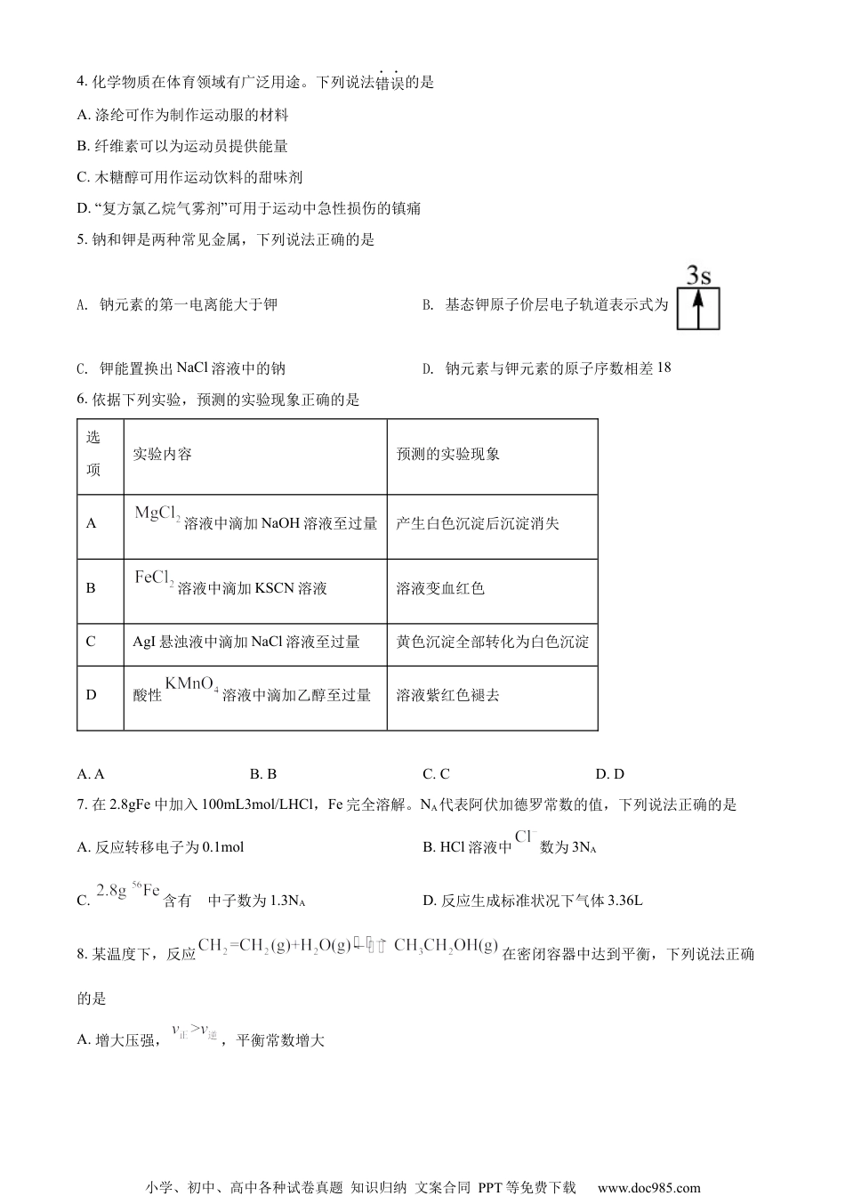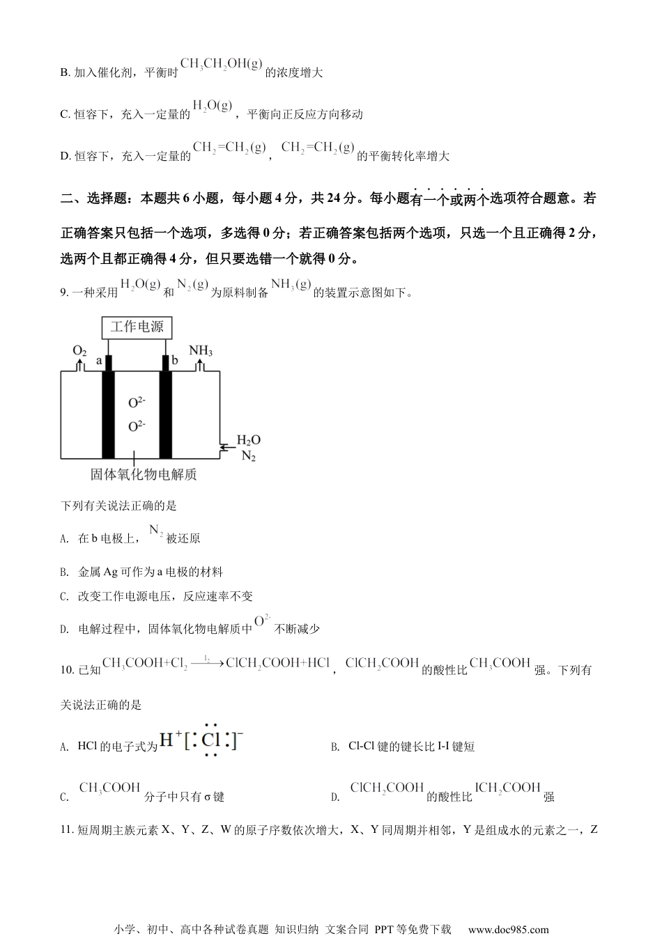 小学、初中、高中各种试卷真题知识归纳文案合同PPT等免费下载www.doc985.com海南省2022年普通高中学业水平选择性考试化学试题注意事项:1.答卷前,考生务必将自己的姓名、准考证号填写在答题卡上。2.回答选择题时,选出每小题答案后,用铅笔把答题卡上对应题目的答案标号涂黑。如需改动,用橡皮擦干净后,再选涂其他答案标号,回答非选择题时,将答案写在答题卡上,写在本试卷上无效。3.考试结束后,将本试卷和答题卡一并交回。可能用到的相对原子质量:H1C12N14O16P31Fe56一、选择题:本题共8小题,每小题2分,共16分。在每小题给出的四个选项中,只有一项是符合题目要求的。1.化学与日常生活息息相关。下列说法错误的是A.使用含氟牙膏能预防龋齿B.小苏打的主要成分是C.可用食醋除去水垢中的碳酸钙D.使用食品添加剂不应降低食品本身营养价值2.《医学入门》中记载我国传统中医提纯铜绿的方法:“水洗净,细研水飞,去石澄清,慢火熬干,”其中未涉及的操作是A.洗涤B.粉碎C.萃取D.蒸发3.下列实验操作规范的是A.过滤B.排空气法收集C.混合浓硫酸和乙醇D.溶液的转移A.AB.BC.CD.D小学、初中、高中各种试卷真题知识归纳文案合同PPT等免费下载www.doc985.com4.化学物质在体育领域有广泛用途。下列说法错误的是A.涤纶可作为制作运动服的材料B.纤维素可以为运动员提供能量C.木糖醇可用作运动饮料的甜味剂D.“复方氯乙烷气雾剂”可用于运动中急性损伤的镇痛5.钠和钾是两种常见金属,下列说法正确的是A.钠元素的第一电离能大于钾B.基态钾原子价层电子轨道表示式为C.钾能置换出NaCl溶液中的钠D.钠元素与钾元素的原子序数相差186.依据下列实验,预测的实验现象正确的是选项实验内容预测的实验现象A溶液中滴加NaOH溶液至过量产生白色沉淀后沉淀消失B溶液中滴加KSCN溶液溶液变血红色CAgI悬浊液中滴加NaCl溶液至过量黄色沉淀全部转化为白色沉淀D酸性溶液中滴加乙醇至过量溶液紫红色褪去A.AB.BC.CD.D7.在2.8gFe中加入100mL3mol/LHCl,Fe完全溶解。NA代表阿伏加德罗常数的值,下列说法正确的是A.反应转移电子为0.1molB.HCl溶液中数为3NAC.含有的中子数为1.3NAD.反应生成标准状况下气体3.36L8.某温度下,反应在密闭容器中达到平衡,下列说法正确的是A.增大压强,,平衡常数增大小学、初中、高中各种试卷真题知识归纳文案合同PPT等免费下载www.doc985.comB.加入催化剂,平衡时的浓度增大C.恒容下,充入一定量的,平衡向正反应方向移动D.恒容下,充入一定量的,的平衡转化率增大二、选择题:本题共6小题,每小题4分,共24分。每小题有一个或两个选项符合题意。若正确答案只包括一个选项,多选得0分;若正确答案包括两个选项,只选一个且正确得2分,选两个且都正确得4分,但只要选错一个就得0分。9.一种采用和为原料制备的装置示意图如下。下列有关说法正确的是A.在b电极上,被还原B.金属Ag可作为a电极的材料C.改变工作电源电压,反应速率不变D.电解过程中,固体氧化物电解质中不断减少10.已知,的酸性比强。下列有关说法正确的是A.HCl的电子式为B.Cl-Cl键的键长比I-I键短C.分子中只有σ键D.的酸性比强11.短周期主族元素X、Y、Z、W的原子序数依次增大,X、Y同周期并相邻,Y是组成水的元素之一,Z小学、初中、高中各种试卷真题知识归纳文案合同PPT等免费下载www.doc985.com在同周期主族元素中金属性最强,W原子在同周期主族元素中原子半径最小,下列判断正确的是A.是非极性分子B.简单氢化物沸点:C.Y与Z形成的化合物是离子化合物D.X、Y、Z三种元素组成的化合物水溶液呈酸性12.化合物“E7974”具有抗肿痛活性,结构简式如下,下列有关该化合物说法正确的是A.能使的溶液褪色B.分子中含有4种官能团C.分子中含有4个手性碳原子D.1mol该化合物最多与2molNaOH反应13.NaClO溶液具有添白能力,已知25℃时,。下列关于NaClO溶液说法正确的是A.0.01mol/L溶液中,B.长期露置在空气中,释放,漂白能力减弱C.通入过量,反应的离子方程式为D.25℃,的NaClO和HClO的混合溶液中,14.某元素M的氢氧化物在水中的溶解反应为:、,25℃,-lgc与pH的关系如图所示,c为或浓度的值,下列说法错误的是小学、初中、高中各种试卷真题知...