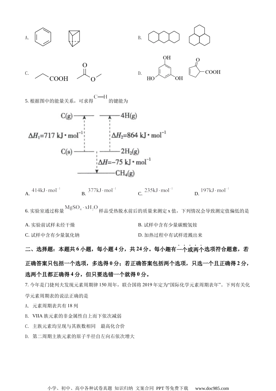 小学、初中、高中各种试卷真题知识归纳文案合同PPT等免费下载www.doc985.com2019年普通高等学校招生全国统一考试化学注意事项:1.答卷前,考生务必将自己的姓名、准考证号填写在答题卡上。2.回答选择题时,选出每小题答案后,用铅笔把答题卡上对应题目的答案标号涂黑。如需改动,用橡皮擦干净后,再选涂其他答案标号。回答非选择题时,将答案写在答题卡上。写在本试卷上无效。3.考试结束后,将本试卷和答题卡一并交回。可能用到的相对原子质量:一、选择题:本题共6小题,每小题2分,共12分,在每小题给出的四个选项中,只有一项是符合题目要求的。1.某试剂瓶标签上安全标志如图,该试剂是A.氨水B.乙酸C.氢氧化钠D.硝酸2.我国古代典籍中有“石胆……浅碧色,烧之变白色者真”的记载,其中石胆是指A.B.C.D.3.反应C2H6(g)C2H4(g)+H2(g)△H>0,在一定条件下于密闭容器中达到平衡。下列各项措施中,不能提高乙烷平衡转化率的是A.增大容器容积B.升高反应温度C.分离出部分氢气D.等容下通入惰性气体4.下列各组化合物中不互为同分异构体的是小学、初中、高中各种试卷真题知识归纳文案合同PPT等免费下载www.doc985.comA.B.C.D.5.根据图中的能量关系,可求得的键能为A.B.C.D.6.实验室通过称量样品受热脱水前后的质量来测定x值,下列情况会导致测定值偏低的是A.实验前试样未经干燥B.试样中含有少量碳酸氢铵C.试样中含有少量氯化钠D.加热过程中有试样迸溅出来二、选择题:本题共6小题,每小题4分,共24分。每小趣有一个或两个选项符合题意,若正确答案只包括一个选项,多选得0分;若正确答案包括两个选项,只选一个且正确得2分,选两个且都正确得4分,但只要选错一个就得0分。7.今年是门捷列夫发现元素周期律150周年,联合国将2019年定为“国际化学元素周期表年”。下列有关化学元素周期表的说法正确的是A.元素周期表共有18列B.VIIA族元素的非金属性自上而下依次减弱C.主族元素均呈现与其族数相同的最高化合价D.第二周期主族元素的原子半径自左向右依次增大小学、初中、高中各种试卷真题知识归纳文案合同PPT等免费下载www.doc985.com8.微型银-锌电池可用作电子仪器的电源,其电极分别是和,电解质为溶液,电池总反应为,下列说法正确的是A.电池工作过程中,溶液浓度降低B.电池工作过程中,电解液中向负极迁移C.负极发生反应D.正极发生反应9.一定温度下,AgCl(s)Ag+(aq)+Cl-(aq)体系中,c(Ag+)和c(Cl-)的关系如图所示。下列说法正确的是A.a、b、c三点对应的Ksp相等B.AgCl在c点的溶解度比b点的大C.AgCl溶于水形成的饱和溶液中,c(Ag+)=c(Cl-)D.b点的溶液中加入AgNO3固体,c(Ag+)沿曲线向c点方向变化10.下列说法正确的是A.和都属于两性氧化物B.悬浊液和乳浊液的分散质均为液态C.和中的金属都呈现两种价态D.葡萄糖溶液和淀粉溶液都具有丁达尔效应11.能正确表示下列反应的离子方程式为A.向FeBr2溶液中通入过量Cl2:2Fe2++Cl2=2Fe3++2Cl-B.向碳酸钠溶液中通入少量CO2:CO32-+CO2+H2O=2HCO3-C.向碘化钾溶液中加入少量双氧水:3H2O2+I-=IO3-+3H2OD.向硫化钠溶液中通入过量SO2:2S2-+5SO2+2H2O=3S↓+4HSO3-小学、初中、高中各种试卷真题知识归纳文案合同PPT等免费下载www.doc985.com12.下列化合物中,既能发生取代反应又能发生加成反应的有A.CH3-CH=CH2B.CH3CH2CH2OHC.D.三、非选择题:共4分。每个试题考生都必须作答。13.自门捷列夫发现元素周期律以来,人类对自然的认识程度逐步加深,元素周期表中的成员数目不断增加。回答下列问题:(1)2016年确认了四种新元素,其中一种为,中文名为“”。元素可由反应:+=+3得到。该元素的质子数为______,与互为_________。(2)位于元素周期表中第族,同族元素N的一种氢化物为NH2NH2,写出该化合物分子的电子式________________.该分子内存在的共价键类型有_______。(3)该族中的另一元素P能呈现多种化合价,其中价氧化物的分子式为______,价简单含氧酸的分子式为______。14.由羟基丁酸生成丁内酯的反应如下:HOCH2CH2CH2COOH+H2O在298K下,羟基丁酸水溶液的初始浓度为,测得丁内酯的浓度随时间变化的数据如表所示。回答下列问题:2150801001201602200.0240.0500.07...