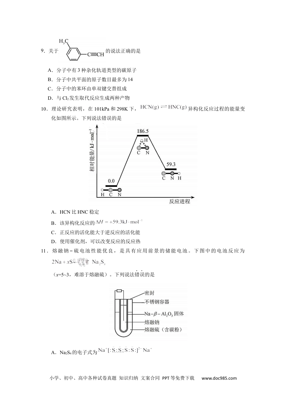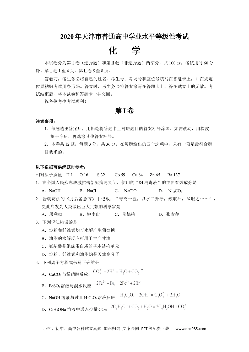 小学、初中、高中各种试卷真题知识归纳文案合同PPT等免费下载www.doc985.com2020年天津市普通高中学业水平等级性考试化学本试卷分为第Ⅰ卷(选择题)和第Ⅱ卷(非选择题)两部分,共100分,考试用时60分钟。第Ⅰ卷1至4页,第Ⅱ卷5至8页。答卷前,考生务必将自己的姓名、考生号、考场号和座位号填写在答题卡上,并在规定位置粘贴考试用条形码。答卷时,考生务必将答案涂写在答题卡上,答在试卷上的无效。考试结束后,将本试卷和答题卡一并交回。祝各位考生考试顺利!第I卷注意事项:1.每题选出答案后,用铅笔将答题卡上对应题目的答案标号涂黑。如需改动,用橡皮擦干净后,再选涂其他答案标号。2.本卷共12题,每题3分,共36分。在每题给出的四个选项中,只有一项是最符合题目要求的。以下数据可供解题时参考:相对原子质量:H1O16S32Co59Cu64Zn65Ba1371.在全国人民众志成城抗击新冠病毒期间,使用的“84消毒液”的主要有效成分是A.NaOHB.NaClC.NaClOD.Na2CO32.晋朝葛洪的《肘后备急方》中记载:“青蒿一握,以水二升渍,绞取汁,尽服之……”,受此启发为人类做出巨大贡献的科学家是A.屠呦呦B.钟南山C.侯德榜D.张青莲3.下列说法错误的是A.淀粉和纤维素均可水解产生葡萄糖B.油脂的水解反应可用于生产甘油C.氨基酸是组成蛋白质的基本结构单元D.淀粉、纤维素和油脂均是天然高分子4.下列离子方程式书写正确的是A.CaCO3与稀硝酸反应:B.FeSO4溶液与溴水反应:C.NaOH溶液与过量H2C2O4溶液反应:D.C6H5ONa溶液中通入少量CO2:小学、初中、高中各种试卷真题知识归纳文案合同PPT等免费下载www.doc985.com5.下列实验仪器或装置的选择正确的是配制50.00mL0.1000mol.L−1Na2CO3溶液除去Cl2中的HCl蒸馏用冷凝管盛装Na2SiO3溶液的试剂瓶ABCD6.检验下列物质所选用的试剂正确的是待检验物质所用试剂A海水中的碘元素淀粉溶液BSO2气体澄清石灰水C溶液中的Cu2+氨水D溶液中的NH4+NaOH溶液,湿润的蓝色石蕊试纸7.常温下,下列有关电解质溶液的说法错误的是A.相同浓度的HCOONa和NaF两溶液,前者的pH较大,则B.相同浓度的CH3COOH和CH3COONa两溶液等体积混合后pH约为4.7,则溶液中C.FeS溶于稀硫酸,而CuS不溶于稀硫酸,则D.在溶液中,8.短周期元素X、Y、Z、W的原子序数依次增大。用表中信息判断下列说法正确的是最高价元素氧化物的水化物XYZW分子式H3ZO4溶液对应的pH(25℃)1.0013.001.570.70A.元素电负性:Z<WB.简单离子半径:W<YC.元素第一电离能:Z<WD.简单氢化物的沸点:X<Z小学、初中、高中各种试卷真题知识归纳文案合同PPT等免费下载www.doc985.com9.关于的说法正确的是A.分子中有3种杂化轨道类型的碳原子B.分子中共平面的原子数目最多为14C.分子中的苯环由单双键交替组成D.与Cl2发生取代反应生成两种产物10.理论研究表明,在101kPa和298K下,异构化反应过程的能量变化如图所示。下列说法错误的是A.HCN比HNC稳定B.该异构化反应的C.正反应的活化能大于逆反应的活化能D.使用催化剂,可以改变反应的反应热11.熔融钠硫电池性能优良,是具有应用前景的储能电池。下图中的电池反应为−(x=5~3,难溶于熔融硫)。下列说法错误的是A.Na2S4的电子式为小学、初中、高中各种试卷真题知识归纳文案合同PPT等免费下载www.doc985.comB.放电时正极反应为C.Na和Na2Sx分别为电池的负极和正极D.该电池是以为隔膜的二次电池12.已知呈粉红色,呈蓝色,为无色。现将CoCl2溶于水,加入浓盐酸后,溶液由粉红色变为蓝色,存在以下平衡:用该溶液做实验,溶液的颜色变化如下:以下结论和解释正确的是A.等物质的量的和中σ键数之比为3:2B.由实验①可推知△H<0C.实验②是由于c(H2O)增大,导致平衡逆向移动D.由实验③可知配离子的稳定性:第Ⅱ卷注意事项:1.用黑色墨水的钢笔或签字笔将答案写在答题卡上。2.本卷共4题,共64分13.(15分)Fe、Co、Ni是三种重要的金属元素。回答下列问题:(1)Fe、Co、Ni在周期表中的位置为,基态Fe原子的电子排布式为。(2)CoO的面心立方晶胞如图1所示。设阿伏加德罗常数的值为NA,则CoO晶体的密度为gcm﹒−3:三种元素二价氧化物的晶胞...
