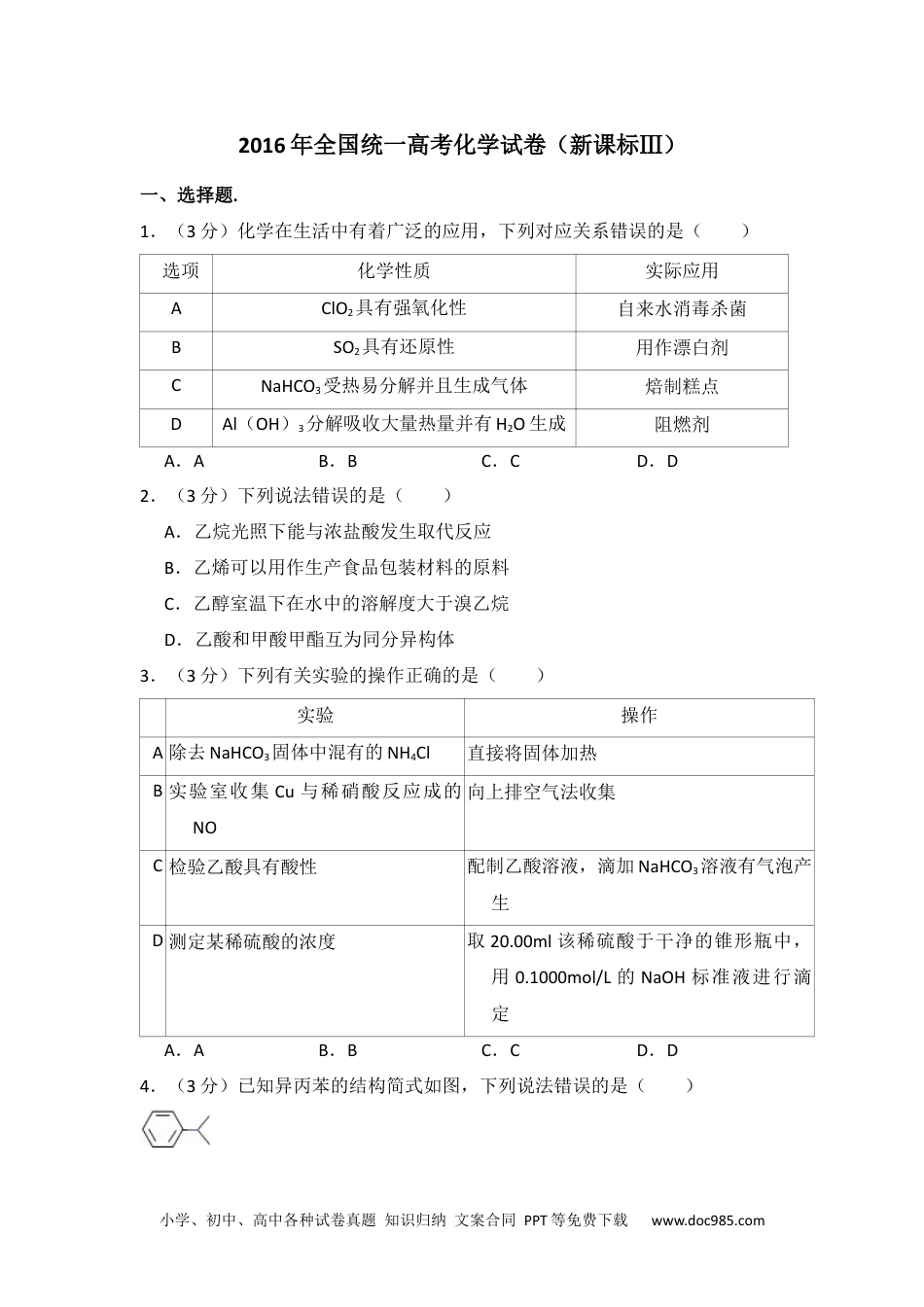 小学、初中、高中各种试卷真题知识归纳文案合同PPT等免费下载www.doc985.com2016年全国统一高考化学试卷(新课标Ⅲ)一、选择题.1.(3分)化学在生活中有着广泛的应用,下列对应关系错误的是()选项化学性质实际应用AClO2具有强氧化性自来水消毒杀菌BSO2具有还原性用作漂白剂CNaHCO3受热易分解并且生成气体焙制糕点DAl(OH)3分解吸收大量热量并有H2O生成阻燃剂A.AB.BC.CD.D2.(3分)下列说法错误的是()A.乙烷光照下能与浓盐酸发生取代反应B.乙烯可以用作生产食品包装材料的原料C.乙醇室温下在水中的溶解度大于溴乙烷D.乙酸和甲酸甲酯互为同分异构体3.(3分)下列有关实验的操作正确的是()实验操作A除去NaHCO3固体中混有的NH4Cl直接将固体加热B实验室收集Cu与稀硝酸反应成的NO向上排空气法收集C检验乙酸具有酸性配制乙酸溶液,滴加NaHCO3溶液有气泡产生D测定某稀硫酸的浓度取20.00ml该稀硫酸于干净的锥形瓶中,用0.1000mol/L的NaOH标准液进行滴定A.AB.BC.CD.D4.(3分)已知异丙苯的结构简式如图,下列说法错误的是()小学、初中、高中各种试卷真题知识归纳文案合同PPT等免费下载www.doc985.comA.异丙苯的分子式为C9H12B.异丙苯的沸点比苯高C.异丙苯中碳原子可能都处于同一平面D.异丙苯和苯为同系物5.(3分)锌﹣空气燃料电池可用作电动车动力电源,电池的电解质溶液为KOH溶液,反应为2Zn+O2+4OH﹣+2H2O═2Zn(OH)42﹣.下列说法正确的是()A.充电时,电解质溶液中K+向阳极移动B.充电时,电解质溶液中c(OH﹣)逐渐减小C.放电时,负极反应为:Zn+4OH﹣2e﹣﹣═Zn(OH)42﹣D.放电时,电路中通过2mol电子,消耗氧气22.4L(标准状况)6.(3分)四种短周期主族元素W、X、Y、Z的原子序数依次增大,W、X的简单离子具有相同电子层结构,X的原子半径是短周期主族元素原子中最大的,W与Y同族,Z与X形成的离子化合物的水溶液呈中性.下列说法正确的是()A.W与X形成的化合物溶于水后溶液呈碱性B.简单离子半径:W<X<ZC.气态氢化物的热稳定性:W<YD.最高价氧化物的水化物的酸性:Y>Z7.(3分)下列有关电解质溶液的说法正确的是()A.向0.1mol•L1﹣CH3COOH溶液中加入少量水,溶液中减小B.将CH3COONa溶液从20℃升温至30℃,溶液中增大C.向盐酸中加入氨水至中性,溶液中>1D.向AgCl、AgBr的饱和溶液中加入少量AgNO3,溶液中不变小学、初中、高中各种试卷真题知识归纳文案合同PPT等免费下载www.doc985.com二、解答题.8.过氧化钙微溶于水,溶于酸,可用作分析试剂、医用防腐剂、消毒剂.以下是一种制备过氧化钙的实验方法.回答下列问题:(一)碳酸钙的制备(1)步骤①加入氨水的目的是.小火煮沸的作用是使沉淀颗粒长大,有利于.(2)如图是某学生的过滤操作示意图,其操作不规范的是(填标号).a.漏斗末端颈尖未紧靠烧杯壁b.玻璃棒用作引流c.将滤纸湿润,使其紧贴漏斗壁d.滤纸边缘高出漏斗e.用玻璃棒在漏斗中轻轻搅动以加快过滤速度(二)过氧化钙的制备(3)步骤②的具体操作为逐滴加入稀盐酸,至溶液中尚存有少量固体,此时溶液呈性(填“酸”、“碱”或“中”).将溶液煮沸,趁热过滤,将溶液煮沸的作用是.(4)步骤③中反应的化学方程式为,该反应需要在冰浴下进行,原因是.小学、初中、高中各种试卷真题知识归纳文案合同PPT等免费下载www.doc985.com(5)将过滤得到的白色结晶依次使用蒸馏水、乙醇洗涤,使用乙醇洗涤的目的是.(6)制备过氧化钙的另一种方法是:将石灰石煅烧后,直接加入双氧水反应,过滤后可得到过氧化钙产品.该工艺方法的优点是,产品的缺点是.9.煤燃烧排放的烟含有SO2和NOx,形成酸雨、污染大气,采用NaClO2溶液作为吸收剂可同时对烟气进行脱硫、脱硝。回答下列问题:(1)NaClO2的化学名称为。(2)在鼓泡反应器中通入含SO2、NOx的烟气,反应温度323K,NaClO2溶液浓度为5×103﹣mol•L1﹣.反应一段时间后溶液中离子浓度的分析结果如表。离子SO42﹣SO32﹣NO3﹣NO2﹣Cl﹣c/(mol•L﹣1)8.35×104﹣6.87×106﹣1.5×104﹣1.2×105﹣3.4×103﹣①写出NaClO2溶液脱硝过程中主要反应的离子方程式。增加压强...