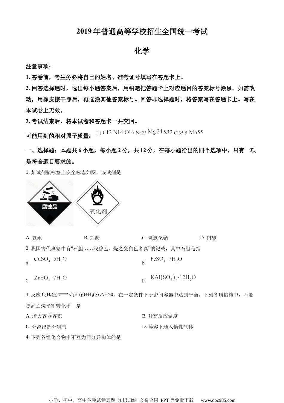 小学、初中、高中各种试卷真题知识归纳文案合同PPT等免费下载www.doc985.com2019年普通高等学校招生全国统一考试化学注意事项:1.答卷前,考生务必将自己的姓名、准考证号填写在答题卡上。2.回答选择题时,选出每小题答案后,用铅笔把答题卡上对应题目的答案标号涂黑。如需改动,用橡皮擦干净后,再选涂其他答案标号。回答非选择题时,将答案写在答题卡上。写在本试卷上无效。3.考试结束后,将本试卷和答题卡一并交回。可能用到的相对原子质量:一、选择题:本题共6小题,每小题2分,共12分,在每小题给出的四个选项中,只有一项是符合题目要求的。1.某试剂瓶标签上安全标志如图,该试剂是A.氨水B.乙酸C.氢氧化钠D.硝酸2.我国古代典籍中有“石胆……浅碧色,烧之变白色者真”的记载,其中石胆是指A.B.C.D.3.反应C2H6(g)C2H4(g)+H2(g)△H>0,在一定条件下于密闭容器中达到平衡。下列各项措施中,不能提高乙烷平衡转化率的是A.增大容器容积B.升高反应温度C.分离出部分氢气D.等容下通入惰性气体4.下列各组化合物中不互为同分异构体的是小学、初中、高中各种试卷真题知识归纳文案合同PPT等免费下载www.doc985.comA.B.C.D.5.根据图中的能量关系,可求得的键能为A.B.C.D.6.实验室通过称量样品受热脱水前后的质量来测定x值,下列情况会导致测定值偏低的是A.实验前试样未经干燥B.试样中含有少量碳酸氢铵C.试样中含有少量氯化钠D.加热过程中有试样迸溅出来二、选择题:本题共6小题,每小题4分,共24分。每小趣有一个或两个选项符合题意,若正确答案只包括一个选项,多选得0分;若正确答案包括两个选项,只选一个且正确得2分,选两个且都正确得4分,但只要选错一个就得0分。7.今年是门捷列夫发现元素周期律150周年,联合国将2019年定为“国际化学元素周期表年”。下列有关化学元素周期表的说法正确的是A.元素周期表共有18列B.VIIA族元素的非金属性自上而下依次减弱C.主族元素均呈现与其族数相同的最高化合价D.第二周期主族元素的原子半径自左向右依次增大小学、初中、高中各种试卷真题知识归纳文案合同PPT等免费下载www.doc985.com8.微型银-锌电池可用作电子仪器的电源,其电极分别是和,电解质为溶液,电池总反应为,下列说法正确的是A.电池工作过程中,溶液浓度降低B.电池工作过程中,电解液中向负极迁移C.负极发生反应D.正极发生反应9.一定温度下,AgCl(s)Ag+(aq)+Cl-(aq)体系中,c(Ag+)和c(Cl-)的关系如图所示。下列说法正确的是A.a、b、c三点对应的Ksp相等B.AgCl在c点的溶解度比b点的大C.AgCl溶于水形成的饱和溶液中,c(Ag+)=c(Cl-)D.b点的溶液中加入AgNO3固体,c(Ag+)沿曲线向c点方向变化10.下列说法正确的是A.和都属于两性氧化物B.悬浊液和乳浊液的分散质均为液态C.和中的金属都呈现两种价态D.葡萄糖溶液和淀粉溶液都具有丁达尔效应11.能正确表示下列反应的离子方程式为A.向FeBr2溶液中通入过量Cl2:2Fe2++Cl2=2Fe3++2Cl-B.向碳酸钠溶液中通入少量CO2:CO32-+CO2+H2O=2HCO3-C.向碘化钾溶液中加入少量双氧水:3H2O2+I-=IO3-+3H2OD.向硫化钠溶液中通入过量SO2:2S2-+5SO2+2H2O=3S↓+4HSO3-小学、初中、高中各种试卷真题知识归纳文案合同PPT等免费下载www.doc985.com12.下列化合物中,既能发生取代反应又能发生加成反应的有A.CH3-CH=CH2B.CH3CH2CH2OHC.D.三、非选择题:共4分。每个试题考生都必须作答。13.自门捷列夫发现元素周期律以来,人类对自然的认识程度逐步加深,元素周期表中的成员数目不断增加。回答下列问题:(1)2016年确认了四种新元素,其中一种为,中文名为“”。元素可由反应:+=+3得到。该元素的质子数为______,与互为_________。(2)位于元素周期表中第族,同族元素N的一种氢化物为NH2NH2,写出该化合物分子的电子式________________.该分子内存在的共价键类型有_______。(3)该族中的另一元素P能呈现多种化合价,其中价氧化物的分子式为______,价简单含氧酸的分子式为______。14.由羟基丁酸生成丁内酯的反应如下:HOCH2CH2CH2COOH+H2O在298K下,羟基丁酸水溶液的初始浓度为,测得丁内酯的浓度随时间变化的数据如表所示。回答下列问题:2150801001201602200.0240.0500.07...