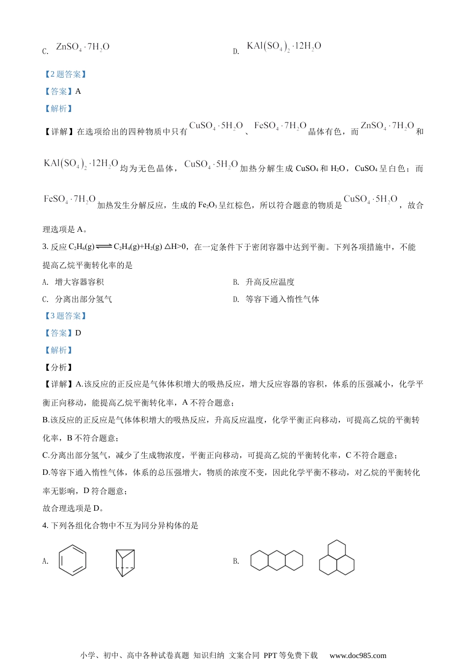 小学、初中、高中各种试卷真题知识归纳文案合同PPT等免费下载www.doc985.com2019年普通高等学校招生全国统一考试化学注意事项:1.答卷前,考生务必将自己的姓名、准考证号填写在答题卡上。2.回答选择题时,选出每小题答案后,用铅笔把答题卡上对应题目的答案标号涂黑。如需改动,用橡皮擦干净后,再选涂其他答案标号。回答非选择题时,将答案写在答题卡上。写在本试卷上无效。3.考试结束后,将本试卷和答题卡一并交回。可能用到的相对原子质量:一、选择题:本题共6小题,每小题2分,共12分,在每小题给出的四个选项中,只有一项是符合题目要求的。1.某试剂瓶标签上安全标志如图,该试剂是A.氨水B.乙酸C.氢氧化钠D.硝酸【1题答案】【答案】D【解析】【详解】A.氨水具有腐蚀性,但不具有氧化性,A不符合题意;B.乙酸具有腐蚀性,但不具有氧化性,B不符合题意;C.氢氧化钠具有腐蚀性,但不具有氧化性,C不符合题意;D.硝酸具有腐蚀性,同时具有氧化性,D符合题意;故合理选项是D。2.我国古代典籍中有“石胆……浅碧色,烧之变白色者真”的记载,其中石胆是指A.B.小学、初中、高中各种试卷真题知识归纳文案合同PPT等免费下载www.doc985.comC.D.【2题答案】【答案】A【解析】【详解】在选项给出的四种物质中只有、晶体有色,而和均为无色晶体,加热分解生成CuSO4和H2O,CuSO4呈白色;而加热发生分解反应,生成的Fe2O3呈红棕色,所以符合题意的物质是,故合理选项是A。3.反应C2H6(g)C2H4(g)+H2(g)△H>0,在一定条件下于密闭容器中达到平衡。下列各项措施中,不能提高乙烷平衡转化率的是A.增大容器容积B.升高反应温度C.分离出部分氢气D.等容下通入惰性气体【3题答案】【答案】D【解析】【分析】【详解】A.该反应的正反应是气体体积增大的吸热反应,增大反应容器的容积,体系的压强减小,化学平衡正向移动,能提高乙烷平衡转化率,A不符合题意;B.该反应的正反应是气体体积增大的吸热反应,升高反应温度,化学平衡正向移动,可提高乙烷的平衡转化率,B不符合题意;C.分离出部分氢气,减少了生成物浓度,平衡正向移动,可提高乙烷的平衡转化率,C不符合题意;D.等容下通入惰性气体,体系的总压强增大,物质的浓度不变,因此化学平衡不移动,对乙烷的平衡转化率无影响,D符合题意;故合理选项是D。4.下列各组化合物中不互为同分异构体的是A.B.小学、初中、高中各种试卷真题知识归纳文案合同PPT等免费下载www.doc985.comC.D.【4题答案】【答案】B【解析】【分析】【详解】A.二者分子式都是C6H6,分子式相同,结构不同,二者是同分异构体,A不符合题意;B.前者分子式是C14H24,后者分子式是C13H22,分子式不相同,二者不是同分异构体,B符合题意;C.前者分子式是C3H6O2,后者分子式是C3H6O2,分子式相同,结构不同,二者是同分异构体,C不符合题意;D.前者分子式是C6H6O3,后者分子式是C6H6O3,分子式相同,结构不同,二者是同分异构体,D不符合题意;故合理选项是B。5.根据图中的能量关系,可求得的键能为A.B.C.D.【5题答案】【答案】A【解析】【详解】根据图示可知1molCH4分解变为1molC(g)原子和4molH(g)原子共吸收的能量是(75+717+864)kJ=1656kJ的能量,则C-H键的键能为1656kJ÷4mol=414kJ/mol,故合理选项是A。6.实验室通过称量样品受热脱水前后的质量来测定x值,下列情况会导致测定值偏低的是小学、初中、高中各种试卷真题知识归纳文案合同PPT等免费下载www.doc985.comA.实验前试样未经干燥B.试样中含有少量碳酸氢铵C.试样中含有少量氯化钠D.加热过程中有试样迸溅出来【6题答案】【答案】C【解析】【详解】A.实验前试样未经干燥,加热后剩余固体质量偏少,导致结晶水含量偏高,A不符合题意;B.试样中含有少量碳酸氢铵,碳酸氢铵受热分解成氨气、二氧化碳和水,加热分解后剩余固体质量偏少,导致结晶水含量偏高,B不符合题意;C.试样中含有少量氯化钠,氯化钠受热不分解,加热分解后剩余固体质量偏大,导致结晶水的含量偏低,C符合题意;D.加热过程中有试样迸溅出来,加热分解后剩余固体质量偏少,会使结晶水的质量偏高,导致结晶水的含量偏高,D不符合题意;故合理选项是C。二、选择题:...