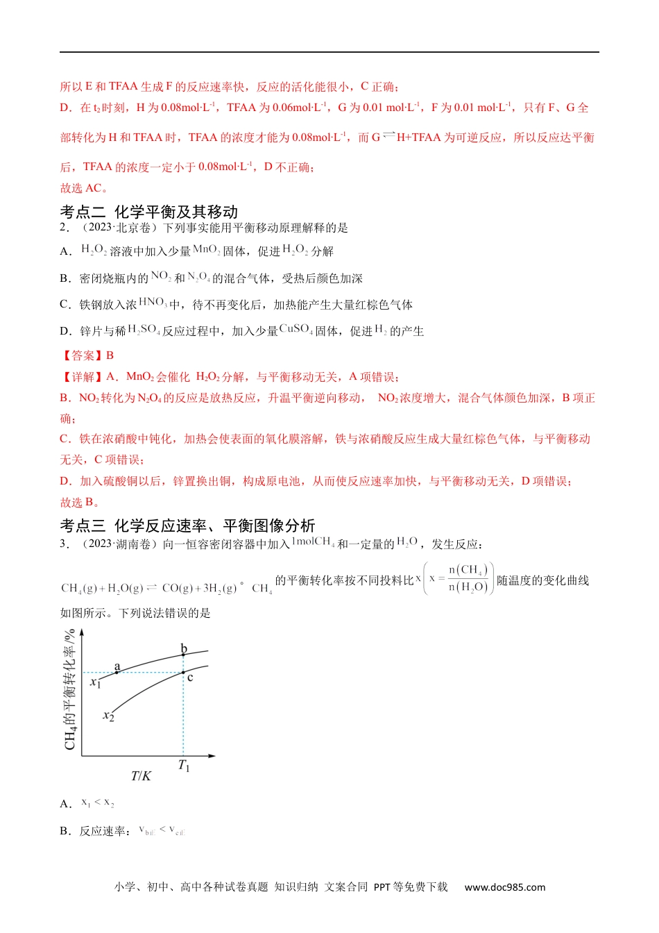 小学、初中、高中各种试卷真题知识归纳文案合同PPT等免费下载www.doc985.com五年(2019-2023)年高考真题分项汇编专题09化学反应速率与化学平衡〖2023年高考真题〗考点一化学反应速率计算与影响因素分析1.(2023·山东卷)一定条件下,化合物E和TFAA合成H的反应路径如下:已知反应初始E的浓度为0.10mol∙L-1,TFAA的浓度为0.08mol∙L-1,部分物种的浓度随时间的变化关系如图所示,忽略反应过程中的体积变化。下列说法正确的是A.t1时刻,体系中有E存在B.t2时刻,体系中无F存在C.E和TFAA反应生成F的活化能很小D.反应达平衡后,TFAA的浓度为0.08mol∙L-1【答案】AC【分析】一定条件下,化合物E和TFAA合成H的反应路径中,共发生三个反应:①E+TFAAF②FG③GH+TFAAt1之后的某时刻,H为0.02mol∙L-1,此时TFAA的浓度仍为0,则表明0.10mol∙L-1E、起始时的0.08mol∙L-1TFAA、G分解生成的0.02mol∙L-1TFAA全部参加反应,生成0.10mol∙L-1F;在t2时刻,H为0.08mol∙L-1,TFAA为0.06mol∙L-1,G为0.01mol∙L-1,则F为0.01mol∙L-1。【详解】A.t1时刻,H的浓度小于0.02mol∙L-1,此时反应③生成F的浓度小于0.02mol∙L-1,参加反应①的H的浓度小于0.1mol∙L-1,则参加反应E的浓度小于0.1mol∙L-1,所以体系中有E存在,A正确;B.由分析可知,t2时刻,H为0.08mol∙L-1,TFAA为0.06mol∙L-1,G为0.01mol∙L-1,则F为0.01mol∙L-1,所以体系中有F存在,B不正确;C.t1之后的某时刻,H为0.02mol∙L-1,此时TFAA的浓度仍为0,表明此时E和TFAA完全反应生成F,小学、初中、高中各种试卷真题知识归纳文案合同PPT等免费下载www.doc985.com所以E和TFAA生成F的反应速率快,反应的活化能很小,C正确;D.在t2时刻,H为0.08mol∙L-1,TFAA为0.06mol∙L-1,G为0.01mol∙L-1,F为0.01mol∙L-1,只有F、G全部转化为H和TFAA时,TFAA的浓度才能为0.08mol∙L-1,而GH+TFAA为可逆反应,所以反应达平衡后,TFAA的浓度一定小于0.08mol∙L-1,D不正确;故选AC。考点二化学平衡及其移动2.(2023·北京卷)下列事实能用平衡移动原理解释的是A.溶液中加入少量固体,促进分解B.密闭烧瓶内的和的混合气体,受热后颜色加深C.铁钢放入浓中,待不再变化后,加热能产生大量红棕色气体D.锌片与稀反应过程中,加入少量固体,促进的产生【答案】B【详解】A.MnO2会催化H2O2分解,与平衡移动无关,A项错误;B.NO2转化为N2O4的反应是放热反应,升温平衡逆向移动,NO2浓度增大,混合气体颜色加深,B项正确;C.铁在浓硝酸中钝化,加热会使表面的氧化膜溶解,铁与浓硝酸反应生成大量红棕色气体,与平衡移动无关,C项错误;D.加入硫酸铜以后,锌置换出铜,构成原电池,从而使反应速率加快,与平衡移动无关,D项错误;故选B。考点三化学反应速率、平衡图像分析3.(2023·湖南卷)向一恒容密闭容器中加入和一定量的,发生反应:。的平衡转化率按不同投料比随温度的变化曲线如图所示。下列说法错误的是A.B.反应速率:小学、初中、高中各种试卷真题知识归纳文案合同PPT等免费下载www.doc985.comC.点a、b、c对应的平衡常数:D.反应温度为,当容器内压强不变时,反应达到平衡状态【答案】B【详解】A.一定条件下,增大水的浓度,能提高CH4的转化率,即x值越小,CH4的转化率越大,则,故A正确;B.b点和c点温度相同,CH4的起始物质的量都为1mol,b点x值小于c点,则b点加水多,反应物浓度大,则反应速率:,故B错误;C.由图像可知,x一定时,温度升高CH4的平衡转化率增大,说明正反应为吸热反应,温度升高平衡正向移动,K增大;温度相同,K不变,则点a、b、c对应的平衡常数:,故C正确;D.该反应为气体分子数增大的反应,反应进行时压强发生改变,所以温度一定时,当容器内压强不变时,反应达到平衡状态,故D正确;答案选B。4.(2023·辽宁卷)一定条件下,酸性溶液与发生反应,(Ⅱ)起催化作用,过程中不同价态含粒子的浓度随时间变化如下图所示。下列说法正确的是A.(Ⅲ)不能氧化B.随着反应物浓度的减小,反应速率逐渐减小C.该条件下,(Ⅱ)和(Ⅶ)不能大量共存D.总反应为:【答案】C【分析】开始一段时间(大约13min前)...