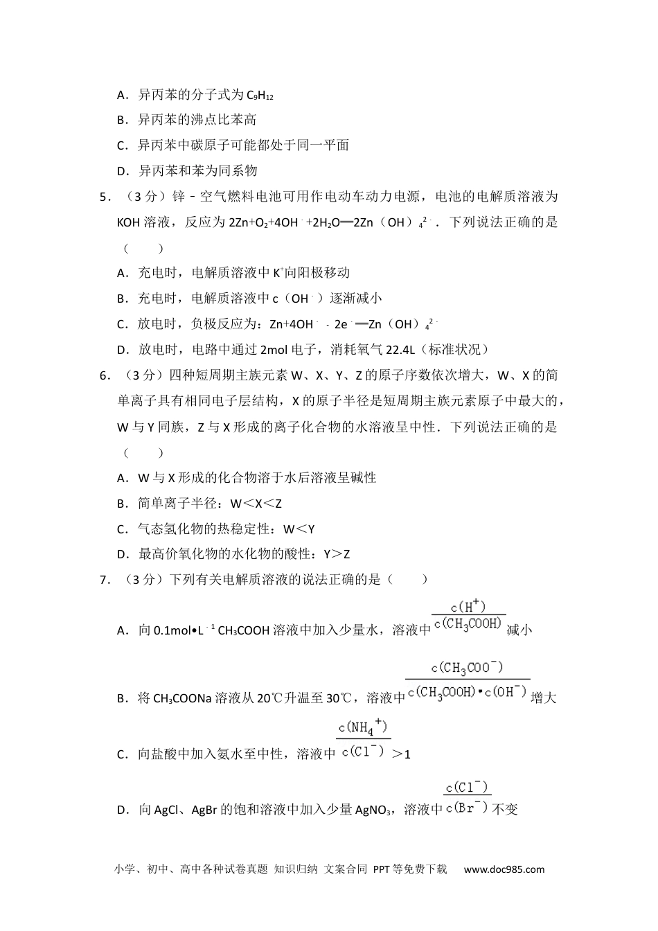 小学、初中、高中各种试卷真题知识归纳文案合同PPT等免费下载www.doc985.com2016年全国统一高考化学试卷(新课标Ⅲ)一、选择题.1.(3分)化学在生活中有着广泛的应用,下列对应关系错误的是()选项化学性质实际应用AClO2具有强氧化性自来水消毒杀菌BSO2具有还原性用作漂白剂CNaHCO3受热易分解并且生成气体焙制糕点DAl(OH)3分解吸收大量热量并有H2O生成阻燃剂A.AB.BC.CD.D2.(3分)下列说法错误的是()A.乙烷光照下能与浓盐酸发生取代反应B.乙烯可以用作生产食品包装材料的原料C.乙醇室温下在水中的溶解度大于溴乙烷D.乙酸和甲酸甲酯互为同分异构体3.(3分)下列有关实验的操作正确的是()实验操作A除去NaHCO3固体中混有的NH4Cl直接将固体加热B实验室收集Cu与稀硝酸反应成的NO向上排空气法收集C检验乙酸具有酸性配制乙酸溶液,滴加NaHCO3溶液有气泡产生D测定某稀硫酸的浓度取20.00ml该稀硫酸于干净的锥形瓶中,用0.1000mol/L的NaOH标准液进行滴定A.AB.BC.CD.D4.(3分)已知异丙苯的结构简式如图,下列说法错误的是()小学、初中、高中各种试卷真题知识归纳文案合同PPT等免费下载www.doc985.comA.异丙苯的分子式为C9H12B.异丙苯的沸点比苯高C.异丙苯中碳原子可能都处于同一平面D.异丙苯和苯为同系物5.(3分)锌﹣空气燃料电池可用作电动车动力电源,电池的电解质溶液为KOH溶液,反应为2Zn+O2+4OH﹣+2H2O═2Zn(OH)42﹣.下列说法正确的是()A.充电时,电解质溶液中K+向阳极移动B.充电时,电解质溶液中c(OH﹣)逐渐减小C.放电时,负极反应为:Zn+4OH﹣2e﹣﹣═Zn(OH)42﹣D.放电时,电路中通过2mol电子,消耗氧气22.4L(标准状况)6.(3分)四种短周期主族元素W、X、Y、Z的原子序数依次增大,W、X的简单离子具有相同电子层结构,X的原子半径是短周期主族元素原子中最大的,W与Y同族,Z与X形成的离子化合物的水溶液呈中性.下列说法正确的是()A.W与X形成的化合物溶于水后溶液呈碱性B.简单离子半径:W<X<ZC.气态氢化物的热稳定性:W<YD.最高价氧化物的水化物的酸性:Y>Z7.(3分)下列有关电解质溶液的说法正确的是()A.向0.1mol•L1﹣CH3COOH溶液中加入少量水,溶液中减小B.将CH3COONa溶液从20℃升温至30℃,溶液中增大C.向盐酸中加入氨水至中性,溶液中>1D.向AgCl、AgBr的饱和溶液中加入少量AgNO3,溶液中不变小学、初中、高中各种试卷真题知识归纳文案合同PPT等免费下载www.doc985.com二、解答题.8.过氧化钙微溶于水,溶于酸,可用作分析试剂、医用防腐剂、消毒剂.以下是一种制备过氧化钙的实验方法.回答下列问题:(一)碳酸钙的制备(1)步骤①加入氨水的目的是.小火煮沸的作用是使沉淀颗粒长大,有利于.(2)如图是某学生的过滤操作示意图,其操作不规范的是(填标号).a.漏斗末端颈尖未紧靠烧杯壁b.玻璃棒用作引流c.将滤纸湿润,使其紧贴漏斗壁d.滤纸边缘高出漏斗e.用玻璃棒在漏斗中轻轻搅动以加快过滤速度(二)过氧化钙的制备(3)步骤②的具体操作为逐滴加入稀盐酸,至溶液中尚存有少量固体,此时溶液呈性(填“酸”、“碱”或“中”).将溶液煮沸,趁热过滤,将溶液煮沸的作用是.(4)步骤③中反应的化学方程式为,该反应需要在冰浴下进行,原因是.小学、初中、高中各种试卷真题知识归纳文案合同PPT等免费下载www.doc985.com(5)将过滤得到的白色结晶依次使用蒸馏水、乙醇洗涤,使用乙醇洗涤的目的是.(6)制备过氧化钙的另一种方法是:将石灰石煅烧后,直接加入双氧水反应,过滤后可得到过氧化钙产品.该工艺方法的优点是,产品的缺点是.9.煤燃烧排放的烟含有SO2和NOx,形成酸雨、污染大气,采用NaClO2溶液作为吸收剂可同时对烟气进行脱硫、脱硝。回答下列问题:(1)NaClO2的化学名称为。(2)在鼓泡反应器中通入含SO2、NOx的烟气,反应温度323K,NaClO2溶液浓度为5×103﹣mol•L1﹣.反应一段时间后溶液中离子浓度的分析结果如表。离子SO42﹣SO32﹣NO3﹣NO2﹣Cl﹣c/(mol•L﹣1)8.35×104﹣6.87×106﹣1.5×104﹣1.2×105﹣3.4×103﹣①写出NaClO2溶液脱硝过程中主要反应的离子方程式。增加压强...