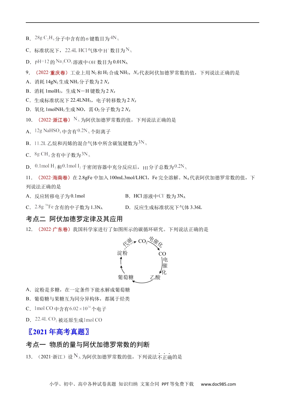 小学、初中、高中各种试卷真题知识归纳文案合同PPT等免费下载www.doc985.com五年(2019-2023)年高考真题分项汇编专题02化学计量〖2023年高考真题〗考点一物质的量与阿伏加德罗常数的判断1.(2023·全国甲卷)为阿伏加德罗常数的值。下列叙述正确的是A.异丁烷分子中共价键的数目为B.标准状况下,中电子的数目为C.的溶液中的数目为D.的溶液中的数目为2.(2023·辽宁卷)我国古代四大发明之一黑火药的爆炸反应为:。设为阿伏加德罗常数的值,下列说法正确的是A.含键数目为B.每生成转移电子数目为C.晶体中含离子数目为D.溶液中含数目为3.(2023·浙江卷)NA为阿伏加德罗常数的值,下列说法正确的是A.4.4gC2H4O中含有σ键数目最多为0.7NAB.1.7gH2O2中含有氧原子数为0.2NAC.向1L0.1mol/LCH3COOH溶液通氨气至中性,铵根离子数为0.1NAD.标准状况下,11.2LCl2通入水中,溶液中氯离子数为0.5NA4.(2023·湖北卷)工业制备高纯硅的主要过程如下:石英砂粗硅高纯硅下列说法错误的是A.制备粗硅的反应方程式为B.1molSi含Si-Si键的数目约为C.原料气HCl和应充分去除水和氧气D.生成的反应为熵减过程考点二物质的量浓度小学、初中、高中各种试卷真题知识归纳文案合同PPT等免费下载www.doc985.com5.(2023·山东卷)一定条件下,乙酸酐醇解反应可进行完全,利用此反应定量测定有机醇中的羟基含量,实验过程中酯的水解可忽略。实验步骤如下:①配制一定浓度的乙酸酐-苯溶液。②量取一定体积乙酸酐-苯溶液置于锥形瓶中,加入样品,充分反应后,加适量水使剩余乙酸酐完全水解:。③加指示剂并用甲醇标准溶液滴定至终点,消耗标准溶液。④在相同条件下,量取相同体积的乙酸酐-苯溶液,只加适量水使乙酸酐完全水解;加指示剂并用甲醇标准溶液滴定至终点,消耗标准溶液。样品中羟基含量(质量分数)计算正确的是A.B.C.D.〖2022年高考真题〗考点一物质的量与阿伏加德罗常数的判断6.(2022·全国甲卷)为阿伏加德罗常数的值,下列说法正确的是()A.,下,氢气中质子的数目为B.溶液中,的数目为C.苯甲酸完全燃烧,生成的数目为D.电解熔融,阴极增重,外电路中通过电子的数目为7.(2022·福建卷)常温常压下,电化学还原制氨气的总反应方程式:,设为阿伏加德罗常数的值,下列说法正确的是A.水中含有的孤电子对数为B.每产生失去的电子数为C.氨水中,含有的分子数少于D.消耗(已折算为标况)时,产生的分子数为8.(2022·辽宁卷)设为阿伏加德罗常数的值。下列说法正确的是A.中含有的中子数为AN25℃101kPa28LA2.5N132.0L1.0molLlAlC3AlA2.0N0.20mol2COA1.4N2CuCl6.4gA0.10N小学、初中、高中各种试卷真题知识归纳文案合同PPT等免费下载www.doc985.comB.分子中含有的键数目为C.标准状况下,气体中数目为D.的溶液中数目为0.01NA9.(2022·重庆卷)工业上用N2和H2合成NH3,NA代表阿伏加德罗常数的值,下列说法正确的是A.消耗14gN2生成NH3分子数为2NAB.消耗1molH2,生成N-H键数为2NAC.生成标准状况下22.4LNH3,电子转移数为2NAD.氧化1molNH3生成NO,需O2分子数为2NA10.(2022·浙江卷)为阿伏加德罗常数的值,下列说法正确的是A.中含有个阳离子B.乙烷和丙烯的混合气体中所含碳氢键数为C.含有中子数为D.和于密闭容器中充分反应后,分子总数为11.(2022·海南卷)在2.8gFe中加入100mL3mol/LHCl,Fe完全溶解。NA代表阿伏加德罗常数的值,下列说法正确的是A.反应转移电子为0.1molB.HCl溶液中数为3NAC.含有的中子数为1.3NAD.反应生成标准状况下气体3.36L考点二阿伏加德罗定律及其应用12.(2022·广东卷)我国科学家进行了如图所示的碳循环研究。下列说法正确的是A.淀粉是多糖,在一定条件下能水解成葡萄糖B.葡萄糖与果糖互为同分异构体,都属于烃类C.中含有个电子D.被还原生成〖2021年高考真题〗考点一物质的量与阿伏加德罗常数的判断13.(2021·浙江)设为阿伏加德罗常数的值,下列说法不正确的是小学、初中、高中各种试卷真题知识归纳文案合同PPT等免费下载www.doc985.comA.标准状况下,中含有中子数为B.(分子结构:)中的共价键数目为C.的水溶液中...