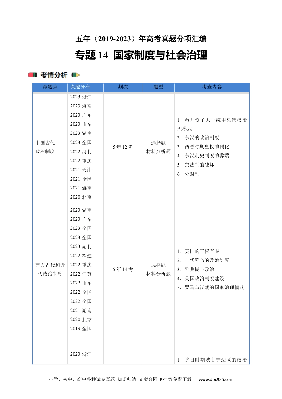小学、初中、高中各种试卷真题知识归纳文案合同PPT等免费下载www.doc985.com五年(2019-2023)年高考真题分项汇编专题14国家制度与社会治理命题点真题分布频次题型考查内容中国古代政治制度2023·浙江2023·海南2023·广东2023·山东2023·湖南2023·全国2022·河北2022·重庆2021·天津2021·全国2021·海南2020·北京5年12考选择题材料分析题1.秦开创了大一统中央集权治理模式2.东汉的政治制度3.两晋时期皇权的弱化4.东汉刺史制度的弊端5.宗法制的破坏6.分封制西方古代和近代政治制度2023·湖南2023·广东2023·全国2023·全国2023·湖北2022·福建2022·重庆2022·江苏2022·山东2022·全国2022·全国2021·湖南2020·北京2019·全国5年14考选择题材料分析题1、英国的王权有限2、古代罗马的政治制度3、雅典民主政治4、美国政治制度建设5、罗马与汉朝的国家治理模式2023·浙江1.抗日时期陕甘宁边区的政治小学、初中、高中各种试卷真题知识归纳文案合同PPT等免费下载www.doc985.com中国近代至当代政治制度2023·全国2023·全国2022·福建2022·江苏2022·湖南2022·辽宁2021·湖南5年8考选择题材料分析题建设2.解放区的人民代表选举建设中国历代变法改革2023·全国2022·福建2022·全国2022·河北2021·湖北2021·江苏2020·北京2020·山东2020·全国2019·江苏5年10考选择题材料分析题1.戊戌变法2.王安石变法3.商鞅变法官员选拔与管理2023·湖北2023·浙江2023·浙江2023·湖北2022·江苏2022·山东2022·辽宁2022·河北2022·天津2021·海南5年10考选择题材料分析题1.明代科举制度2.魏晋选官制度3.宋代军事人才与选拔制度4.监察制度5.西方文官制度6.晚清选官制度7.汉代官员考核法律和教化2023·广东2023·浙江2022·海南2022·北京2022·天津2022·天津2020·海南2020·北京2020·北京5年11考选择题材料分析题1,中国法律建设过程2.唐朝和宋朝的乡约与教化3.共和国的精神文明建设4.唐朝和清朝的法律5.共和国的法律建设6.英国的法律建设小学、初中、高中各种试卷真题知识归纳文案合同PPT等免费下载www.doc985.com2020·天津2019·海南中国的民族关系和对外交往2023·浙江2023·湖南2023·全国2021·重庆2021·北京2021·全国5年6考选择题材料分析题1.隋唐时期的民族关系2.晚清近代外交3.清朝的民族关系4.共和国的民族政策5.共和国的外贸政策近代西方民族国家与国际法的发展2023·浙江2023·山东2023·湖南2023·全国2023·浙江2022·河北2022·北京5年7考选择题材料分析题1.《战争与和平法》2.近代国际法体系货币与赋税制度2023·浙江2023·浙江2023·浙江2023·湖南2022·湖北2022·北京2021·辽宁2021·海南2021·湖北2020·海南2020·全国5年11考选择题材料分析题1.明代的货币2.隋代赋税制度3.唐代税制改革4.唐代货币5.晚清赋税与财政6.近代中国的货币政策7.两宋与晚清时期的财税体制与国家治理基层治理与社会保障2023·广东2023·山东2022·福建2022·海南2021·湖北2022·全国2020·天津2020·天津2019·北京5年9考选择题材料分析题1.宋代基层治理2.清代基层社会治理3.共和国的社会保障建设4.明代社会治理5.共和国城市基层管理体制6.中国古代的基层治理7.德国的济贫法小学、初中、高中各种试卷真题知识归纳文案合同PPT等免费下载www.doc985.com1.春秋战国时期,“天下共苦战斗不休”。秦国远交近攻,各个击破,相继灭掉六国,进而开创了“海内为郡县”“天下之事无小大皆决于上”的局面,这表明()A.分封制度的终结B.大一统中央集权国家治理的基本模式形成C.宗法制度的湮灭D.中华文明起源到早期国家形成的重大转变【来源】2023·浙江·统考高考真题2.据东汉《乙瑛碑》载,鲁相乙瑛向朝廷陈请,为孔庙增设一名百石卒史来守庙并掌管礼器(流程如下图)。这一史实最适合用来说明,当时()(注:①—⑦表示处理此事的先后步骤)A.国家行政中枢权力的逐渐扩大B.专制主义中央集权的日益巩固C.传统社会道德秩序的渐趋规范D.封建国家不同职能的有效履行【来源】2023·海南·统考高考真题3.两晋时期参预中央决策的官员出身统计表朝代高门士族占比宗室、外戚占比寒人占比...