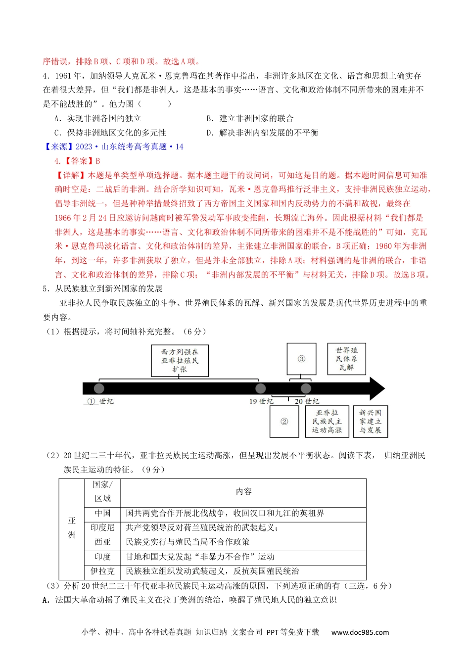 小学、初中、高中各种试卷真题知识归纳文案合同PPT等免费下载www.doc985.com五年(2019-2023)年高考真题分项汇编专题11世界殖民体系与亚非拉民族民主运动命题点真题分布频次题型资本主义世界殖民体系的形成、瓦解2023·山东高考·122022·海南高考·122021·福建高考·145年3考选择题3分1.殖民体系的形成与演变亚非拉民族民主运动2023·北京高考·142023·海南统考高考真题·132023·山东统考高考真题·142022·山东高考·135年7考选择题3分1.墨西哥的民族民主运动2.二战后的民族民主运动3.从民族独立到新兴国家的发展4.新兴国家面临的机遇与挑战5.19世纪末20世纪初的亚洲觉醒6.拉丁美洲与欧洲2023·上海高考·2题2023·广东统考高考真题·182022·北京高考·18题材料分析题论述题25分14分12分1.墨西哥在1821年独立后,以阿兹特克帝国的继承者自居。墨西哥土生白人将阿兹特克人视为祖先,将阿兹特克人的末代皇帝视为抵抗西班牙殖民者的民族英雄。这些做法意在()A.打击英法在拉美的殖民统治B.深化民族意识和国家观念C.推动墨西哥的民族独立运动D.重建阿兹特克帝国的文明【来源】2023·北京高考·141.【答案】B【解析】本题以“墨西哥的土生白人宣传阿兹特克帝国”切入,考察“拉丁美洲文化”。依据基本史实推论,此种举措为了保护本民族的文化,对抗西方的侵略,深化新国家的民族意识和国家观念。依据材料及基本史实,1821年,墨西哥打败了西班牙殖民者并赢得了民族独立。故而排除A项。依据材料及基本史实,1821年,墨西哥获得了民族独立。。故而排除C项。依据材料及基本史实,独立后的墨西哥是一个土生白小学、初中、高中各种试卷真题知识归纳文案合同PPT等免费下载www.doc985.com人领导的共和国,不可能重建印第安人建立的阿兹特克帝国文明。故而排除D项。2.图4为某一时期欧洲主要殖民国家在美洲和非洲的殖民地分布示意图。这一时期()图4A.拉丁美洲民族独立运动兴起B.大西洋三角贸易已走向衰落C.西、葡殖民优势逐渐被打破D.倾销工业品是主要掠夺手段【来源】2023·山东高考·122.【答案】C【解析】【详解】本题是单类型单项选择题。据本题主题干的设问词,可知这是本质题。据本题时间信息可知准确时空是:近代(世界)。根据题中图例发现此时期在美洲的殖民国家除了西班牙、葡萄牙之外还有英国、荷兰、法国等殖民国家,且英国、法国、荷兰的殖民地面积较之教材中第12课“拉丁美洲的殖民地化”一目中的插图的面积变大了,说明此时期西班牙、葡萄牙在拉丁美洲的殖民优势逐渐被打破,C项正确;材料信息强调有欧洲主要殖民国家在拉丁美洲和非洲所占殖民地情况,并非强调拉丁美洲的民族独立运动,排除A项;题干信息与三角贸易无关,排除B项;材料信息不能反映掠夺手段,排除D项。故选C项。3.将下列内容按历史发展逻辑排序,正确的一组是()①尼赫鲁认为:“我们正在努力建立一种新型的社会主义——一种共产主义和资本主义国家正统实践之间的中间道路”,“社会主义是达到目的的手段,而不是目的本身”。②丘吉尔表示,他不愿充当“为英帝国敲丧钟的首相”。③二战时期,在英国驱使下,坦噶尼喀农作物种植单一,导致该地区中部土壤退化。④在夕阳残照下,最后一批英军降下了英国国旗,撤离了占领长达74年之久的苏伊士运河区。A.③②④①B.②③①④C.①③②④D.③④②①【来源】2023·海南统考高考真题·133.【答案】A【详解】本题是组合选择题。时空是:二战时期至1956年(世界)。根据材料信息结合所学知识可知,①1956年12月开始,国大党政府在国内开展了大规模的所谓“社会主义运动”;②二战结束后,随着英国的逐渐衰落,丘吉尔表示,他不愿充当“为英帝国敲丧钟的首相”。③二战时期,在英国驱使下,坦噶尼喀农作物种植单一,导致该地区中部土壤退化。④1956年6月13日,最后一批英国军队撤离占领了74年之久的苏伊士运河区。综上所述,按照历史发展的顺序排序,③②④①符合题意,A项正确;其他选项排小学、初中、高中各种试卷真题知识归纳文案合同PPT等免费下载www.doc985.com序错误,排除B项、C项和D项。故选A项。4.1961年,加纳领导人克瓦米·恩克鲁玛在其...