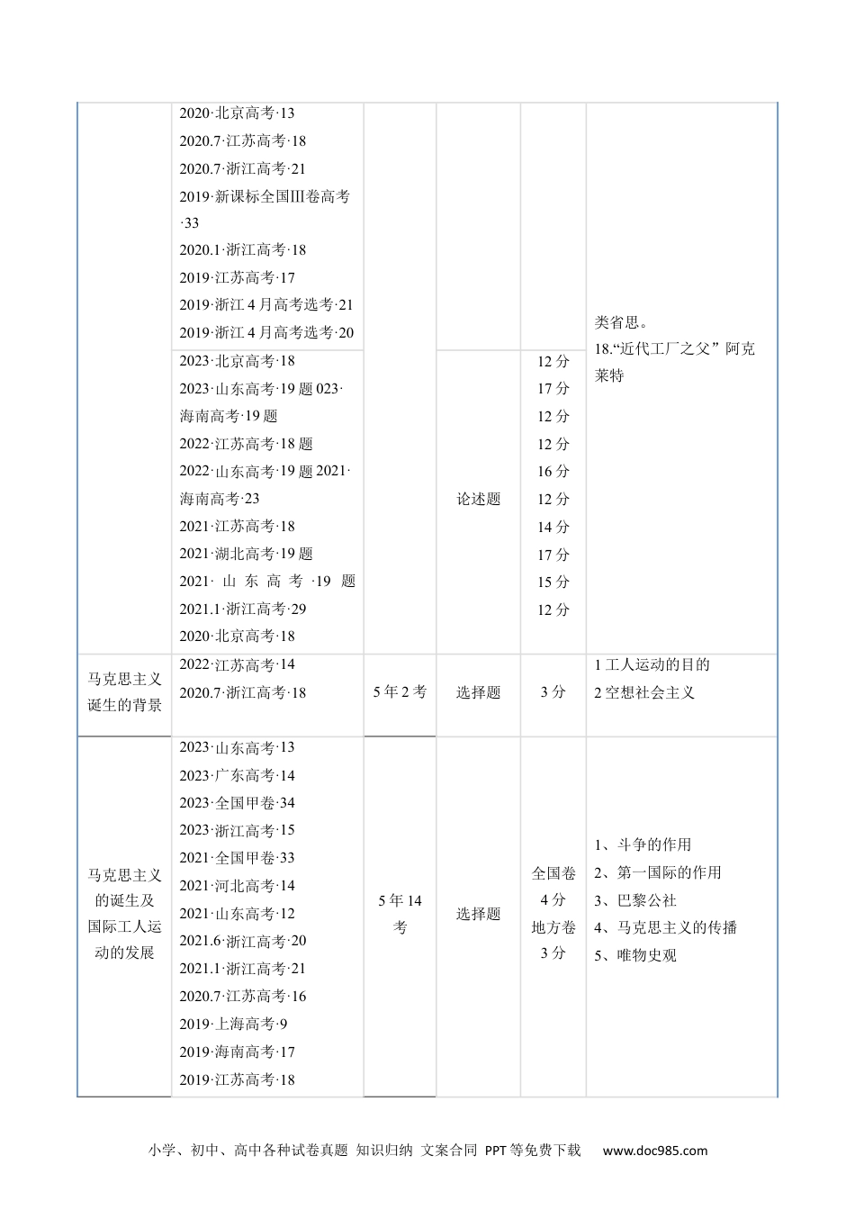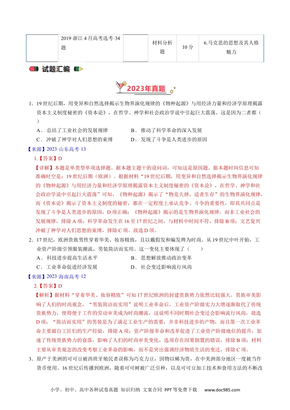 小学、初中、高中各种试卷真题知识归纳文案合同PPT等免费下载www.doc985.com五年(2019-2023)年高考真题分项汇编专题10工业革命与马克思主义的诞生命题点真题分布频次题型分值考查内容工业革命的背景2021·北京高考·122019·新课标全国Ⅰ卷高考·345年3考选择题全国卷4分地方卷3分1、科技科学社团的发展2.政治环境对工业发展的影响2023·广东高考·20材料分析题14分工业革命的成果及其影响2023·海南高考·112023·海南高考·122023·湖北高考·132023·全国甲卷·332022·全国乙卷·342023·海南高考·152022·全国甲卷·342022·重庆高考·142022·辽宁高考·142022·广东高考·132022.6·浙江高考·202022.1·浙江高考·192021·海南高考·162021·江苏高考·152021·湖北高考·132021·天津高考·122021·湖南高考·142021.6·浙江高考·242021.6·浙江高考·182021.1·浙江高考·202021.1·浙江高考·182020·新课标全国Ⅰ卷高考·345年41考选择题全国卷4分地方卷3分1.工业革命的影响2.现实主义文学的特点3.德国的崛起4.世界经济中心的转移5.垄断资本6.科学与技术的紧密结合7.自由主义8.工厂制9.欧洲的现代化10.1924年英国举办博览会11.文学艺术与时代发展的关系12.1830-2010世界经济论述13.1850前后世界文明的发展14.19世纪50-70年代东西方的历史发展进程15.工业革命加强了世界市场的联系16.科研组织与技术进步17.科学引领发展,技术助力生活,科技史亟需全人小学、初中、高中各种试卷真题知识归纳文案合同PPT等免费下载www.doc985.com2020·北京高考·132020.7·江苏高考·182020.7·浙江高考·212019·新课标全国Ⅲ卷高考·332020.1·浙江高考·182019·江苏高考·172019·浙江4月高考选考·212019·浙江4月高考选考·20类省思。18.“近代工厂之父”阿克莱特2023·北京高考·182023·山东高考·19题023·海南高考·19题2022·江苏高考·18题2022·山东高考·19题2021·海南高考·232021·江苏高考·182021·湖北高考·19题2021·山东高考·19题2021.1·浙江高考·292020·北京高考·18论述题12分17分12分12分16分12分14分17分15分12分马克思主义诞生的背景2022·江苏高考·142020.7·浙江高考·185年2考选择题3分1工人运动的目的2空想社会主义马克思主义的诞生及国际工人运动的发展2023·山东高考·132023·广东高考·142023·全国甲卷·342023·浙江高考·152021·全国甲卷·332021·河北高考·142021·山东高考·122021.6·浙江高考·202021.1·浙江高考·212020.7·江苏高考·162019·上海高考·92019·海南高考·172019·江苏高考·185年14考选择题全国卷4分地方卷3分1、斗争的作用2、第一国际的作用3、巴黎公社4、马克思主义的传播5、唯物史观小学、初中、高中各种试卷真题知识归纳文案合同PPT等免费下载www.doc985.com2019·浙江4月高考选考·34题材料分析题10分6.马克思的思想及其人格魅力1.19世纪后期,用变异和自然选择揭示生物界演化规律的《物种起源》与用经济力量和经济学原理揭露资本主义制度秘密的《资本论》,在哲学、神学和社会政治学说中引起巨大震荡。这是因为二者都()A.总结了工业社会的发展规律B.推动了科学革命的深入发展C.冲破了神学对人们思想的束缚D.发现了斗争是人类进步的原因【来源】2023·山东高考·131.【答案】D【详解】本题是单类型单项选择题。据本题主题干的设问词,可知这是原因题。据本题时间信息可知准确时空是:19世纪后期(欧洲)。根据材料“19世纪后期,用变异和自然选择揭示生物界演化规律的《物种起源》与用经济力量和经济学原理揭露资本主义制度秘密的《资本论》,在哲学、神学和社会政治学说中引起巨大震荡”可知,《物种起源》揭示了“物竞天择,适者生存”的生物界演化规律,而《资本论》揭示了资本主义制度的秘密,都在一定程度上承认竞争、斗争的重要性,即其共同点是发现了斗争是人类进步的原因,D项正确;《物种起源》揭示的是生物界演化规律,而非工业社会的发展规律,排除A项;科学革命发生在16至17世纪之间,与材料中时间不符,排除B项;文艺复兴冲破了神学对人们思想的束缚,排除C项。故选D项。2.17世纪...