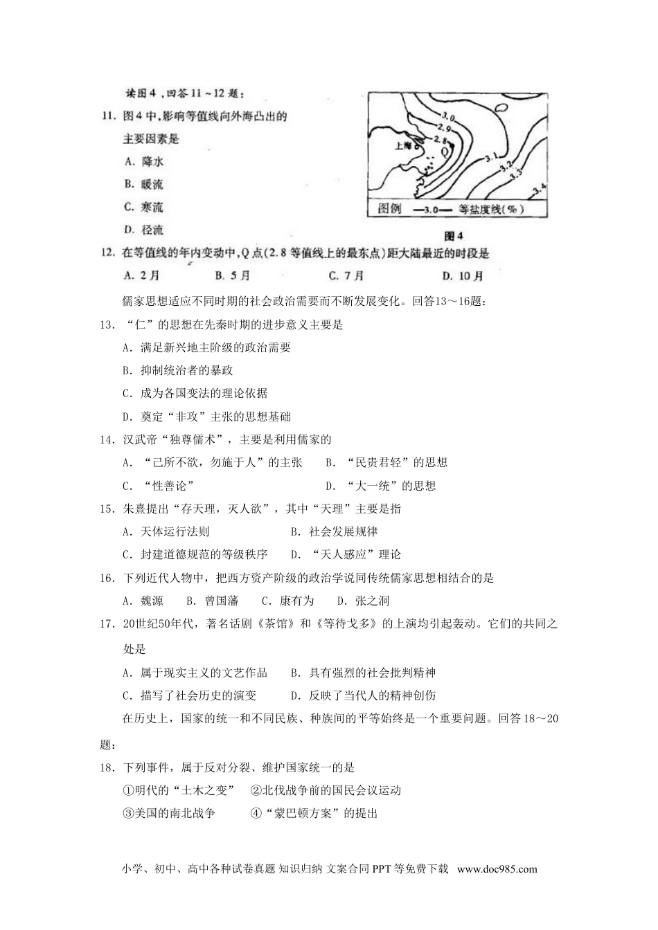 2002年天津高考文科综合真题及答案小学、初中、高中各种试卷真题知识归纳文案合同PPT等免费下载www.doc985.com小学、初中、高中各种试卷真题知识归纳文案合同PPT等免费下载www.doc985.com儒家思想适应不同时期的社会政治需要而不断发展变化。回答13~16题:13.“仁”的思想在先秦时期的进步意义主要是A.满足新兴地主阶级的政治需要B.抑制统治者的暴政C.成为各国变法的理论依据D.奠定“非攻”主张的思想基础14.汉武帝“独尊儒术”,主要是利用儒家的A.“己所不欲,勿施于人”的主张B.“民贵君轻”的思想C.“性善论”D.“大一统”的思想15.朱熹提出“存天理,灭人欲”,其中“天理”主要是指A.天体运行法则B.社会发展规律C.封建道德规范的等级秩序D.“天人感应”理论16.下列近代人物中,把西方资产阶级的政治学说同传统儒家思想相结合的是A.魏源B.曾国藩C.康有为D.张之洞17.20世纪50年代,著名话剧《茶馆》和《等待戈多》的上演均引起轰动。它们的共同之处是A.属于现实主义的文艺作品B.具有强烈的社会批判精神C.描写了社会历史的演变D.反映了当代人的精神创伤在历史上,国家的统一和不同民族、种族间的平等始终是一个重要问题。回答18~20题:18.下列事件,属于反对分裂、维护国家统一的是①明代的“土木之变”②北伐战争前的国民会议运动③美国的南北战争④“蒙巴顿方案”的提出小学、初中、高中各种试卷真题知识归纳文案合同PPT等免费下载www.doc985.comA.①③B.②③C.②④D.③④19.与德意志统一相比,19世纪意大利统一的不同之处是A.先统一北方,再统一全国B.通过战争完成统一大业C.为经济发展创造了良好条件D.结束了异族压迫局面20.把反对种族歧视作为重要内容的会议是A.万隆会议B.布雷顿森林会议C.德黑兰会议D.洛迦诺会议近现代的工业革命和科技革命极大地改变了人类社会的面貌。回答21~25题:21.下列关于第一次工业革命的叙述,不正确的是A.它开始于英国,18世纪末向外扩展B.一些国家的工业革命主要是靠从英国引进技术进行的C.它使各国迅速实现工业化D.英国由此成为“世界工厂”22.与第一次工业革命相比,第二次工业革命的特点是①主要发生在基础工业和重工业领域②科技含量大为提高③推动垄断资本主义的形成④确立了资本主义在世界的统治A.①②③B.①②④C.①③④D.②③④23.与欧美相比,日本工业革命的不同之处在于①由国家主导进行②两次工业革命交叉完成③国营企业比例不断增大④基本清除了生产关系中的封建因素A.①②B.①③C.②③D.②④24.第三次科技革命使社会经济结构发生深刻变化,这表现在A.卡特尔、辛迪加和托拉斯开始形成B.直接物质生产部门在国民经济中的比重下降C.劳动密集型产业大幅度增加D.社会分裂为两大对立阶级25.经过20多年的努力,我国已经成为世界重要的制造业大国。加入WTO后,我国制造业的结构调整进一步加快,这主要是为了A.促进产业结构升级,提高竞争力B.扩大对外开放,吸引外资C.加强基础设施建设,增加收人D.加速第三产业发展,增加就业小学、初中、高中各种试卷真题知识归纳文案合同PPT等免费下载www.doc985.com小学、初中、高中各种试卷真题知识归纳文案合同PPT等免费下载www.doc985.com小学、初中、高中各种试卷真题知识归纳文案合同PPT等免费下载www.doc985.com小学、初中、高中各种试卷真题知识归纳文案合同PPT等免费下载www.doc985.com小学、初中、高中各种试卷真题知识归纳文案合同PPT等免费下载www.doc985.com38.阅读下列材料:材料一:为保全俄国水师在中国北方海岸得有足为可恃之地,大清国大皇帝允将旅顺口、大连湾暨附近水面租与俄国,……在俄国所租之地以及附近海面,所有调度水陆各军,并治理地方大交,全归俄官……小学、初中、高中各种试卷真题知识归纳文案合同PPT等免费下载www.doc985.com--中俄《旅大租地条约》(189年3月)材料二:(俄国政府)将旅顺口、大连湾并其附近领土领水之租借权内……一切权利及所让与者,转移与日本政府……--日俄《朴茨茅斯条约》(1905年9月)材料三:苏美英三大国领袖同意,……大连商港须国际化,苏联在该港的优越权益须...