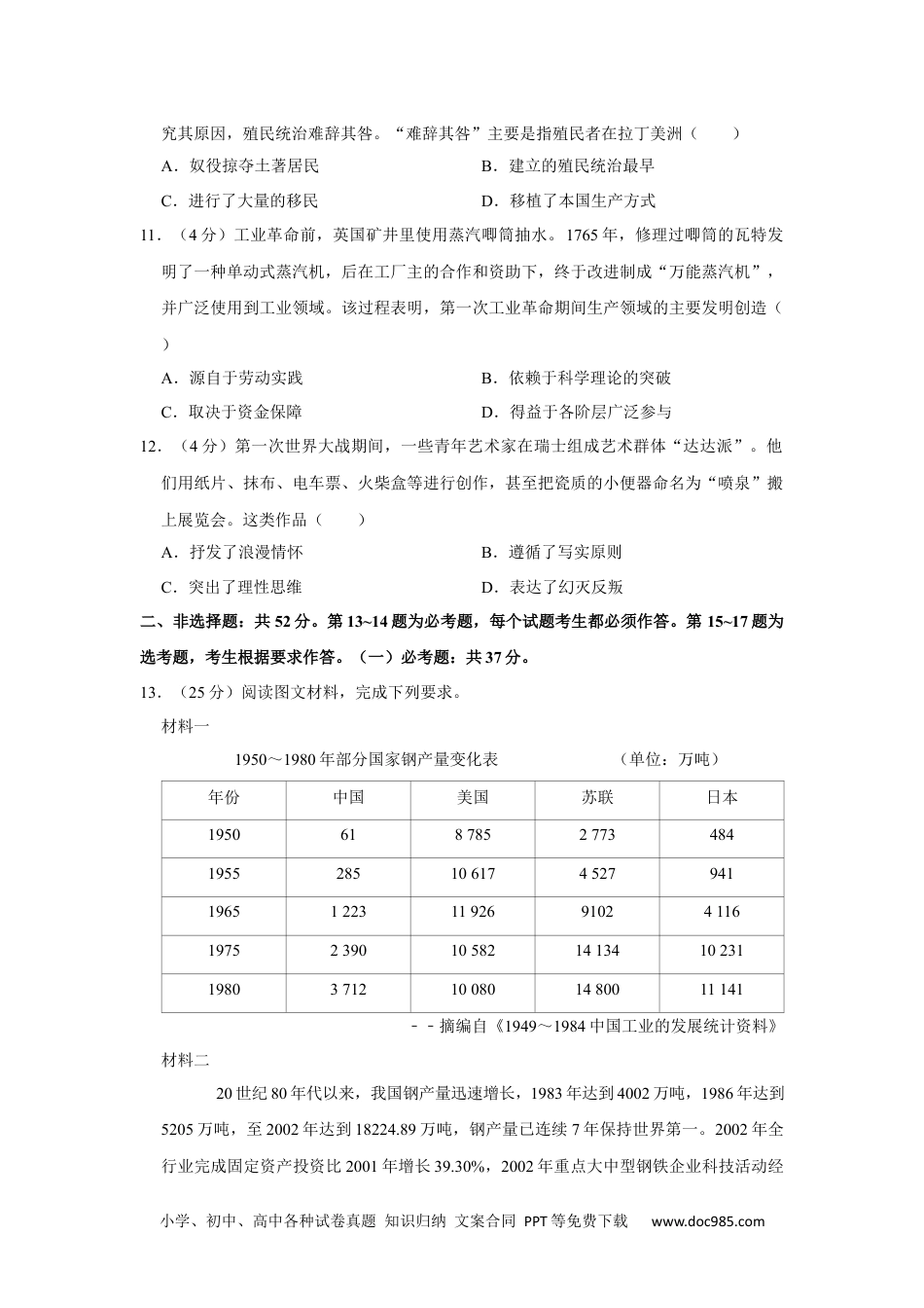 小学、初中、高中各种试卷真题知识归纳文案合同PPT等免费下载www.doc985.com2019年全国统一高考历史试卷(新课标Ⅰ)一、选择题:本题共12小题,每小题4分,共48分。在每小题给出的四个选项中,只有一项是符合题目要求的。1.(4分)据学者考订,商朝产生了17代30位王,多为兄终弟及;而西周产生了11代12位王。这反映出()A.禅让制度的长期影响B.王位继承方式的变化C.君主寿命的时代差异D.血缘纽带关系的弱化2.(4分)汉武帝时,朝廷制作出许多一尺见方的白鹿皮,称为“皮币”,定价为40万钱一张。诸侯王参加献礼时,必须购皮币用来置放礼物,而当时一个“千户侯”一年的租税收入约为20万钱。朝廷这种做法()A.加强了货币管理B.确立了思想上的统一C.削弱了诸侯实力D.实现了对地方的控制3.(4分)唐代之前,荆楚民间存在一种祈求丰收的“牵钩之戏”,至唐代称作“拔河”,广为流传。唐玄宗《观拔河俗戏》诗云:“壮徒恒贾勇,拔拒抵长河。欲练英雄志,须明胜负多……预期年岁稔,先此乐时和。”据此可知,在唐代()A.江南文化成为主流B.耕战结合观念深入人心C.阳刚与力量受到推崇D.诗歌以描写宫廷生活为主4.(4分)明中后期,大运河流经的东昌府是山东最重要的棉花产区,所产棉花多由江淮商人坐地收揽,沿运河运至江南,而后返销棉布。这一现象产生的主要因素是()A.交通方式的变革B.土地制度的调整C.货币制度的改变D.地区经济的差异5.(4分)表川沙县部分名人简历表黄彬国学生,干练有才,上海招商局创办时,章程皆其手订。朱纯祖监生,幼时孤苦伶仃,学习米业,中年创设朱丽记花米行。姚光第南邑生员,感于地方贫瘠日甚,就其家设机器轧棉厂。如表是19世纪末20世纪初毗邻上海的川沙县部分名人的简历,说明当时国内()A.科举取士转向选拔实务人才小学、初中、高中各种试卷真题知识归纳文案合同PPT等免费下载www.doc985.comB.传统社会结构受到冲击C.儒家的义利观念被抛弃D.新式工业在经济中居于主导6.(4分)1915~1918年,《新青年》中“革命”“科学”“平等”“民主”等词出现频次大体相当;1919~1922年,“民主”出现次数不到“科学”的1/10,不及“革命”的1/20.这种变化可说明()A.新文化运动主流思想发生转变B.国民革命运动受到民众普遍拥护C.资本主义政体模式被知识界否定D.中国社会主要矛盾发生改变7.(4分)1940年,毛泽东在一篇文章中指出,中国是一个半殖民地半封建社会,资产阶级还具有一定的革命性,这是中国与俄国的不同之点,在俄国“无产阶级的任务,是反对资产阶级,而不是联合它”。毛泽东的分析意在()A.借鉴俄国革命的经验B.扩大中国共产党的阶级基础C.阐释中国革命的性质D.批判右倾错误的危害8.(4分)据统计,1954年1月到4月,中国科学院图书馆上海分馆俄文书刊借阅总数为1953年同期的5倍,为1952年同期的50倍,东北各研究所俄文书刊借阅量也大幅增加。这表明当时()A.科学研究已与国际前沿接轨B.科教兴国战略已展开C.对苏联经验的反思蔚然成风D.工业化建设需求迫切9.(4分)在古代雅典城邦,陪审法庭几乎可以审查当时政治生活中的所有问题,甚至包括公民大会和议事会通过的法令,并进行最终判决。这说明()A.法律服从民众意愿B.判决体现权力来源C.全体公民参与政治D.法律面前人人平等10.(4分)有研究认为,美国独立后不到半个世纪,拉丁美洲经过独立战争,推翻了殖民统治,但拉美国家并没有像近邻美国那样独立后进入现代化的快车道,而是发展停滞,小学、初中、高中各种试卷真题知识归纳文案合同PPT等免费下载www.doc985.com究其原因,殖民统治难辞其咎。“难辞其咎”主要是指殖民者在拉丁美洲()A.奴役掠夺土著居民B.建立的殖民统治最早C.进行了大量的移民D.移植了本国生产方式11.(4分)工业革命前,英国矿井里使用蒸汽唧筒抽水。1765年,修理过唧筒的瓦特发明了一种单动式蒸汽机,后在工厂主的合作和资助下,终于改进制成“万能蒸汽机”,并广泛使用到工业领域。该过程表明,第一次工业革命期间生产领域的主要发明创造()A.源自于劳动实践B.依赖于科学理论的突破C.取决于资金保障D...
