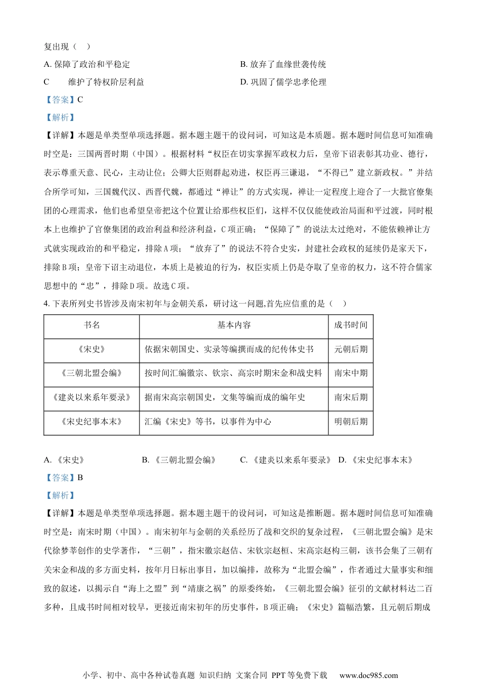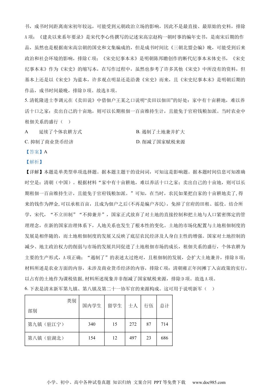 小学、初中、高中各种试卷真题知识归纳文案合同PPT等免费下载www.doc985.com2024年高考新课标卷历史真题1.考古学者在某史前遗址发掘出1300余座墓葬,大、中、小三类墓葬分别占总数的不到1%、近10%和90%。其中大型墓葬规模大、随葬品丰富,出土了成套的石制、陶制礼器等。据此可以推断,该遗址处于()A.旧石器时代早期B.旧石器时代晚期C.新石器时代早期D.新石器时代晚期【答案】D【解析】【详解】本题是单类型单项选择题。据本题主题干的设问词,可知这是推断题。据本题时间信息可知准确时空是:新石器时代(中国)。根据材料可知并结合所学可知,墓葬中随葬品的多寡反映出贫富差别开始出现,阶级已经萌芽,社会中正孕育着文明因素,结合所学新石器时代晚期,社会经济文化水平发展到更高的层次,青铜铸造已经发明,城市出现,墓葬中随葬品的种类和数量相差悬殊,反映了阶级的出现,表明在此阶段已经出现了文明的曙光,社会历史已接近文明时代的门槛,D项正确;旧石器时代是指以使用打制石器为标志的人类物质文明发展阶段,距今约250万年~约1万年前,从事渔猎和采集,过着群居生活,生产力发展水平有限,并未出现阶级分化,排除A、B项;新石器时代早期,考古学文化的石器仍以打制为主,磨制很少,陶器制作粗糙,居民生活以渔猎采集为主,农业和家畜饲养业处于初期阶段,且早期,社会复杂化程度相对较低,发现的大型聚落及墓葬较少,排除C项。故选D项。2.春秋战国时期,各国纷纷进行政治变革,争相延揽人才,诸子百家大都呼吁“选贤与能”。不认同这一理念的学派是()A.儒家B.墨家C.道家D.法家【答案】C【解析】【详解】本题是单类型单项选择题。据本题主题干的设问词,可知这是反向题。据本题时间信息可知准确时空是:春秋战国时期(中国)。结合所学可知,道家提倡道法自然、无为而治、与自然和谐相处,代表没落的奴隶主贵族阶层,其思想较为保守和倒退,并不积极主张变法改革,延揽人才,C项正确;儒家思想中孟子、荀子分别提出“仁政”“隆礼重法”等思想,代表了新兴的地主阶级的利益,其主张一定程度上迎合了诸侯国变法改革的需要,排除A项;墨家代表社会下层小生产者的利益,主张“尚贤”,希望有贤能的人治理国家,排除B项;法家提出了富国强兵、以法治国的思想,主张今必胜昔,因时变革,排除D项。故选C项。3.三国魏代汉、西晋代魏,都通过“禅让”实现:权臣在切实掌握军政权力后,皇帝下诏表彰其功业、德行,表示尊重天意、民心,主动让位;公卿大臣则群起劝进,权臣再三谦退,“不得已”建立新政权。“禅让”反小学、初中、高中各种试卷真题知识归纳文案合同PPT等免费下载www.doc985.com复出现()A.保障了政治和平稳定B.放弃了血缘世袭传统C.维护了特权阶层利益D.巩固了儒学忠孝伦理【答案】C【解析】【详解】本题是单类型单项选择题。据本题主题干的设问词,可知这是本质题。据本题时间信息可知准确时空是:三国两晋时期(中国)。根据材料“权臣在切实掌握军政权力后,皇帝下诏表彰其功业、德行,表示尊重天意、民心,主动让位;公卿大臣则群起劝进,权臣再三谦退,“不得已”建立新政权。”并结合所学可知,三国魏代汉、西晋代魏,都通过“禅让”的方式实现,禅让一定程度上迎合了一大批官僚集团的心理需求,他们也希望皇帝把这个位置让给那些权臣们,这样不仅仅能使政治局面和平过渡,同时根本上也维护了官僚集团的政治利益和经济利益,C项正确;“保障了”的说法太过绝对,不能依赖禅让方式就实现政治的和平稳定,排除A项;“放弃了”的说法不符合史实,封建社会政权的延续仍是家天下,排除B项;皇帝下诏主动退位,本质上是被迫的行为,权臣实质上仍是夺取了皇帝的权力,这不符合儒家思想中的“忠”,排除D项。故选C项。4.下表所列史书皆涉及南宋初年与金朝关系,研讨这一问题,首先应信重的是()书名基本内容成书时间《宋史》依据宋朝国史、实录等编撰而成的纪传体史书元朝后期《三朝北盟会编》按时间汇编徽宗、钦宗、高宗时期宋金和战史料南宋中期《建炎以来系年要录》据南宋高宗朝国史,文集等编而成的编年史南宋后期《宋史纪事本末》汇编《宋史》等书,以事...