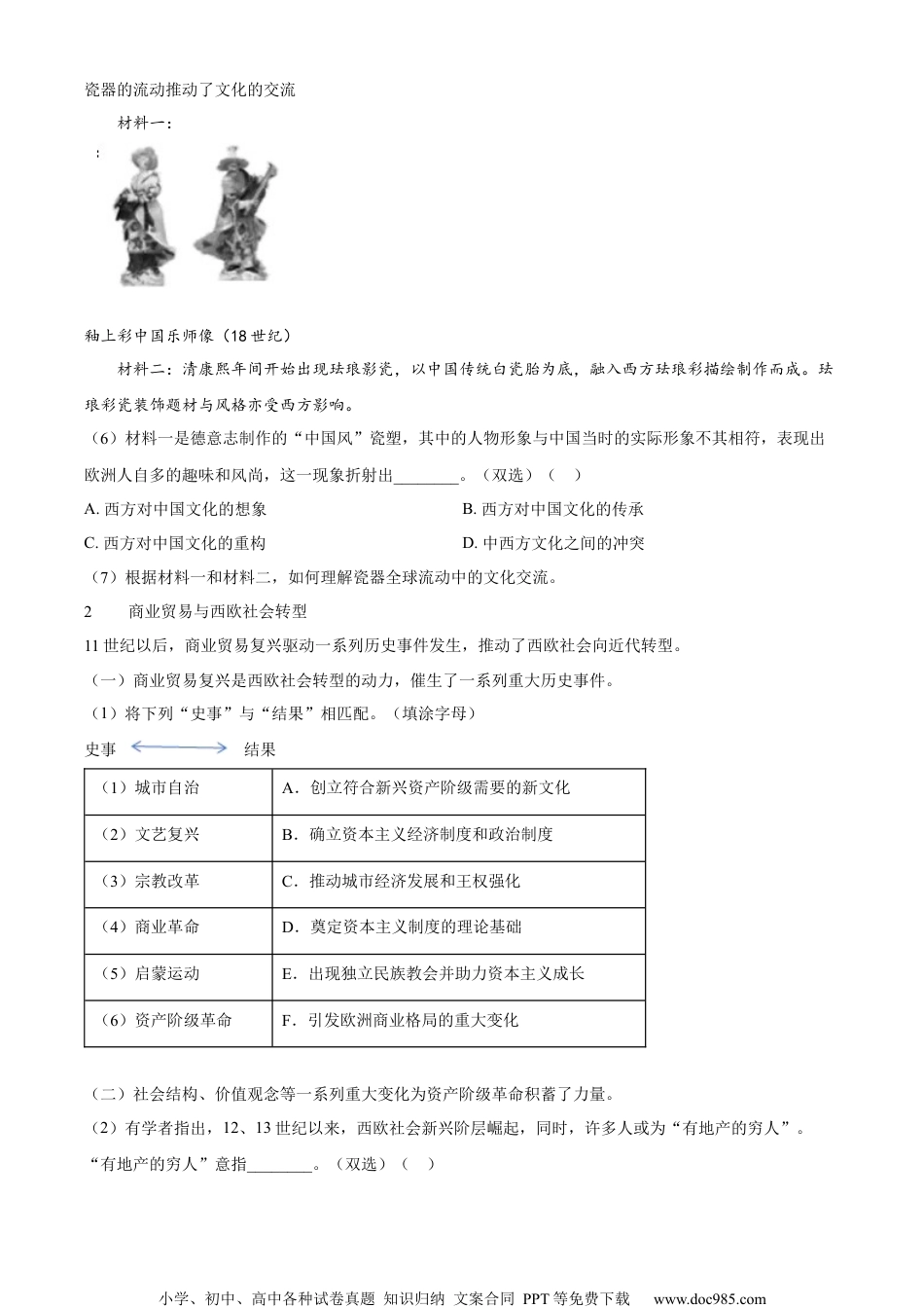 小学、初中、高中各种试卷真题知识归纳文案合同PPT等免费下载www.doc985.com2024年上海卷历史卷学科等级考试试题免责声明:试题来自网络,非官方渠道,学科网不对真实性负责,请自行鉴别1.瓷器的全球流动中国瓷器在中西方文明交流过程中,扮演着载体和象征的角色。自新航路开辟以来,中国与欧洲的距离被极大地拉近,从前需要在东南亚、南亚、阿拉伯诸国进行转运的中国瓷器,如今与欧洲有了更直接的联系通道。(一)瓷器行销世界(1)随着制瓷技术的重大改进,瓷器远销海外,成为继丝绸之后中华文明新的文化符号,这发生于________。(单选)()A.秦汉时期B.魏晋时期C.隋唐时期D.宋元时期(2)不同时代、不同类型的中外交通路线为瓷器行销世界提供了便利,将下列示意图中的交通路线填入空格中(填涂字母)①有研究表明,8-10世纪中国瓷器已经由中亚的撒马尔罕传入大食国境内,该路线是_________。②郑和出使西洋,曾将一批景德镇官窑的瓷器作为外交礼物赠与外邦。他出使的路线是_________。③16世纪上半叶,葡萄牙向中国订购了一批带有王室徽章的瓷器,其葡萄牙的运输路线是_________。(3)1784年,美国商船“中国皇后号”抵达中国港口,其与中国的瓷器贸易由官方指定机构代理,该机构是________。(单选)()A.宣政院B.市舶司C.中书省D.广州十三行(4)结合地图及所学,分析中国的瓷器不断外传的原因有________。(双选)()A.外部需求B.军事扩张C.技术传播D.工艺精湛(二)瓷器影响世界(5)欧洲瓷器大量订货,直接促使欧洲众多城市成为专门的手工业市镇,开始进行了“流水线式生产”,生产效率不断增加,这得益于________。(单选)A.工厂制度的确定B.资本主义的垄断C.手工工坊的发展D.殖民活动的兴起小学、初中、高中各种试卷真题知识归纳文案合同PPT等免费下载www.doc985.com瓷器的流动推动了文化的交流材料一:釉上彩中国乐师像(18世纪)材料二:清康熙年间开始出现珐琅影瓷,以中国传统白瓷胎为底,融入西方珐琅彩描绘制作而成。珐琅彩瓷装饰题材与风格亦受西方影响。(6)材料一是德意志制作的“中国风”瓷塑,其中的人物形象与中国当时的实际形象不其相符,表现出欧洲人自多的趣味和风尚,这一现象折射出________。(双选)()A.西方对中国文化的想象B.西方对中国文化的传承C.西方对中国文化的重构D.中西方文化之间的冲突(7)根据材料一和材料二,如何理解瓷器全球流动中的文化交流。2.商业贸易与西欧社会转型11世纪以后,商业贸易复兴驱动一系列历史事件发生,推动了西欧社会向近代转型。(一)商业贸易复兴是西欧社会转型的动力,催生了一系列重大历史事件。(1)将下列“史事”与“结果”相匹配。(填涂字母)史事结果(1)城市自治A.创立符合新兴资产阶级需要的新文化(2)文艺复兴B.确立资本主义经济制度和政治制度(3)宗教改革C.推动城市经济发展和王权强化(4)商业革命D.奠定资本主义制度的理论基础(5)启蒙运动E.出现独立民族教会并助力资本主义成长(6)资产阶级革命F.引发欧洲商业格局的重大变化(二)社会结构、价值观念等一系列重大变化为资产阶级革命积蓄了力量。(2)有学者指出,12、13世纪以来,西欧社会新兴阶层崛起,同时,许多人或为“有地产的穷人”。“有地产的穷人”意指________。(双选)()小学、初中、高中各种试卷真题知识归纳文案合同PPT等免费下载www.doc985.comA.农民失去地产B.土地贵族贫困C.穷人获得土地D.教会财富贬值(3)财富向新兴阶层转移,促成了与传统不同的财富观念。概括下列三则材料分别是从什么视角看待财富的。材料一:圣·伯尔拿曾说:“你只有蔑视现世的财富,才能在天堂成为一个富有者。”圣·托马斯阿奎那指出:“因此,甘愿贫穷是人们达到完美的爱的最重要和最基本的条件。”——[苏]古列维奇《中世纪的文化范畴》材料二:波焦·布拉乔列尼说:“金钱对公共福利和市民生活都是非常有益的。……贪婪没有违背天性,恰恰相反,它是自然赋予我们的天性,就像我们与生俱来的其他欲望一样。”——王挺之等《欧洲文艺复兴》材料三:自分工完全确立以来,各人所需要的物品,仅有极小部分仰给于自己劳动,最大部...