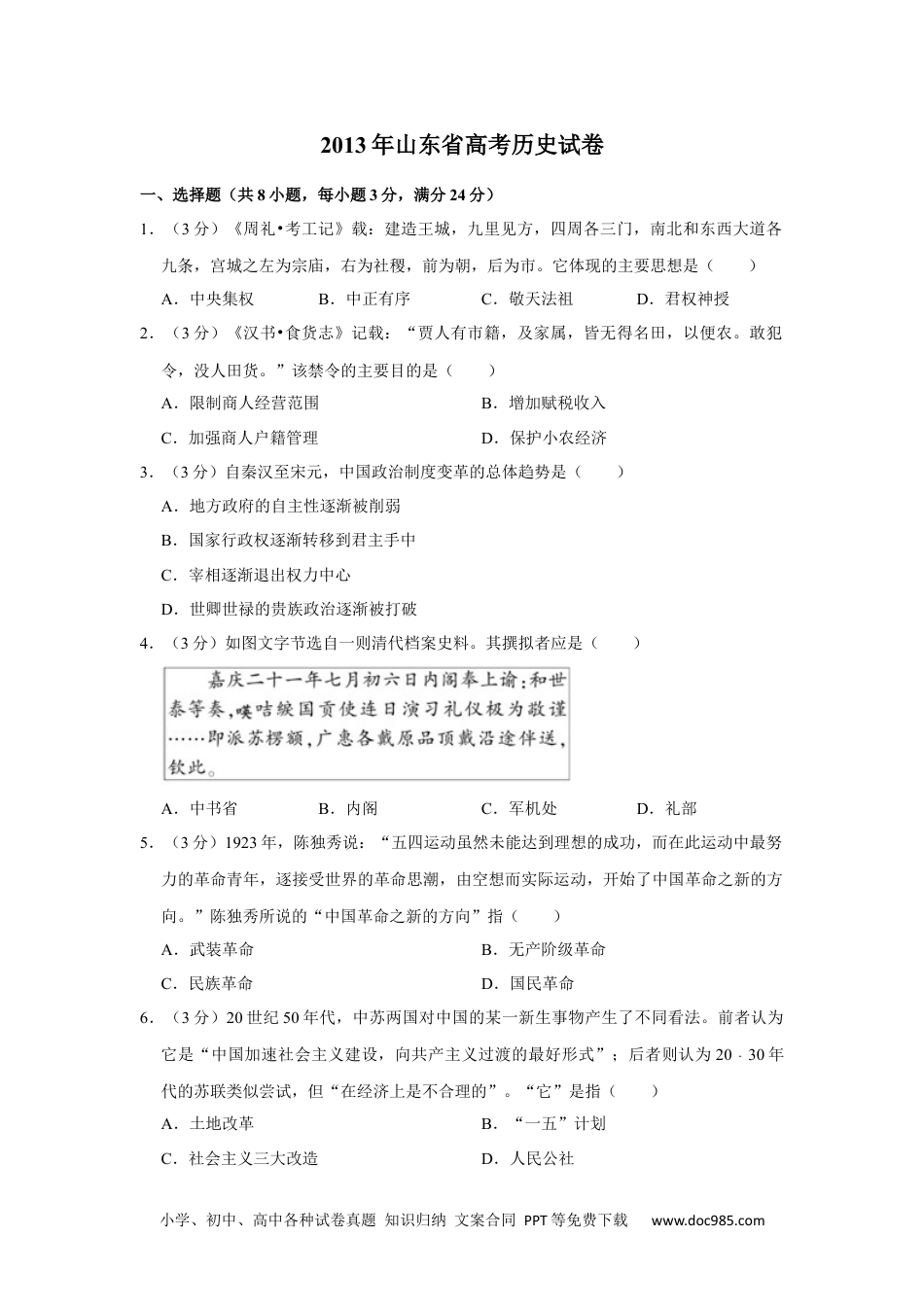 小学、初中、高中各种试卷真题知识归纳文案合同PPT等免费下载www.doc985.com2013年山东省高考历史试卷一、选择题(共8小题,每小题3分,满分24分)1.(3分)《周礼•考工记》载:建造王城,九里见方,四周各三门,南北和东西大道各九条,宫城之左为宗庙,右为社稷,前为朝,后为市。它体现的主要思想是()A.中央集权B.中正有序C.敬天法祖D.君权神授2.(3分)《汉书•食货志》记载:“贾人有市籍,及家属,皆无得名田,以便农。敢犯令,没人田货。”该禁令的主要目的是()A.限制商人经营范围B.增加赋税收入C.加强商人户籍管理D.保护小农经济3.(3分)自秦汉至宋元,中国政治制度变革的总体趋势是()A.地方政府的自主性逐渐被削弱B.国家行政权逐渐转移到君主手中C.宰相逐渐退出权力中心D.世卿世禄的贵族政治逐渐被打破4.(3分)如图文字节选自一则清代档案史料。其撰拟者应是()A.中书省B.内阁C.军机处D.礼部5.(3分)1923年,陈独秀说:“五四运动虽然未能达到理想的成功,而在此运动中最努力的革命青年,逐接受世界的革命思潮,由空想而实际运动,开始了中国革命之新的方向。”陈独秀所说的“中国革命之新的方向”指()A.武装革命B.无产阶级革命C.民族革命D.国民革命6.(3分)20世纪50年代,中苏两国对中国的某一新生事物产生了不同看法。前者认为它是“中国加速社会主义建设,向共产主义过渡的最好形式”;后者则认为2030﹣年代的苏联类似尝试,但“在经济上是不合理的”。“它”是指()A.土地改革B.“一五”计划C.社会主义三大改造D.人民公社小学、初中、高中各种试卷真题知识归纳文案合同PPT等免费下载www.doc985.com7.(3分)1788年7月10日,纽约某报纸以《船讯﹣﹣号外》为题发布通告:万世联合船主的幸福船,已载着十三包“联合、和平和友谊”进港,……愚蠢船主的船已载着地方偏见、不和的种子等出港。它赞美的是()A.联邦体制B.分权制衡原则C.共和制度D.主权在民原则8.(3分)下列关于李贽思想与文艺复兴时期人文主义思想的表述,不正确的是()A.都具有思想启蒙意义B.都是商品经济发展的产物C.都体现了新兴资产阶级的愿望D.都宣扬了个性自由和解放二、解答题(共5小题,满分76分)9.(20分)19世纪末20世纪初,中国文化教育领域发生了重大变化。阅读材料,回答问题。材料一表1为1902~1904年译书统计简表。表1国别译书类别英美日其他总计百分比哲学宗教102232377.0文学艺术83411264.9史地810902012824.0社会科学133833713625.5自然科学109732011221.0应用科学3324265610.5杂录52247387.1总计5732321123533﹣百分比10.76.060.223.1﹣100.0﹣﹣据左玉河《从四部之学到七科之学》材料二表2为京师大学堂专业设置简表。表2小学、初中、高中各种试卷真题知识归纳文案合同PPT等免费下载www.doc985.com科目专业备注经学科周易、论语、春秋、理学等各科预科阶段均须开设的课程:经学大义人伦道德中国文学外国语体操政法科政治、法律文学科中外史学、地理、文学等商科银行及保险、关税等格致科算学、化学、物理等农科农学、林学等工科机器、造船、电气等医科医学、药学﹣﹣据1904年《奏定大学堂章程》(1)据表1,说明这一阶段译书活动的主要特点,并分析其形成原因。(2)据表2,说明京师大学堂的专业与课程设置如何体现了“中体西用”的办学思想。试从经济和政治两个方面,分析其对中国现代化的影响。(3)基于以上分析,概括指出文化教育与社会发展的关系。10.(16分)美国杜邦公司的历史是两个多世纪以来资本主义经济发展的缩影。阅读材料,回答问题。片断一初创1802年,从法国购进机器,在特拉华州的威尔明顿市郊创建了火药厂,生产黑色火药。不久,法国订单便源源不断到来。1805年,美国军方宣布,其所需火药将全部由杜邦火药厂生产。片断二发展1902年,建立东部实验室,它是美国最早的工业实验室之一。1903年,建立中央实验站,并利用其在化学方面的研究成果生产清漆和其它非炸药类产品。片断三转型1920年,关闭了威尔明顿市郊的火药厂。19221925﹣年,研发出快干型耐磨亮漆,用于汽车生产;制造出成本低廉且耐用的塑胶产...