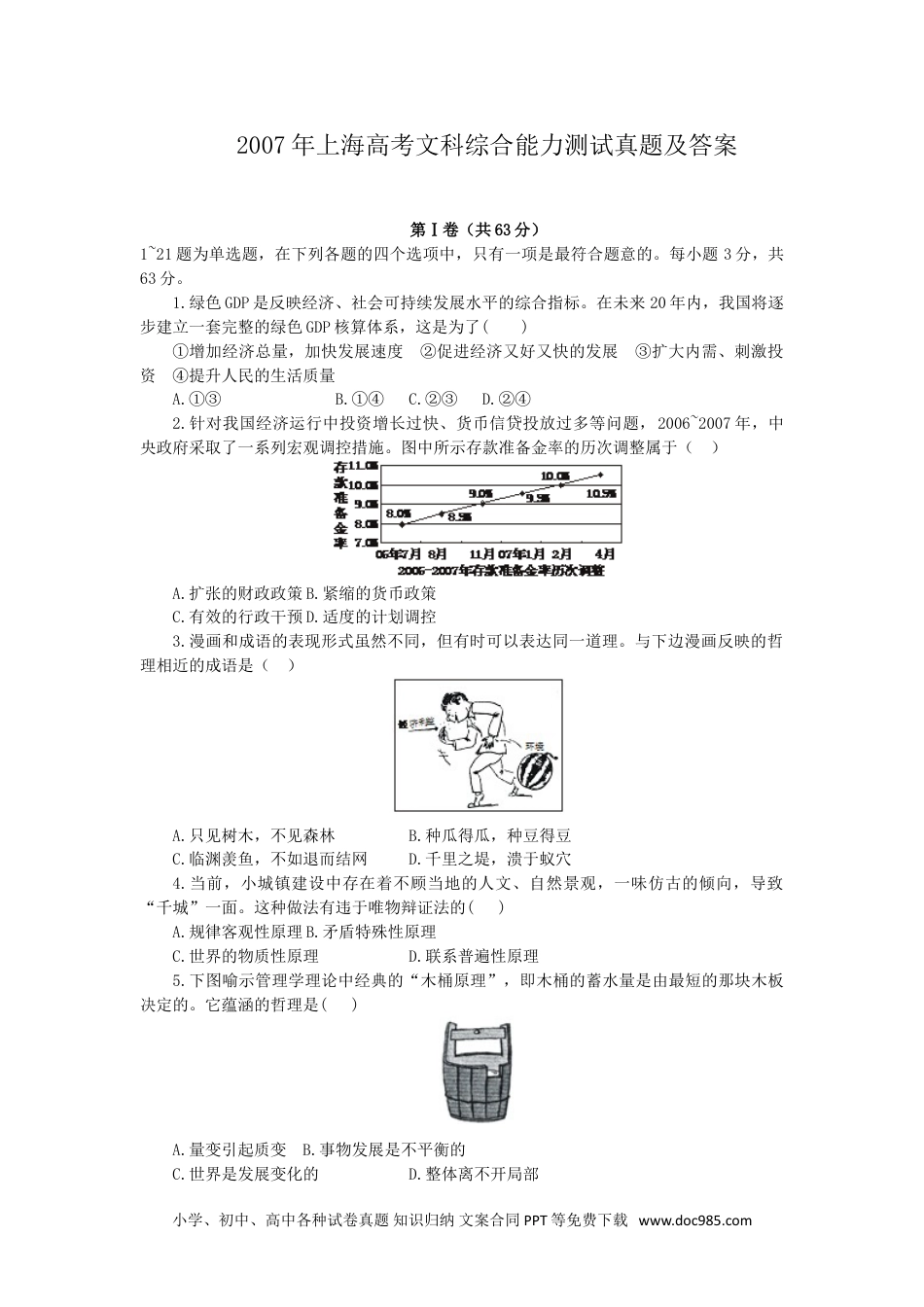 2007年上海高考文科综合能力测试真题及答案第Ⅰ卷(共63分)1~21题为单选题,在下列各题的四个选项中,只有一项是最符合题意的。每小题3分,共63分。1.绿色GDP是反映经济、社会可持续发展水平的综合指标。在未来20年内,我国将逐步建立一套完整的绿色GDP核算体系,这是为了()①增加经济总量,加快发展速度②促进经济又好又快的发展③扩大内需、刺激投资④提升人民的生活质量A.①③B.①④C.②③D.②④2.针对我国经济运行中投资增长过快、货币信贷投放过多等问题,2006~2007年,中央政府采取了一系列宏观调控措施。图中所示存款准备金率的历次调整属于()A.扩张的财政政策B.紧缩的货币政策C.有效的行政干预D.适度的计划调控3.漫画和成语的表现形式虽然不同,但有时可以表达同一道理。与下边漫画反映的哲理相近的成语是()A.只见树木,不见森林B.种瓜得瓜,种豆得豆C.临渊羡鱼,不如退而结网D.千里之堤,溃于蚁穴4.当前,小城镇建设中存在着不顾当地的人文、自然景观,一味仿古的倾向,导致“千城”一面。这种做法有违于唯物辩证法的()A.规律客观性原理B.矛盾特殊性原理C.世界的物质性原理D.联系普遍性原理5.下图喻示管理学理论中经典的“木桶原理”,即木桶的蓄水量是由最短的那块木板决定的。它蕴涵的哲理是()A.量变引起质变B.事物发展是不平衡的C.世界是发展变化的D.整体离不开局部小学、初中、高中各种试卷真题知识归纳文案合同PPT等免费下载www.doc985.com6.海洋蕴藏着丰富的生物、能源、矿产等资源,是一个国家生存发展的重要战略空间,海洋权益是敏感的国际地缘政治问题。为此,我们应首先()A.开辟更多的海上航线B.大力开发利用海洋资源C.维护国家海洋主权D.加快发展海洋经济7.邓小平曾说:“现在世界上真正大的问题一个是和平问题……,一个是经济问题或者说发展问题……发展问题是南北问题。”南北对话是处理南北问题的方式之一,下列属于南北对话的是()A.1960年建立石油输出国组织B.1961年召开不结盟国家会议C.1964年成立七十七国集团D.1975年召开“关于合作和发展的国际会议”8.据报道,上海发现了一张可能是元朝棉纺织革新家黄道婆的真人画像(见下图)。某同学想从下列四方面考证画像真伪,最关键的应该是确认画像的()A.人物年龄B.尺寸大小C.创作时间D.色彩浓淡9.上海是个移民城市。改革开放以来,上海户籍资料中增加了令狐、拓跋、鲜于、约翰、史密斯等新姓氏,这种情况意味着上海()①增进了与中西部地区的联系②加强了对外学术交流③接待了许多外国游客④出现了涉外婚姻现象A.①②B.①④C.②③D.②④10.2008年北京奥运会火炬“祥云”的红色手柄使用了一种表面触感接近于人体皮肤的橡胶皮革漆。当运动员手持“祥云”时,他感受到的将不再是冷冰冰的金属质感,而是仿佛与另一只手紧紧相握。这种设计思想体现出的北京奥运理念是()A.世纪奥运B.绿色奥运C.人文奥运D.数字奥运11.下表反映1500-1800年间欧洲主要国家商船抵达亚洲的数量。结合所学知识和表格信息,可以得出的推论是()国家数量(艘)1500-1599(年)1600-1700(年)1701-1800(年)葡萄牙705371196荷兰6517702950英格兰-8111865欧洲合计77031616661——安格斯·麦迪森:《世界经济千年史》A.16世纪荷兰抵达亚洲的商船数量最多,被称为“海上马车夫”B.17到18世纪荷兰抵达亚洲的商船数量增长率高于英格兰C.18世纪葡萄牙抵达亚洲的商船数量减少,转而致力开辟新航路D.18世纪英格兰抵达亚洲的商船数量增长迅速,有成为海上霸主的趋势小学、初中、高中各种试卷真题知识归纳文案合同PPT等免费下载www.doc985.com12.下图白色部分反映的是某一时期西方人所认识的世界。运用所学知识判断,这一认识应该出现于()A.新航路开辟以后B.英国工业革命后C.国际联盟成立后D.冷战格局出现后13.2007年3月11日凌晨2时起,美国所有的时钟拨快1小时,进入“夏令时”。“夏令时”被称为“节约日光的时间”,它考虑的主要因素是()A.昼夜长短的季节变化B.地球自转速度的变化C.正午太阳高度的变化D.日地距离的变化14.等压线是某一水平面上气压相同各点的连线。下列四幅等压线图中,P点所在位置风力最大的是()15.气温随高度变化会影...