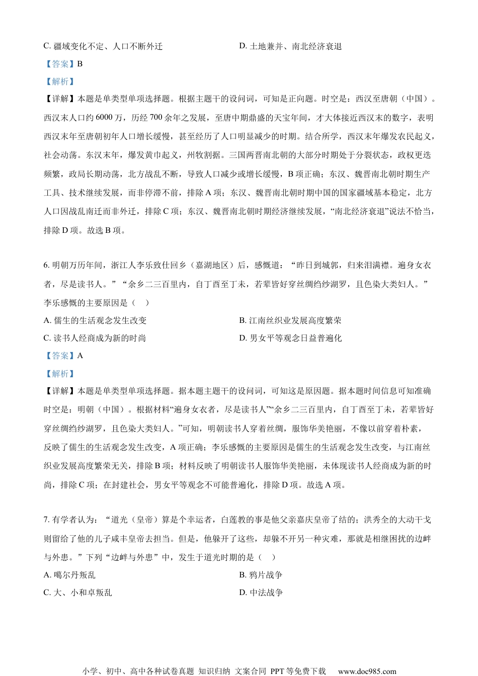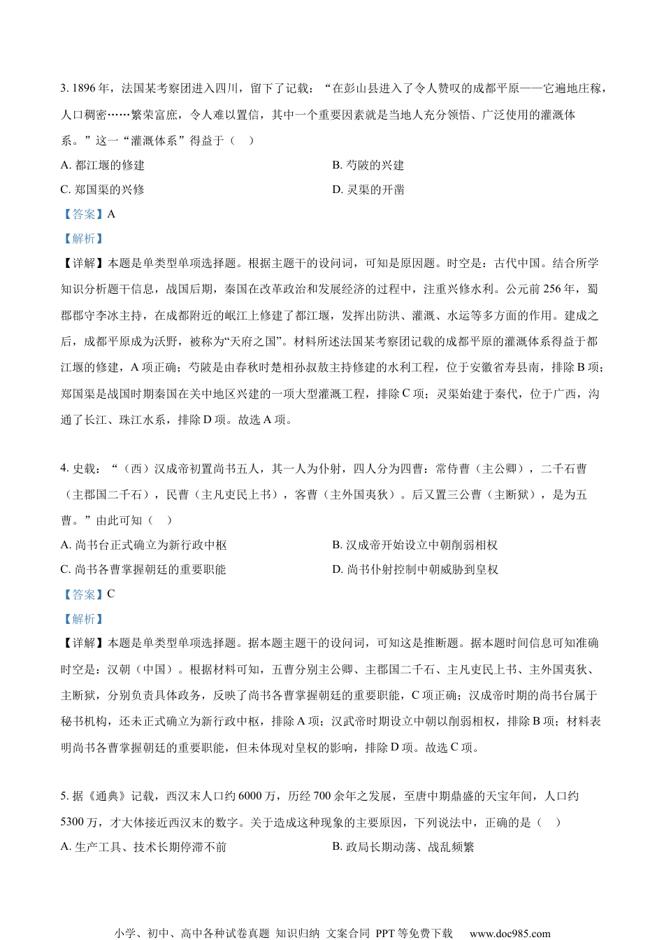 小学、初中、高中各种试卷真题知识归纳文案合同PPT等免费下载www.doc985.com浙江省2024年1月普通高校招生选考科目考试历史试题第Ⅰ卷一、选择题I(本大题共15小题,每小题2分,共30分。每小题列出的四个备选项中只有一个是符合题目要求的,不选、多选、错选均不得分)1.中华文明是人类最古老的文明之一。早在新石器时代,先民们就创造了丰富的物质和精神文化。这一时期()A.种植粟和水稻,掌握养蚕缫丝技术B.邦国林立,早期国家形成并发展C.先后出现精美玉器、青铜器和铁器D.氏族成员平等,未出现阶级分化【答案】A【解析】【详解】本题是单类型单项选择题。根据主题干的设问词,可知是推断题。时空是:新石器时代(中国)。距今约1万年前,中国进入新石器时代。仰韶文化和河姆渡文化是新石器时代文化遗存,仰韶文化时期以粟等为主要栽培作物,河姆渡文化的居民种植水稻,并且掌握了养蚕缫丝技术,A项正确;夏、商、西周是中华文明和早期国家的形成与发展时期,排除B项;新石器时代尚未出现铁器,排除C项;新石器时代晚期进入父系氏族社会,社会贫富分化与不平等开始出现,排除D项。故选A项。2.文化是民族的血脉。中华优秀传统文化源远流长,博大精深。下列项中,由老子提出且体现朴素唯物观的是()A.“大道之行也,天下为公”B.“天行健,君子以自强不息”C.“天行有常,不为尧存,不为桀亡”D.“人法地,地法天,天法道,道法自然”【答案】D【解析】【详解】本题是单类型单项选择题。据本题主题干的设问词,可知这是正向题。据本题时间信息可知准确时空是:古代(中国)。根据所学知识可知,“人法地,地法天,天法道,道法自然”由老子提出,意思是:人类的生活行为的运行是以地球物理运行的法则为法则,地球运行的法则是以这整个宇宙运行的法则为法则,宇宙运行的是以道的法则为法则,道的运行是以自然而然为法则。简言之,道的运作是以宇宙本来自然的规律为规律,体现了朴素唯物观,D项正确;“大道之行也,天下为公”意思是在大道施行的时候,天下是人们所共有的。不符合题意,排除A项;“天行健,君子以自强不息”意思是宇宙不停运转,人应效法天地,永远不断地前进。不符合题意,排除B项;“天行有常,不为尧存,不为桀亡”的意思是大自然的运行有其自身规律,这个规律不会因为尧的圣明而就存在,也不会因为桀而就不存在。该主张由荀子提出,不符合题意,排除C项。故选D项。小学、初中、高中各种试卷真题知识归纳文案合同PPT等免费下载www.doc985.com3.1896年,法国某考察团进入四川,留下了记载:“在彭山县进入了令人赞叹的成都平原——它遍地庄稼,人口稠密……繁荣富庶,令人难以置信,其中一个重要因素就是当地人充分领悟、广泛使用的灌溉体系。”这一“灌溉体系”得益于()A.都江堰的修建B.芍陂的兴建C.郑国渠的兴修D.灵渠的开凿【答案】A【解析】【详解】本题是单类型单项选择题。根据主题干的设问词,可知是原因题。时空是:古代中国。结合所学知识分析题干信息,战国后期,秦国在改革政治和发展经济的过程中,注重兴修水利。公元前256年,蜀郡郡守李冰主持,在成都附近的岷江上修建了都江堰,发挥出防洪、灌溉、水运等多方面的作用。建成之后,成都平原成为沃野,被称为“天府之国”。材料所述法国某考察团记载的成都平原的灌溉体系得益于都江堰的修建,A项正确;芍陂是由春秋时楚相孙叔敖主持修建的水利工程,位于安徽省寿县南,排除B项;郑国渠是战国时期秦国在关中地区兴建的一项大型灌溉工程,排除C项;灵渠始建于秦代,位于广西,沟通了长江、珠江水系,排除D项。故选A项。4.史载:“(西)汉成帝初置尚书五人,其一人为仆射,四人分为四曹:常侍曹(主公卿),二千石曹(主郡国二千石),民曹(主凡吏民上书),客曹(主外国夷狄)。后又置三公曹(主断狱),是为五曹。”由此可知()A.尚书台正式确立为新行政中枢B.汉成帝开始设立中朝削弱相权C.尚书各曹掌握朝廷的重要职能D.尚书仆射控制中朝威胁到皇权【答案】C【解析】【详解】本题是单类型单项选择题。据本题主题干的设问词,可知这是推断题。据本题时间信息可知准确时空是:汉朝(中国)。根据材...
