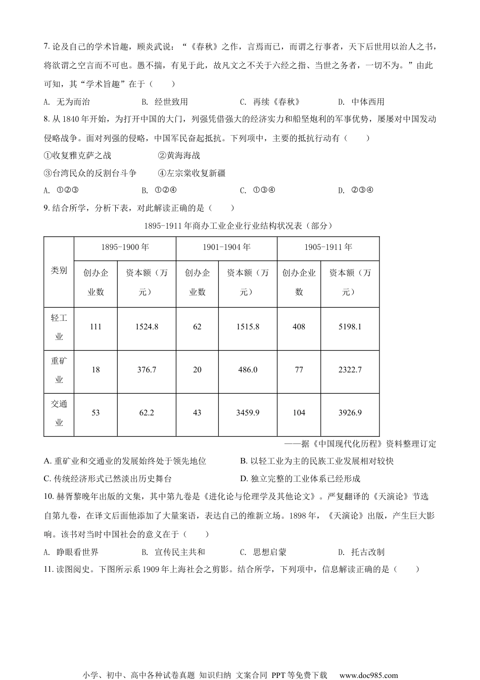 小学、初中、高中各种试卷真题知识归纳文案合同PPT等免费下载www.doc985.com历史试题一、选择题(本大题共25小题,每小题2分,共50分。每小题列出的四个备选项中只有一个是符合题目要求的,不选、多选、错选均不得分)1.谈及个人的政治抱负和所心仪的时代,孔子说:“周监于二代,郁郁乎文哉!吾从周。”下列项中,与孔子“从周”相关的是()A.“封建亲戚,以蕃屏周”B.“海内为郡县,法令由一统”C.“罢黜百家,独尊儒术”D.“上品无寒门,下品无世族”2.“长太息以掩涕兮,哀民生之多艰”,出自一首政治抒情长诗。作者毕生追求“美政”,其作品充满对家国的炽热情感和深切忧念。他是()A.墨子B.韩非C.屈原D.杜甫3.中国是纸的发明地,敬惜字纸是中华民族的传统美德。经过考古工作者的不解努力,目前已知书写用纸的发明可能是在()A.西汉B.唐代C.北宋D.元代4.历代职官制度的演进,既有传承又有创新。下表所列秦、元、明、清四朝职官信息,按时序排列正确的是()①理藩院尚书、军机大臣、水师提督②丞相、御史大夫、郡守③大学士、内阁首辅、锦衣卫指挥使④监察御史、宣政院使、福建行省右丞A.①③②④B.②④③①C.③①②④D.④②①③5.白居易有诗云:“水市通阛阓(街市),烟村混舳舻。吏征渔户税,人纳火田租。亥日饶虾蟹,寅年足虎䝙。……堤喧簇贩夫。夜船论铺赁,春酒断瓶酤。”诗作反映出()A.草市渐成规模,交易商品丰富B.富商大贾辟建会馆C.商业活动未曾受到官吏的监管D.“俞大娘航船”规模宏大6.中华海洋文明源远流长,海路绵延,联通中外。下列关于古代中国海外经济文化交流的认知,不正确的是()A.唐宋以来,“海上丝绸之路”也被称为“瓷路”B.宋元时期,海外商运发展,商品远销东欧、北非C.12世纪末至13世纪初,指南针由海路传入阿拉伯D.明清时期,禁止外国商人到中国进行贸易小学、初中、高中各种试卷真题知识归纳文案合同PPT等免费下载www.doc985.com7.论及自己的学术旨趣,顾炎武说:“《春秋》之作,言焉而已,而谓之行事者,天下后世用以治人之书,将欲谓之空言而不可也。愚不揣,有见于此,故凡文之不关于六经之指、当世之务者,一切不为。”由此可知,其“学术旨趣”在于()A.无为而治B.经世致用C.再续《春秋》D.中体西用8.从1840年开始,为打开中国的大门,列强凭借强大的经济实力和船坚炮利的军事优势,屡屡对中国发动侵略战争。面对列强的侵略,中国军民奋起抵抗。下列项中,主要的抵抗行动有()①收复雅克萨之战②黄海海战③台湾民众的反割台斗争④左宗棠收复新疆A.①②③B.①②④C.①③④D.②③④9.结合所学,分析下表,对此解读正确的是()1895-1911年商办工业企业行业结构状况表(部分)类别1895-1900年1901-1904年1905-1911年创办企业数资本额(万元)创办企业数资本额(万元)创办企业数资本额(万元)轻工业1111524.8621515.84085198.1重矿业18376.720486.0772322.7交通业5362.2433459.91043926.9——据《中国现代化历程》资料整理订定A.重矿业和交通业的发展始终处于领先地位B.以轻工业为主的民族工业发展相对较快C.传统经济形式已然淡出历史舞台D.独立完整的工业体系已经形成10.赫胥黎晚年出版的文集,其中第九卷是《进化论与伦理学及其他论文》。严复翻译的《天演论》节选自第九卷,在译文后面他添加了大量案语,表达自己的维新立场。1898年,《天演论》出版,产生巨大影响。该书对当时中国社会的意义在于()A.睁眼看世界B.宣传民主共和C.思想启蒙D.托古改制11.读图阅史。下图所示系1909年上海社会之剪影。结合所学,下列项中,信息解读正确的是()小学、初中、高中各种试卷真题知识归纳文案合同PPT等免费下载www.doc985.com①“坐电车三更笑语”,反映交通近代化影响人们的生活方式②乘坐马车仍是人们出行的主要方式③代步工具呈现出马车和电车并驾齐驱的发展趋势④新式交通工具取代传统交通工具是一个渐进的过程A.①③B.①④C.②③D.②④12.1919年,五四运动爆发后,天津总商会于6月9日发出布告称:“对于外交失败,惩办国贼,惟有以罢市为最后要求。本会鉴于人心趋向,局势危迫;无可挽回,当即决定自明日起罢市。”对上述材料解读...
