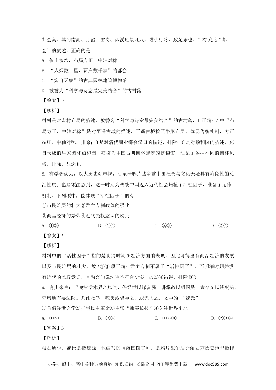 小学、初中、高中各种试卷真题知识归纳文案合同PPT等免费下载www.doc985.com2021年1月浙江省选考历史试题一、选择题(本大题共25小题,每小题2分,共50分。每小题列出的四个备选项中只有一个是符合题目要求的,不选、多选、错选均不得分)1.周王将子弟、功臣和臣服的先代贵族分封于各地,“制其畿疆而沟封之”,封国成为王朝的屏障。对此制度解读正确的是A.周王实现了权力的高度集中B.诸侯在封国享有世袭统治权C.血缘关系是分封的唯一依据D.维持了周朝四百余年的统治【答案】B【解析】结合所学知识可知,在分封制下,诸侯在封国享有世袭统治权,并拥有建立武装、征派赋役等权力,B正确;西周尚未实现权力的高度集中,A排除;分封制的对象主要分为王族、功臣和先代贵族,因此C错误;周朝存在时间是前1046年—前256年,D排除。故选B。2.春秋战国时期民本思想的主要内涵有:在人与自然关系方面,突出人的地位;在社会关系方面,强调民的作用。下列观点中,对应两者的是A.“齐物”;“逍遥”B.“天行有常”;“仁政”C.“法古无过,循礼无邪”;“非攻”D.“制天命而用之”;“民为贵,社稷次之,君为轻”【答案】D【解析】在人与自然关系方面,突出人的地位指的是荀子的主张“制天命而用之”;在社会关系方面,强调民的作用,指的是孟子的主张“民为贵,社稷次之,君为轻”。故D项正确;A是道家的,排除A;天行有常没有突出人的地位,排除B;C是法家与墨家的主张,不符合题意。3.某博物馆收藏了一批古代铜镜,上有铭文:“郡举孝廉州博士,少不努力老大悔”“孝言之始孝为右”“居必忠必信”等。从这些铭文中无法确切获取的历史信息是A.郡县制B.察举制C.铜镜制造于西汉D.宣扬儒家伦理思想【答案】C【解析】小学、初中、高中各种试卷真题知识归纳文案合同PPT等免费下载www.doc985.com结合所学知识可知,材料“郡举孝廉州博士”可提取当时西汉推行郡县制和察举制,AB不符合题意;材料“孝言之始孝为右”体现的是对儒家思想的宣传,D不符合题意;仅从材料信息是无法推出铜镜的制造准确时间,因此C符合题意。故选C。4.汴京相国寺“每月五次开放,万姓交易”,“占定两廊,皆诸寺师姑卖绣作、领抹、花朵、珠翠头面、生色销金花样幞头帽子、特髻冠子、条线之类”。材料反映了北宋A.已有定时一聚的庙会集市B.商业活动脱离了官吏监管C.“草市”演进为地方商业中心D.商人地位远比一般平民优越【答案】A【解析】材料“汴京相国寺‘每月五次开放,万姓交易’”体现的是北宋时期已有定时一聚的庙会集市,A正确;当时的商业活动仍然受到政府的监管,B排除;C与材料无关,排除;中国封建社会分为士农工商四个等级,D排除。故选A。5.一位理学家提出“心即理也”的核心命题,主张“切己自反,改过迁善”,认为“物欲”和“意见”是人心之弊,所以要将其剥落、扫除。该理学家A.被朱熹批评其理学过于“支离”B.推动北宋儒学复兴和理学创立C.主张于人生日常处直接体悟理D.确定了理学的最高范畴"天理"【答案】C【解析】结合所学知识可知,陆九渊提出“心即理也”的核心命题,主张于人生日常处通过内心反省来明理,因此C正确;陆九渊批评朱熹的理学过于“支离”,A排除;BD是程朱理学的成就,排除。故选C。6.我国古代一部著作有《农桑通诀》《百谷谱》《农器图谱》三部分,书末附有《活字印书法》,系统记录木活字印刷的新成就。后人盛赞此书:“文章尔雅,绘画亦皆工致。”此书作者是A.王祯B.沈括C.毕昇D.葛洪【答案】A【解析】结合所学知识可知,《农书》是元代王祯总结中国农业生产经验的一部农学著作,是一部从全国范围内对整个农业进行系统研究的巨著,主要分为《农桑通诀》《百谷谱》《农器图谱》三部分,因此A正确,BCD排除。故选A。7.据《汪氏宗谱》记载:“是自元而明,渐成村墟,今则烟火千家,栋宇鳞次,森然一大小学、初中、高中各种试卷真题知识归纳文案合同PPT等免费下载www.doc985.com都会矣。其间南湖、月沼、雷岗、西溪胜景凡八,堪供行吟,致足乐也。”有关此“都会”的叙述,正确的是A.依山傍水,布局方正,中轴对称B.“人烟数十里,贾户数千家”的都会C.“宛自天成”的古典园林建筑博...