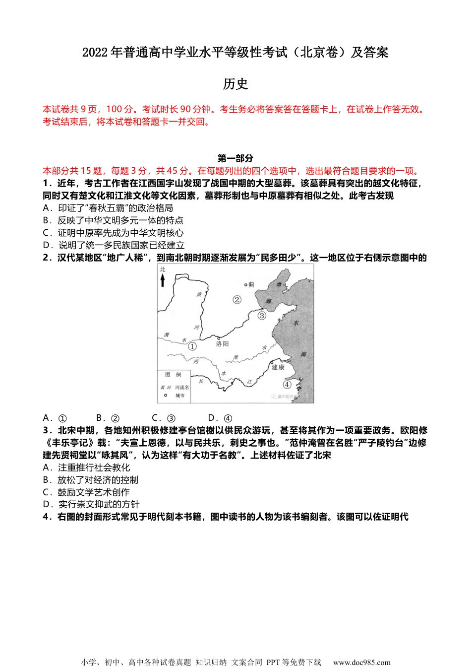 小学、初中、高中各种试卷真题知识归纳文案合同PPT等免费下载www.doc985.com2022年普通高中学业水平等级性考试(北京卷)及答案历史本试卷共9页,100分。考试时长90分钟。考生务必将答案答在答题卡上,在试卷上作答无效。考试结束后,将本试卷和答题卡一并交回。第一部分本部分共15题,每题3分,共45分。在每题列出的四个选项中,选出最符合题目要求的一项。1.近年,考古工作者在江西国字山发现了战国中期的大型墓葬。该墓葬具有突出的越文化特征,同时又有楚文化和江淮文化等文化因素,墓葬形制也与中原墓葬有相似之处。此考古发现A.印证了“春秋五霸”的政治格局B.反映了中华文明多元一体的特点C.证明中原率先成为中华文明核心D.说明了统一多民族国家已经建立2.汉代某地区“地广人稀”,到南北朝时期逐渐发展为“民多田少”。这一地区位于右侧示意图中的A.①B.②C.③D.④3.北宋中期,各地知州积极修建亭台馆榭以供民众游玩,甚至将其作为一项重要政务。欧阳修《丰乐亭记》载:“夫宣上恩德,以与民共乐,刺史之事也。”范仲淹曾在名胜“严子陵钓台”边修建先贤祠堂以“咏其风”,认为这样“有大功于名教”。上述材料佐证了北宋A.注重推行社会教化B.放松了对经济的控制C.鼓励文学艺术创作D.实行崇文抑武的方针4.右图的封面形式常见于明代刻本书籍,图中读书的人物为该书编刻者。该图可以佐证明代小学、初中、高中各种试卷真题知识归纳文案合同PPT等免费下载www.doc985.com小说和诗词曲赋丛编《万锦情林》封面局部A.开始出现雕版印刷技术B.戏曲表演艺术日趋成熟C.文化产品商品化程度加深D.士人思想摆脱了专制束缚5.西方有“条条大路通罗马”的说法,中国古代也有“处处有路透长安”的谚语。这两句话蕴含的历史信息是A.长安城的设计借鉴了罗马城市布局B.长安和罗马两地之间的交通网络密集C.古代商路便利了东西方之间的文化交流D.长安和罗马都曾经是帝国交通网络的中心6.《海国图志》问世不久即传入日本,当时著名学者佐久间象山感叹自己与魏源“所见亦有暗合者”“真可谓海外同志”,另一日本学者感慨道:“使海内尽得观之,庶乎其为我边防之一助矣!”这表明此时中日两国的有识之士A.有了“开眼看世界”的意识B.主张中日结盟以反对西方的侵略C.产生了反对封建专制的思想D.掀起了“师夷长技”的社会运动7.1898年,英国发出照会,要求清政府“确切保证不将扬子江(注:长江)沿岸各省租押或以其他名义让予他国”。清政府答复称:“查扬子江沿岸地方均属中国要地,中国断不让予或租给他国。”这意味着A.英国将长江流域辟为殖民地B.长江流域成为英国势力范围C.“门户开放”政策宣告失败D.清政府成功维护了主权完整8.1946年4月8日,中共代表王若飞、博古等人参加政治协商会议后,从重庆返回延安途中因飞机失事遇难,民主人士、国民党要员等社会各界纷纷表示哀悼。有悼文指出:“他们的事业,就是中国人民大众的事业,就是全人类的事业。”这反映出当时中国社会各界A.拥护抗日民族统一战线B.反对国民党政权的统治C.希望建立无产阶级政权小学、初中、高中各种试卷真题知识归纳文案合同PPT等免费下载www.doc985.comD.企盼国家实现和平民主9.1950年,教育部要求各高校“废除政治上的反动课程”,开设“辩证唯物论与历史唯物论”等课程;1956年,“马列主义基础”和“中国革命史”被列入高校必修课。这些高校课程的调整A.贯彻了新民主主义和社会主义教育方针B.标志着国家“科教兴国”发展战略形成C.成为社会主义“三大改造”的思想基础D.推行了“百花齐放”“百家争鸣”的方针10.2004年7月,“为中国和非洲喝彩——中华文化非洲行”活动在南非开幕。在一个月的时间里,中国组派多个艺术团赴11个非洲国家访问演出。这是中国在非洲大陆首次举办的大规模、综合性中国文化活动,是中非合作论坛框架内的重要举措。这一活动A.是中国重视发展周边关系的具体实践B.掀起了中国与非洲国家的建交高潮C.是中国全方位对外开放战略的一部分D.有利于“金砖国家”合作机制的深化11.英国学者马丁·贝尔纳在其著作《黑色雅典娜:古典文明的亚非之根》中,批...