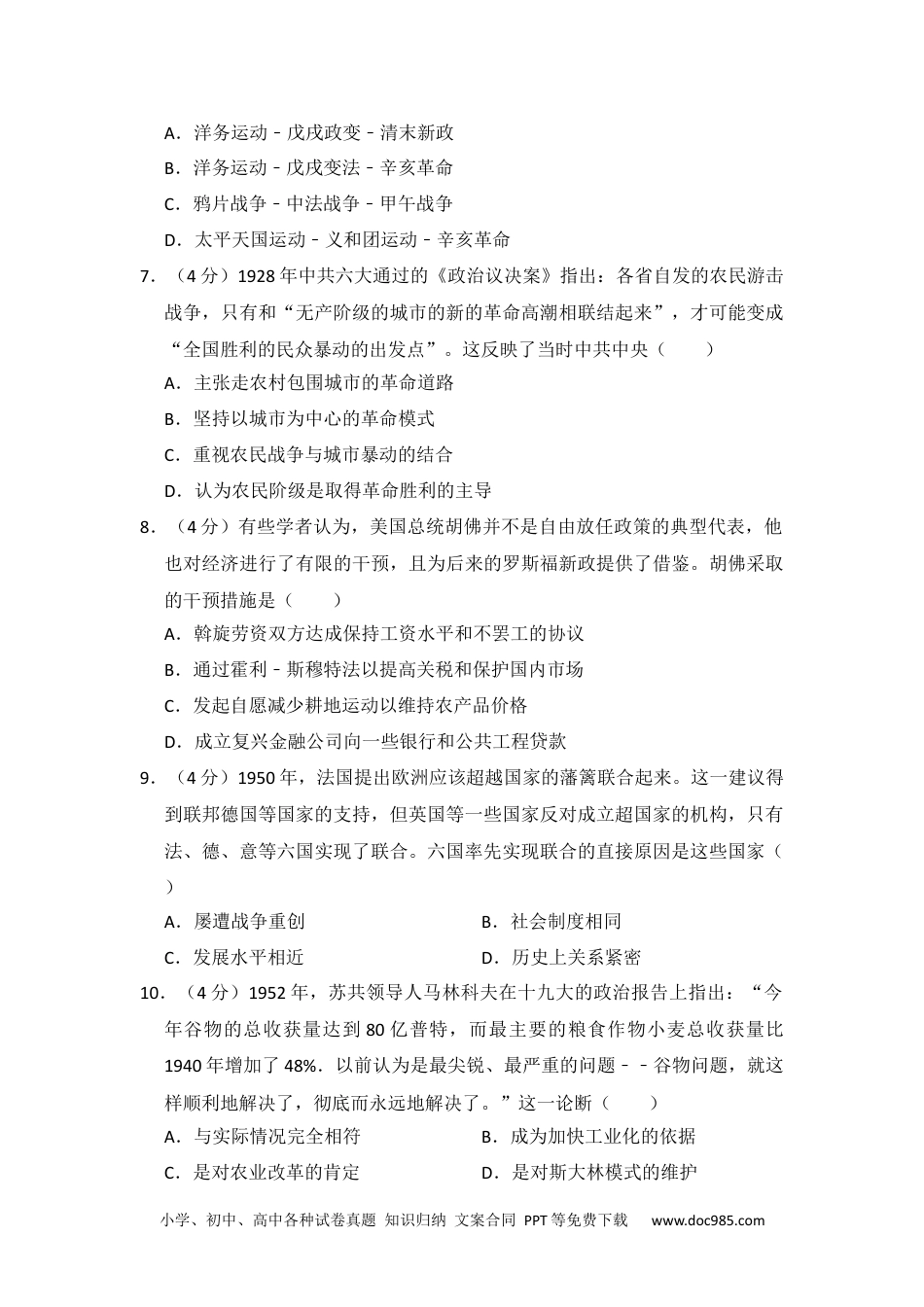 小学、初中、高中各种试卷真题知识归纳文案合同PPT等免费下载www.doc985.com2013年全国统一高考历史试卷(新课标Ⅰ)一、选择题(4×12分)1.(4分)在周代分封制下,墓葬有严格的等级规定。考古显示,战国时期,秦国地区君王墓葬规模宏大,其余墓葬无明显等级差别;在经济发达的东方六国地区,君王、卿大夫、士的墓葬等级差别明显。这表明()A.经济发展是分封制度得以维系的关键B.分封制中的等级规定凸显了君主集权C.秦国率先消除分封体制走向集权统治D.东方六国仍严格遵行西周的分封制度2.(4分)自汉至唐,儒学被奉为“周(公)孔之道”,宋代以后儒学多被称作“孔孟之道”,促成这一变化的是()A.宗法血缘制度逐渐瓦解B.仁政理念深入人心C.程朱理学成为统治思想D.陆王心学日益兴起3.(4分)有学者说,在古代雅典,“政治领袖和演说家根本就是同义语”。这一现象是雅典()A.政治体制的产物B.社会矛盾缓和的反映C.频繁改革的结果D.思想文化繁荣的体现4.(4分)1688年,英国议会迎立荷兰执政威廉为国王,并拥立他的妻子玛丽(詹姆士二世的女儿)为女王,目的是()A.加强英国与荷兰的友好关系B.否定王位世袭男性优先原则C.通过双王相互牵制防止独裁D.为光荣革命披上合法的外衣5.(4分)恩格斯称赞一位近代科学家的研究成就是“自然科学的独立宣言”,他指的应是()A.哥白尼的“日心说”否定了宗教神学崇信的“地心说”B.伽利略创立的实验科学推动了近代科学的发展C.牛顿创立经典力学完成了科学史上的划时代飞跃D.达尔文的生物进化论颠覆了关于人类起源的传统观念6.(4分)现代化是晚清历史发展的一个趋向,最能体现这一趋向的是()小学、初中、高中各种试卷真题知识归纳文案合同PPT等免费下载www.doc985.comA.洋务运动﹣戊戌政变﹣清末新政B.洋务运动﹣戊戌变法﹣辛亥革命C.鸦片战争﹣中法战争﹣甲午战争D.太平天国运动﹣义和团运动﹣辛亥革命7.(4分)1928年中共六大通过的《政治议决案》指出:各省自发的农民游击战争,只有和“无产阶级的城市的新的革命高潮相联结起来”,才可能变成“全国胜利的民众暴动的出发点”。这反映了当时中共中央()A.主张走农村包围城市的革命道路B.坚持以城市为中心的革命模式C.重视农民战争与城市暴动的结合D.认为农民阶级是取得革命胜利的主导8.(4分)有些学者认为,美国总统胡佛并不是自由放任政策的典型代表,他也对经济进行了有限的干预,且为后来的罗斯福新政提供了借鉴。胡佛采取的干预措施是()A.斡旋劳资双方达成保持工资水平和不罢工的协议B.通过霍利﹣斯穆特法以提高关税和保护国内市场C.发起自愿减少耕地运动以维持农产品价格D.成立复兴金融公司向一些银行和公共工程贷款9.(4分)1950年,法国提出欧洲应该超越国家的藩篱联合起来。这一建议得到联邦德国等国家的支持,但英国等一些国家反对成立超国家的机构,只有法、德、意等六国实现了联合。六国率先实现联合的直接原因是这些国家()A.屡遭战争重创B.社会制度相同C.发展水平相近D.历史上关系紧密10.(4分)1952年,苏共领导人马林科夫在十九大的政治报告上指出:“今年谷物的总收获量达到80亿普特,而最主要的粮食作物小麦总收获量比1940年增加了48%.以前认为是最尖锐、最严重的问题﹣﹣谷物问题,就这样顺利地解决了,彻底而永远地解决了。”这一论断()A.与实际情况完全相符B.成为加快工业化的依据C.是对农业改革的肯定D.是对斯大林模式的维护小学、初中、高中各种试卷真题知识归纳文案合同PPT等免费下载www.doc985.com11.(4分)图中①②③④分别是不同时期的欧洲局部图。符合德国历史发展进程的是()A.③②④①B.④③①②C.①④③②D.④①②③12.(4分)有俄罗斯学者认为,中国20世纪80年代的改革属于新版的苏俄新经济政策。这一认识的依据是两者都()A.处于相似的国内外经济环境B.面临着处理计划与市场的关系问题C.巩固了农村的集体所有制经济D.促进了社会主义工业化二、非选择题(52分)13.(25分)阅读材料,完成下列要求。材料一我国是最早利用海洋的国家之一,殷墟即发现了来自南海乃至阿曼湾的...