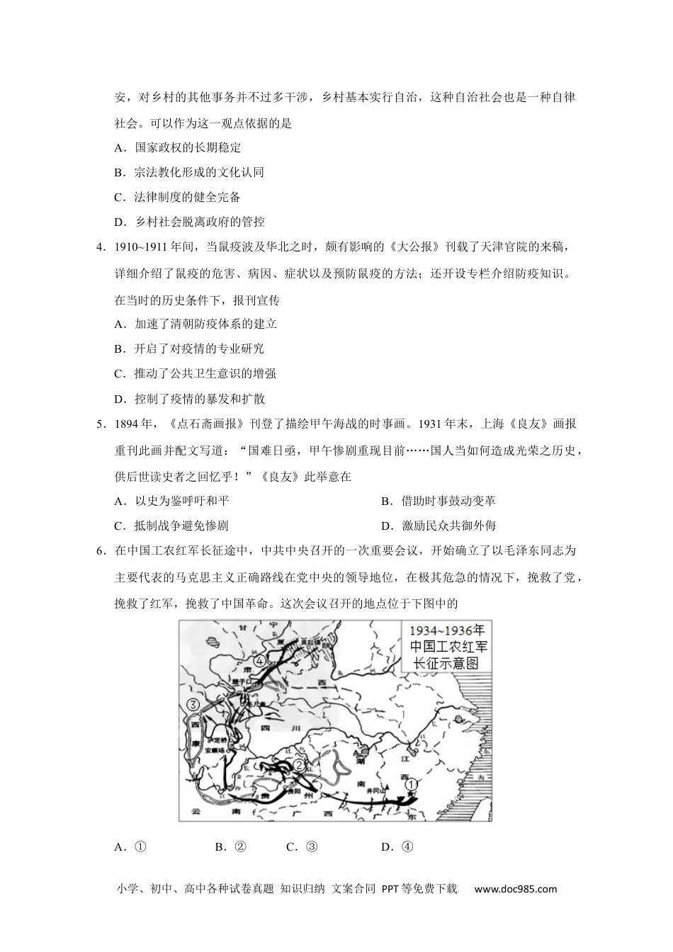 小学、初中、高中各种试卷真题知识归纳文案合同PPT等免费下载www.doc985.com2020年天津市普通高中学业水平等级性考试历史本试卷分为第I卷(选择题)和第II卷(非选择题)两部分,共100分,考试用时60分钟。第I卷1至4页,第II卷5至7页。答卷前,考生务必将自己的姓名、考生号、考场号和座位号填写在答题卡上,并在规定位置粘贴考试用条形码。答卷时,考生务必将答案涂写在答题卡,答在试卷上的无效。考试结束后,将本试卷和答题卡一并交回。祝各位考生考试顺利!第I卷注意事项:1.每题选出答案后,用铅笔将答题卡上对应题目的答案标号涂黑。如需改动,用橡皮擦干净后,再选涂其他答案标号。2.本卷共15题,每题3分,共45分。在每题给出的四个选项中,只有一项是最符合题目要求的。单项选择题I:1~13题,每题3分,共39分。每题只有一个正确选项。1.井田制下,村社内的土地分为公田和私田,私田是分给村社成员的份地,按制度定期交换,村社成员要随份地变动而迁居,即“三年一换土易居”。这意味着私田A.可以进行交易买卖B.收获全部上缴国家C.属于小农经济范畴D.所有权归国家所有2.北朝民歌《木兰诗》在北宋时被收入《乐府诗集》。诗中描写木兰“归来见天子,天子坐明堂。策勋十二转,赏赐百千强”,其中“策勋十二转”是唐代对军功的奖赏。由此能够确定《木兰诗》A.记载了古代政治制度的变迁B.属于宋代文人创作的诗歌C.在流传中融入新的历史内容D.没有研究历史的史料价值3.有学者认为,在中国古代社会,官府对县以下的乡村管辖,基本限于征徭课税和维护治小学、初中、高中各种试卷真题知识归纳文案合同PPT等免费下载www.doc985.com安,对乡村的其他事务并不过多干涉,乡村基本实行自治,这种自治社会也是一种自律社会。可以作为这一观点依据的是A.国家政权的长期稳定B.宗法教化形成的文化认同C.法律制度的健全完备D.乡村社会脱离政府的管控4.1910~1911年间,当鼠疫波及华北之时,颇有影响的《大公报》刊载了天津官院的来稿,详细介绍了鼠疫的危害、病因、症状以及预防鼠疫的方法;还开设专栏介绍防疫知识。在当时的历史条件下,报刊宣传A.加速了清朝防疫体系的建立B.开启了对疫情的专业研究C.推动了公共卫生意识的增强D.控制了疫情的暴发和扩散5.1894年,《点石斋画报》刊登了描绘甲午海战的时事画。1931年末,上海《良友》画报重刊此画并配文写道:“国难日亟,甲午惨剧重现目前……国人当如何造成光荣之历史,供后世读史者之回忆乎!”《良友》此举意在A.以史为鉴呼吁和平B.借助时事鼓动变革C.抵制战争避免惨剧D.激励民众共御外侮6.在中国工农红军长征途中,中共中央召开的一次重要会议,开始确立了以毛泽东同志为主要代表的马克思主义正确路线在党中央的领导地位,在极其危急的情况下,挽救了党,挽救了红军,挽救了中国革命。这次会议召开的地点位于下图中的A.①B.②C.③D.④小学、初中、高中各种试卷真题知识归纳文案合同PPT等免费下载www.doc985.com7.20世纪50年代,我国在经济极其落后的基础上,开始大规模工业建设,各行各业掀起劳动建设高潮。1955年3月,天津制表业的工人们在缺少资金设备、没有图纸资料的情况下,奋战数月,研制出第一块国产手表,用智慧的双手结束了“中国只能修表,不能造表”的历史。由此可以看到当时四名工人在简陋的条件下研制手表A.国民经济恢复的重要成果B.工业综合实力的全面提升C.勤俭节约的优良传统D.艰苦奋斗的时代精神8.1978年,安徽小岗村18户农民率先包干到户。此后,四川、贵州、甘肃等地的包产到户也在摸索中发展。1980年9月,中共中央发出通知指出,一些地区的群众要求包产到户,“应当支持群众的要求,可以包产到户,也可以包干到户,并在一个较长的时间内保持稳定”。这反映了党和国家A.决定实行农村多元化经济所有制B.尝试建立社会主义市场经济体制C.顺应并肯定了群众的要求与探索D.引导全国各地农民走向共同富裕9.有经济学家认为,按照国际工业经济一般的衡量标准,中国从1953年到1991年,用38年时间就达到或接近了工业化中期阶段的水平。这主要是因为中国在这一时期A.经济建设不断推进B...