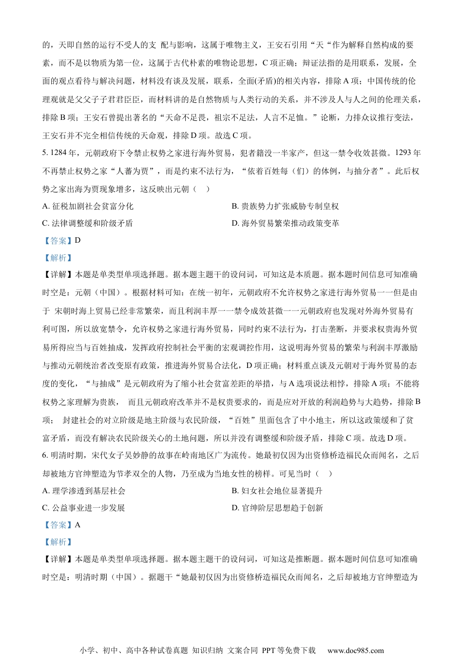 小学、初中、高中各种试卷真题知识归纳文案合同PPT等免费下载www.doc985.com重庆市2024年普通高中学业水平等级考试历史本卷满分100分,考试时间75分钟。注意事项:1.答卷前,考生务必将自己的姓名、准考证号填写在答题卡上。2.回答选择题时,选出每小题答案后,用铅笔把答题卡上对应题目的答案标号涂黑。如需改动,用橡皮擦干净后,再选涂其他答案标号。回答非选择题时,将答案写在答题卡上。写在本试卷上无效。3.考试结束后,将本试卷和答题卡一并交回。一、单项选择题:本题共15小题,每小题3分,共45分。在每小题给出的四个选项中,只有一项是符合题目要求的。1.新石器时代到两周时期中国各地区传统墓葬头向可概括为:“东夷及其先民尚东,楚蛮及其先民尚南,西戎及其先民尚西,华夏及其先民尚北。”关中地区凤翔西村、沣西客省庄等地西周墓多为北头向,春秋时期的墓葬多为西向头。这表明()A.西周时期华夏认同初步形成B.春秋时期深受西戎俗影响C.各族同源观念得到发展D.各地区得文化传统趋于稳固【答案】B【解析】【详解】本题是单类型单项选择题。据本题主题干的设问词,可知这是本质题。据本题时间信息可知准确时空是:新石器时代到两周时期(中国)。西周时期,关中地区(秦国地域)墓多为北头向,是为华夏代表,说明当时关中地区受中原华夏文化影响大,而春秋时期(东周)关中地区墓葬变成西向,说明这一时期关中地区已经有西戎文化的渗透,而且较为明显以至于墓朝向变化,B项正确;西周时期华夏认同初步形成说法欠妥,排除A项;材料只强调了关中地区一个地方的变化,至于其他民族和少数民族的变化没有提及,所以该选项判断为与材料无关,无中生有,排除C项;趋于稳固说法过于绝对,材料谈到关中地区的丧葬文化变化,变化与维持稳定说法矛盾,而且材料没有谈到其他地区的文化传统变化与否,排除D项。故选B项。2.北魏均田令规定,奴婢按骗户民标准授田,但要求“奴从耕,婢从织”。北齐均田令规定奴婢限外不课田者皆不输”。隋承齐制,大业元年(605)又规定“除妇人及奴婢,部曲(依附民)之课”。这意味着()A.均田制遭破坏B.北齐奴婢不再授田C.承担赋役是授田前提D.隋代废除定额租调小学、初中、高中各种试卷真题知识归纳文案合同PPT等免费下载www.doc985.com【答案】C【解析】【详解】本题是单类型单项选择题。据本题主题干的设问词,可知这是本质题。据本题时间信息可知准确时空是:北魏到隋朝(中国)。均田令要求:如果不缴纳田税,则不会被授田(课是指的田税);同时,隋朝也规定,缺乏劳动力的群体被免除了田税,所以更加要求了劳动力人口进行田税上缴,因此得出承担赋役是授田前提,C项正确;材料逻辑是要求承担课税与授田的统一性,而不是强调均田制遭到破坏,后者的表现应该是土地兼并日益严重,而材料并未提及隋朝土地兼并情况,排除A项;北齐均田令要求是,没有接受授田的奴婢不用上缴赋税,这反向说明有一部分奴婢是承担了赋税义务并因此获得了土地的,排除B项;定额租调是按照租种土地面积,规定佃户每年应交一定数额的地租,而材料并未谈及地主或者国家这么规定收地租,排除D项。故选C项。3.唐朝为边疆防御节度使,每个节度使领属数万军队,兵将形成长期密切的关系。节度使的设置缓解了边疆外族势力对朝廷的压力,然而天宝年间发生了安史之乱。这说明节度使()A.制度具有重大的缺陷B.由蕃将充任是严重失误C.没有边地军队调兵权D.打破了外重内轻的局面【答案】A【解析】【详解】本题是单类型单项选择题。据本题主题干的设问词,可知这是本质题。据本题时间信息可知准确时空是:唐朝(中国)。根据材料“唐朝为边疆防御节度使,每个节度使领属数万军队,兵将形成长期密切的关系。”并结合所学可知,唐朝时,设置节度使,加强边防力量,赋予节度使较大权力,节度使最终形成尾大不掉,违背了初衷,削弱中央集权。随着唐朝的逐渐衰落以及节度使势力日益坐大,中央政府难以掌控住地方,故而演变为藩镇割据,可见节度使制度具有重大的缺陷,A项正确;节度使本身是为了加强边防,也必须由蕃将充任,只是这一制度下,缺乏制衡和监督,排除B项;节度使手中实权很大,...