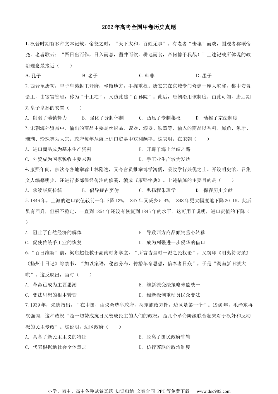 小学、初中、高中各种试卷真题知识归纳文案合同PPT等免费下载www.doc985.com2022年高考全国甲卷历史真题1.汉晋时期有多种文本记载,帝尧之时,“天下太和,百姓无事”。有老者“击壤”而戏,围观者称颂帝尧。老者歌云:“吾日出而作,日入而息,凿井而饮,耕地而食,帝何德于我哉!”上述记载所体现的政治理念最接近()A.孔子B.老子C.韩非D.墨子2.西晋至唐初,皇子皇弟封王开府,坐镇地方,手握重权。唐玄宗在京城专门修建一座大宅邸,集中安置诸王,由宦官管理,称为“十王宅”,又仿此建“百孙院”。此后,唐朝沿用该制度。由此可知,唐后期对皇子皇孙的安置()A.削弱了藩镇势力B.强化了分封体制C.凸显了专制集权D.动摇了宗法制度3.宋朝海外贸易中,输出的商品主要是丝织品、瓷器、漆器、铁器等,输入的商品以香料、犀角、象牙、珊瑚、珍珠等为大宗。政府每年从海上进口贸易中获利颇丰。这表明,在宋朝()A.进口商品成为基本生产资料B.开辟了海上丝绸之路C.外贸成为国家税收主要来源D.手工业生产较为发达4.康熙年间,多次令各地举荐山林隐逸,又令官员推举博学鸿儒,吸收学行兼优之士。开设明史馆,召集文人编纂明史,还进行多部儒经传注的修纂,编成《康熙字典》。上述措施的主要目的是()A.承续华夏传统B.倡导疑古辨伪C.弘扬程朱理学D.保存历史文献5.1846年,上海的进口货值较前一年下降13%,1847年又减少5.4%,1848年更大幅度地下降20.1%。此后虽有回升,但极不稳定,一直到1854年还没有恢复到1845年的水平。这可用于说明,进口货值的下降()A.阻止了自然经济的解体B.导致西方商品倾销重心转移C.促使传统手工业的恢复D.成为列强进一步侵华的借口6.“百日维新”前,梁启超任教于湖南时务学堂,“所言皆当时一派之民权论”,又窃印《明夷待访录》《扬州十日记》等禁书,“加以案语,秘密分布,传播革命思想,信奉者日众”,于是“湖南新旧派大哄”。这反映出,当时()A.革命已成为主要思潮B.维新派变法策略未能统一C.变法思想的根本转变D.维新派侧重动员民众变法7.1939年,朱德指出,“在中国,由议会选举政府,决定施政方针,边区是第一个”。1940年,毛泽东再次强调,这种政权“是一切赞成抗日又赞成民主的人们的政权,是几个革命阶级联合起来对于汉奸和反动派的民主专政”。这说明,边区政府()A.具备了新民主主义的特征B.脱离了国民政府管辖C.代表根据地社会全体意志D.仿行苏联的政治制度小学、初中、高中各种试卷真题知识归纳文案合同PPT等免费下载www.doc985.com8.图3为1978年和1987年全国社会商品零售总额中各经济成分所占比重图。图示占比变化反映出()A.经济体制改革目标的实现B.民众就业观念的转变C.计划管理调控作用的增强D.经济结构调整的完成9.梭伦为了鼓动雅典人重开争夺萨拉米斯岛之战,在广场上当众朗诵自己的诗歌,促使雅典人废除了禁止公民提议争夺萨拉米斯岛的法律。某主战派统帅在战前说服雅典人把金钱用于建造海军,在战时又说服雅典人留在萨拉米斯。出现这种现象的主要原因是()A.领袖人物具有绝对权威B.平民与贵族的关系融洽C.智者学派雄辩术的普及D.公民直接参与城邦事务33.10.表1进口货物占总货物的价值比(%)1664-16701731-1740年胡椒20.14.3茶叶0.029.26咖啡0.635.35棉纺织品62.5965.35表1是学者统计的17-18世纪英国东印度公司进口的部分亚洲货物价值占比。据表可知,该时期()A.生产方式决定进口货物价值占比B.英国确立海上贸易的霸主地位C.殖民扩张推动了消费结构的变化D.工业革命促进东西方贸易增长11.蒸汽机发明后,日益成为欧美国家雇佣大农场机器动力的重要来源,需要多人协同操作。20世纪初,农业机器的使用变得个人化、小型化,家庭农场在劳动生产率方面缩小了与雇佣大农场的差距,后者日趋衰落。这一系列变化表明()小学、初中、高中各种试卷真题知识归纳文案合同PPT等免费下载www.doc985.comA.内燃机的应用改变农业生产组织形式B.农业技术发展导致失业人口大量增加C.蒸汽机成为农业生产的机器动力来源D.农业生产效率的提高依赖于生产规模12.1951年,美国黑人团体民权大会向联合国发起请愿活动,指控美国政府对黑人犯有种族灭...