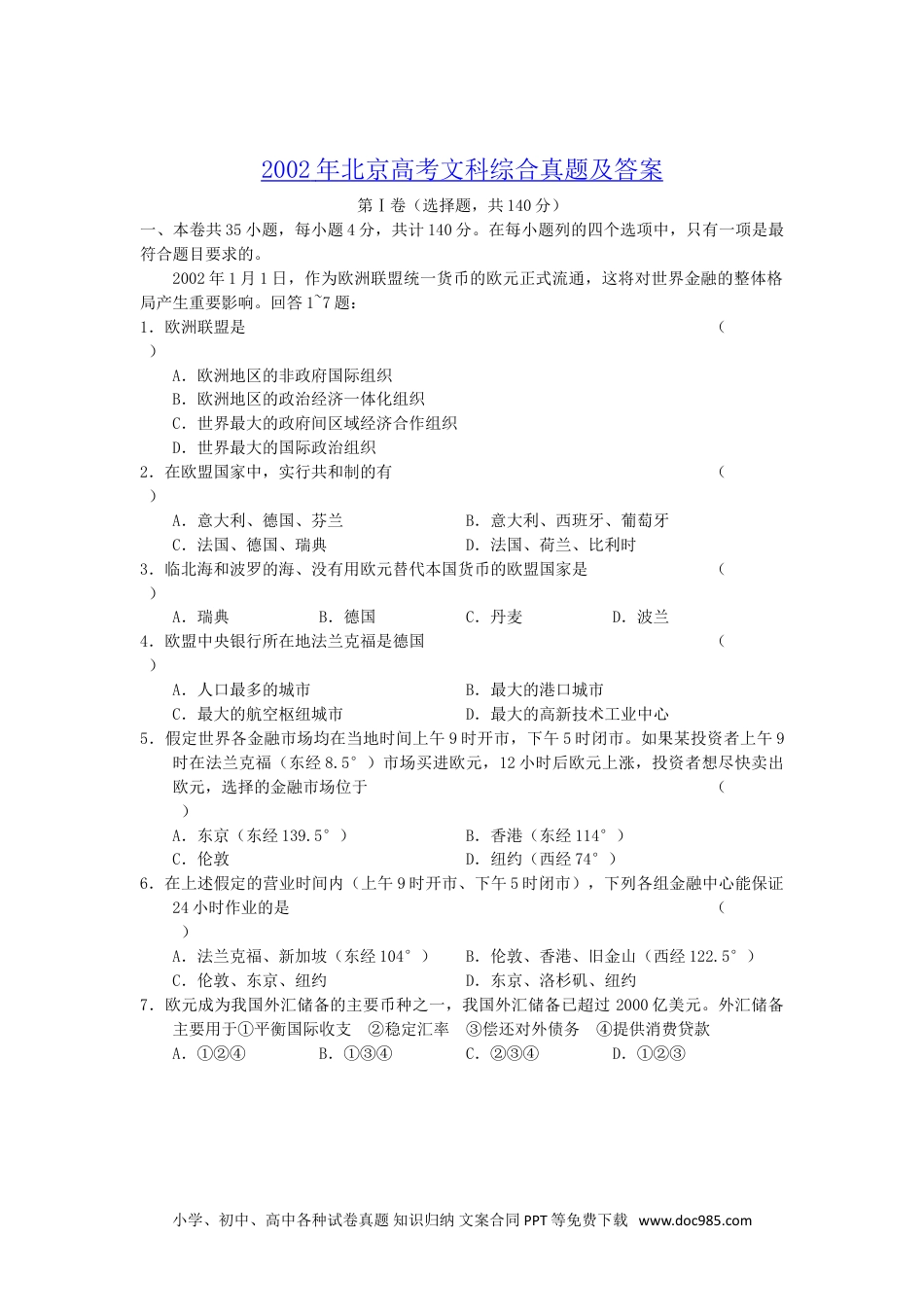 2002年北京高考文科综合真题及答案第Ⅰ卷(选择题,共140分)一、本卷共35小题,每小题4分,共计140分。在每小题列的四个选项中,只有一项是最符合题目要求的。2002年1月1日,作为欧洲联盟统一货币的欧元正式流通,这将对世界金融的整体格局产生重要影响。回答1~7题:1.欧洲联盟是()A.欧洲地区的非政府国际组织B.欧洲地区的政治经济一体化组织C.世界最大的政府间区域经济合作组织D.世界最大的国际政治组织2.在欧盟国家中,实行共和制的有()A.意大利、德国、芬兰B.意大利、西班牙、葡萄牙C.法国、德国、瑞典D.法国、荷兰、比利时3.临北海和波罗的海、没有用欧元替代本国货币的欧盟国家是()A.瑞典B.德国C.丹麦D.波兰4.欧盟中央银行所在地法兰克福是德国()A.人口最多的城市B.最大的港口城市C.最大的航空枢纽城市D.最大的高新技术工业中心5.假定世界各金融市场均在当地时间上午9时开市,下午5时闭市。如果某投资者上午9时在法兰克福(东经8.5°)市场买进欧元,12小时后欧元上涨,投资者想尽快卖出欧元,选择的金融市场位于()A.东京(东经139.5°)B.香港(东经114°)C.伦敦D.纽约(西经74°)6.在上述假定的营业时间内(上午9时开市、下午5时闭市),下列各组金融中心能保证24小时作业的是()A.法兰克福、新加坡(东经104°)B.伦敦、香港、旧金山(西经122.5°)C.伦敦、东京、纽约D.东京、洛杉矶、纽约7.欧元成为我国外汇储备的主要币种之一,我国外汇储备已超过2000亿美元。外汇储备主要用于①平衡国际收支②稳定汇率③偿还对外债务④提供消费贷款A.①②④B.①③④C.②③④D.①②③小学、初中、高中各种试卷真题知识归纳文案合同PPT等免费下载www.doc985.com读图1,回答8~10题:8.M处的气压数值可能为()A.1020、1012.5B.1017.5、1020C.1017.5、1015D.1015、1012.59.N处的盛行风向不可能是()A.南风B.西风C.西南风D.东北风10.图示地区4月份因大陆气团与海洋气团交绥而降水较多的地方为()A.①B.②C.③D.④读图2,回答11~12题:11.图2中,影响等值线向外海凸出的主要因素是()A.降水B.暖流C.寒流D.径流12.在等值线的年内变动中,Q点(2.8等值线上的最东点)距大陆最近的时段是()A.2月B.5月C.7月D.10月增加绿化面积是解决城市环境问题的重要途径之一。回答13~14题:13.在大城市提倡的营建“绿色屋顶”和“绿色阳台”,其改善环境的主要作用是()A.减少城市的噪声和光污染B.减轻热岛效应和美化环境C.减轻光化学烟雾的污染D.降低空气中可吸入颗粒物的数量14.我国北方一些城市在城市绿化中因使用杀虫剂而污染了地下水,下列绿化方式中污染最为严重的是()A.落叶阔叶树林B.常绿针叶树林C.“绿色屋顶”和“绿色阳台”D.人工草地我国自古以来就有同世界各国进行经济文化友好往来的传统。回答15—18题:15.自唐至清,长期作为重要对外贸易港口的城市是()A.扬州B.泉州C.明州D.广州16.唐朝管理对外贸易的机构是()A.市舶使B.总税务司C.澎湖巡检司D.理藩司17.下列各项,属于我国古代学习、吸收了外国经济文化成果的是(小学、初中、高中各种试卷真题知识归纳文案合同PPT等免费下载www.doc985.com)①《缀术》②唐乐③熬糖法④班田制A.①②B.①③C.②③D.③④18.十一届三中全会以后,我国实行对外开放的根本目的是()A.建立和完善社会主义市场经济体制B.扩大对外贸易,吸引外资C.发展我国的社会主义经济D.尽快加入世界贸易组织(WTO)19.20世纪50年代,著名话剧《茶馆》和《等待戈多》的上演均引起轰动。它们的共同之处是()A.属于现实主义的文艺作品B.具有强烈的社会批判精神C.描写了社会历史的演变D.反映了当代人的精神创伤历史上发生过无数次战争,对人类社会产生巨大影响。回答20~22题:20.在国际战争中失败往往直接引起国内的革命运动,这方面的例证是()A.美西战争B.普法战争C.拿破仑战争D.意埃战争21.20世纪的两次世界大战给人类造成巨大灾难,使这两次世界性大战得以发生的因素是()①少数大国争夺世界霸权②以欧洲为中心的国际格局开始发生变化③军...