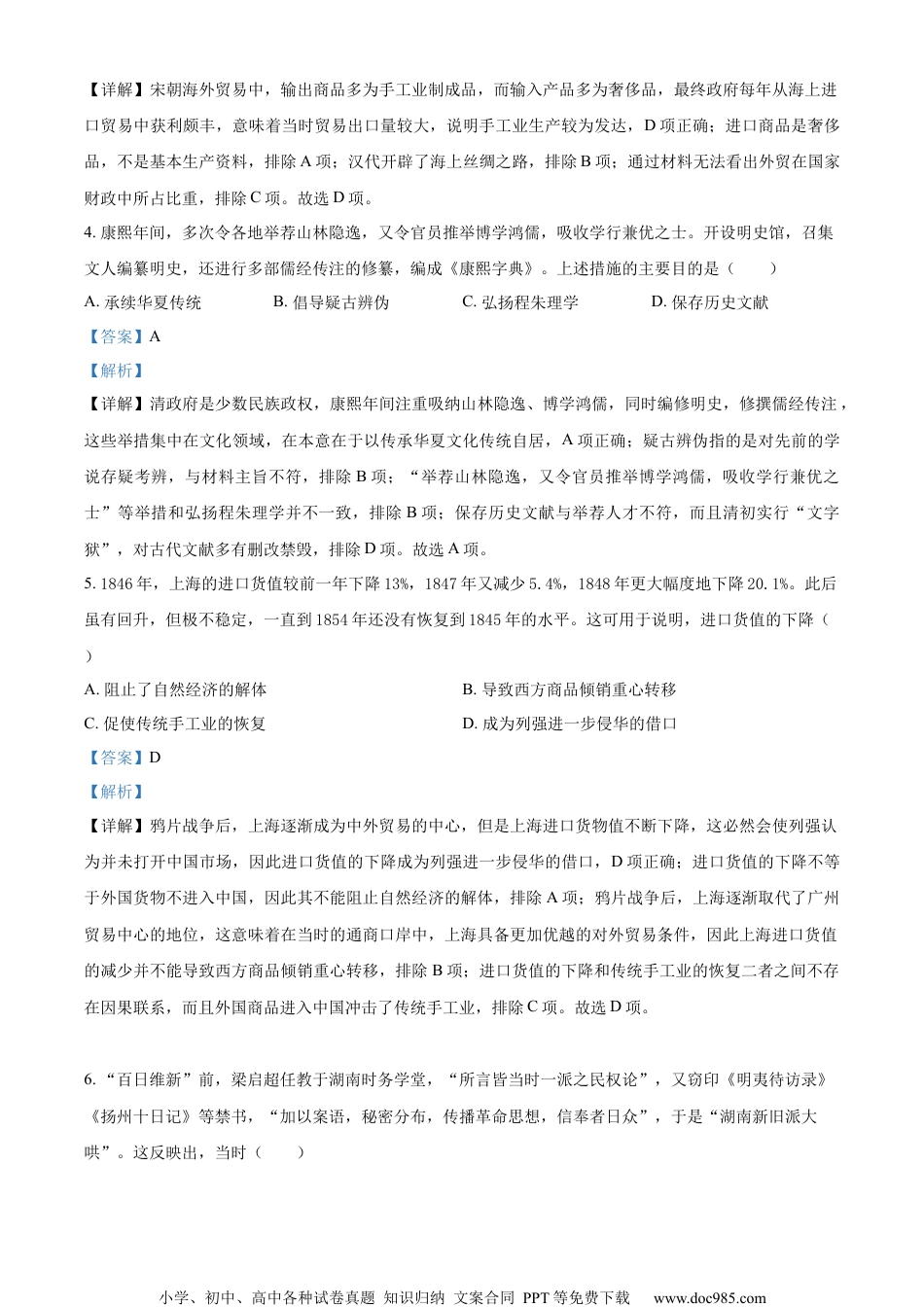 小学、初中、高中各种试卷真题知识归纳文案合同PPT等免费下载www.doc985.com2022年高考全国甲卷历史真题1.汉晋时期有多种文本记载,帝尧之时,“天下太和,百姓无事”。有老者“击壤”而戏,围观者称颂帝尧。老者歌云:“吾日出而作,日入而息,凿井而饮,耕地而食,帝何德于我哉!”上述记载所体现的政治理念最接近()A.孔子B.老子C.韩非D.墨子【答案】B【解析】【详解】材料“吾日出而作,日入而息,凿井而饮,耕地而食”体现了当时人与自然的和谐,反映了老子“顺应自然”的思想,“百姓无事”“帝何德于我哉”反映了百姓生活较少受到干预,反映了“无为”的思想,B项正确;孔子主张仁、礼、以德治国,材料信息没有体现,排除A项;韩非主张加强君主专制和中央集权,主张法治,材料信息没有体现,排除C项;墨子主张兼爱、非攻、尚贤等思想,材料没有体现,排除D项。故选B项。【点睛】本题以《壤父歌》及相关故事为素材,考查老子的思想,揭示先贤对幸福生活的定义,意在启发学生今后的生活和学习。(摘编自教育部教育考试院:2022年高考历史全国卷试题评析)2.西晋至唐初,皇子皇弟封王开府,坐镇地方,手握重权。唐玄宗在京城专门修建一座大宅邸,集中安置诸王,由宦官管理,称为“十王宅”,又仿此建“百孙院”。此后,唐朝沿用该制度。由此可知,唐后期对皇子皇孙的安置()A.削弱了藩镇势力B.强化了分封体制C.凸显了专制集权D.动摇了宗法制度【答案】C【解析】【详解】根据“唐玄宗在京城专门修建一座大宅邸,集中安置诸王,由宦官管理,称为‘十王宅’,又仿此建‘百孙院’”可得出唐后期对皇子皇孙的安置削弱了皇子的权力与势力,是加强专制的体现。C项正确;材料并没有针对藩镇,排除A项;分封制在春秋时期逐步瓦解,排除B项;宗法制度瓦解于春秋战国时期,排除D项。故选C项。3.宋朝海外贸易中,输出的商品主要是丝织品、瓷器、漆器、铁器等,输入的商品以香料、犀角、象牙、珊瑚、珍珠等为大宗。政府每年从海上进口贸易中获利颇丰。这表明,在宋朝()A.进口商品成为基本生产资料B.开辟了海上丝绸之路C.外贸成为国家税收主要来源D.手工业生产较为发达【答案】D【解析】小学、初中、高中各种试卷真题知识归纳文案合同PPT等免费下载www.doc985.com【详解】宋朝海外贸易中,输出商品多为手工业制成品,而输入产品多为奢侈品,最终政府每年从海上进口贸易中获利颇丰,意味着当时贸易出口量较大,说明手工业生产较为发达,D项正确;进口商品是奢侈品,不是基本生产资料,排除A项;汉代开辟了海上丝绸之路,排除B项;通过材料无法看出外贸在国家财政中所占比重,排除C项。故选D项。4.康熙年间,多次令各地举荐山林隐逸,又令官员推举博学鸿儒,吸收学行兼优之士。开设明史馆,召集文人编纂明史,还进行多部儒经传注的修纂,编成《康熙字典》。上述措施的主要目的是()A.承续华夏传统B.倡导疑古辨伪C.弘扬程朱理学D.保存历史文献【答案】A【解析】【详解】清政府是少数民族政权,康熙年间注重吸纳山林隐逸、博学鸿儒,同时编修明史,修撰儒经传注,这些举措集中在文化领域,在本意在于以传承华夏文化传统自居,A项正确;疑古辨伪指的是对先前的学说存疑考辨,与材料主旨不符,排除B项;“举荐山林隐逸,又令官员推举博学鸿儒,吸收学行兼优之士”等举措和弘扬程朱理学并不一致,排除B项;保存历史文献与举荐人才不符,而且清初实行“文字狱”,对古代文献多有删改禁毁,排除D项。故选A项。5.1846年,上海的进口货值较前一年下降13%,1847年又减少5.4%,1848年更大幅度地下降20.1%。此后虽有回升,但极不稳定,一直到1854年还没有恢复到1845年的水平。这可用于说明,进口货值的下降()A.阻止了自然经济的解体B.导致西方商品倾销重心转移C.促使传统手工业的恢复D.成为列强进一步侵华的借口【答案】D【解析】【详解】鸦片战争后,上海逐渐成为中外贸易的中心,但是上海进口货物值不断下降,这必然会使列强认为并未打开中国市场,因此进口货值的下降成为列强进一步侵华的借口,D项正确;进口货值的下降不等于外国货物不进入中国,因此其不能阻止自然经济的解体,排除A项;鸦片战...