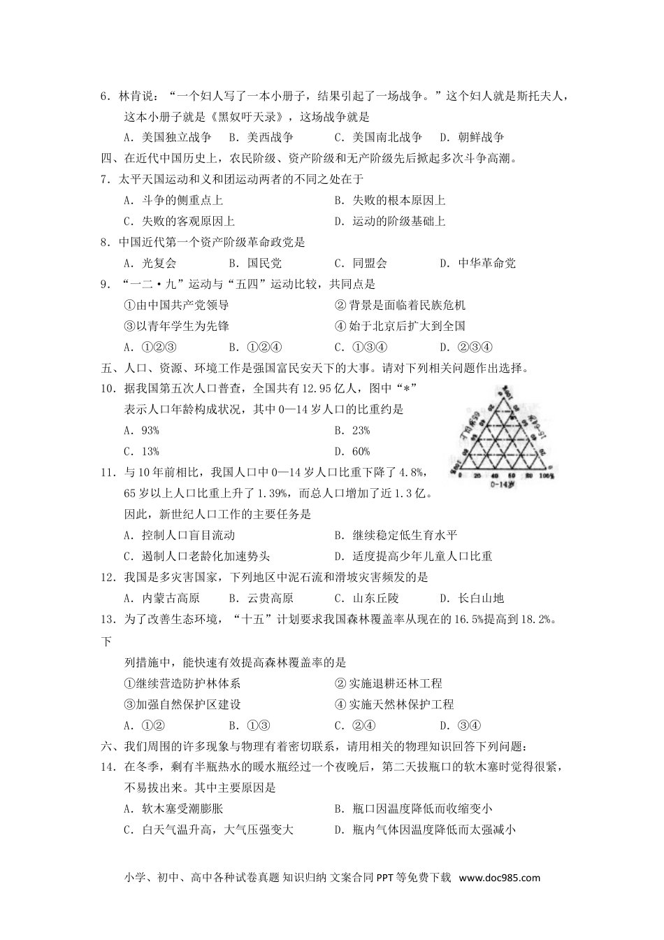 2001年北京高考文综真题及答案第Ⅰ卷(共75分)一、《走进新时代》的歌词(节选):“我们唱着东方红,当家作主站起来;我们讲着春天的故事,改革开放富起来;继往开来的领路人,带领我们走进新时代,高举旗帜开创未来。”1.上述歌词反映的事实证明了①党的领导是关系我们国家前途和命运的根本问题②党具有组织和领导社会主义现代化建设的国家职能③党的领导是我国社会主义现代化建设取得成功的根本保证④党带领我们开创了一条具有中国特色社会主义的建设道路A.①②③B.①②④C.①③④D.②③④2.上述歌词体现的哲学观点是①事物的发展总是一帆风顺的②事物在不同发展阶段上的矛盾具有特殊性③前进性是事物发展的总方向④发展的观点是唯物辩证法最基本的特征之一A.①②③B.①②④C.①③④D.②③④二、青年学生应该关注生活、关注社会。3.2001年3月15日,九届全国人大四次会议审议通过《中华人民共和国国民经济和社会发展第十个五年计划纲要》。这表明全国人民代表大会行使了A.最高决定权B.最高立法权C.最高任免权D.最高监督权4.2001年2月,上海市电力公司按时段收取电费的措施正式出台。经市政府批准,峰时电价0.61元/度,谷时电价0.35元/度。此项措施表明A.竞争是市场经济的基本特征B.消费的需求决定了电力的价格C.市场价格能引导生产和消费,有利于供需平衡D.市政府制定了一项跨越时间较短的全局性政策三、随着工业革命的发展,资本主义开始成为一个世界体系。5.19世纪中期,一些主要欧美国家殊途同归,发展了资本主义。下列国家中通过改革走上资本主义道路的是A.俄国B.美国C.德国D.法国小学、初中、高中各种试卷真题知识归纳文案合同PPT等免费下载www.doc985.com6.林肯说:“一个妇人写了一本小册子,结果引起了一场战争。”这个妇人就是斯托夫人,这本小册子就是《黑奴吁天录》,这场战争就是A.美国独立战争B.美西战争C.美国南北战争D.朝鲜战争四、在近代中国历史上,农民阶级、资产阶级和无产阶级先后掀起多次斗争高潮。7.太平天国运动和义和团运动两者的不同之处在于A.斗争的侧重点上B.失败的根本原因上C.失败的客观原因上D.运动的阶级基础上8.中国近代第一个资产阶级革命政党是A.光复会B.国民党C.同盟会D.中华革命党9.“一二·九”运动与“五四”运动比较,共同点是①由中国共产党领导②背景是面临着民族危机③以青年学生为先锋④始于北京后扩大到全国A.①②③B.①②④C.①③④D.②③④五、人口、资源、环境工作是强国富民安天下的大事。请对下列相关问题作出选择。10.据我国第五次人口普查,全国共有12.95亿人,图中“*”表示人口年龄构成状况,其中0—14岁人口的比重约是A.93%B.23%C.13%D.60%11.与10年前相比,我国人口中0—14岁人口比重下降了4.8%,65岁以上人口比重上升了1.39%,而总人口增加了近1.3亿。因此,新世纪人口工作的主要任务是A.控制人口盲目流动B.继续稳定低生育水平C.遏制人口老龄化加速势头D.适度提高少年儿童人口比重12.我国是多灾害国家,下列地区中泥石流和滑坡灾害频发的是A.内蒙古高原B.云贵高原C.山东丘陵D.长白山地13.为了改善生态环境,“十五”计划要求我国森林覆盖率从现在的16.5%提高到18.2%。下列措施中,能快速有效提高森林覆盖率的是①继续营造防护林体系②实施退耕还林工程③加强自然保护区建设④实施天然林保护工程A.①②B.①③C.②④D.③④六、我们周围的许多现象与物理有着密切联系,请用相关的物理知识回答下列问题:14.在冬季,剩有半瓶热水的暖水瓶经过一个夜晚后,第二天拔瓶口的软木塞时觉得很紧,不易拔出来。其中主要原因是A.软木塞受潮膨胀B.瓶口因温度降低而收缩变小C.白天气温升高,大气压强变大D.瓶内气体因温度降低而太强减小小学、初中、高中各种试卷真题知识归纳文案合同PPT等免费下载www.doc985.com15.在一种叫做“蹦极跳”的运动中,质量为m的游戏者身系一根长为L、弹性优良的轻质柔软橡皮绳,从高处由静止开始下落1.5L时到达最低点,若在下落过程中不计空气阻力,则以下说法正确的是A.速度先增大后减小B.加速度先减小后增大C.动能增加了mg...