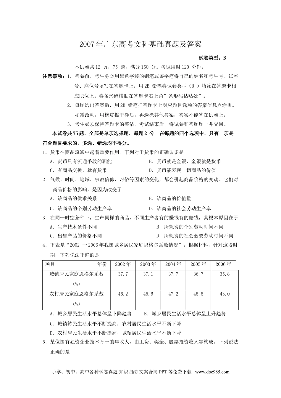 2007年广东高考文科基础真题及答案试卷类型:B本试卷共12页,75题,满分15O分。考试用时120分钟。注意事项:1.答卷前,考生务必用黑色字迹的钢笔或鉴字笔将自己的姓名和考生号、试室号、座位号填写在答题卡上。用2B铅笔将试卷类型(B)填涂在答题卡相应职位上。将条形码横贴在答题卡右上角”条形码枯贴处”。2.每题选出答案后.用2B铅笔把答题卡上对应题目选项的答案信息点涂黑。如需改动,用橡皮擦干净后,再选涂其他答案,答案不能答在试卷上。3.考生必须保持答题卡的整沽。考试结束后,将试卷和答题题一并交回。本试卷共75题,全部是单项选择题,每题2分。在每题的四个选项中,只有一项是符合题目要求的,多选、错选均不得分。1.货币在商品流通中起着重要作用。下列对于货币的正确认识是A.货币只有流通手段的职能B.货币就是金银,金银就是货币C.有商品交换,就有货币D.货币能表现一切商品的价值2.气候、时间、地域、宗教信仰、习俗等因素的变化,都会引起商品价格的变动。它们对商品价格的影响,是因为改变了A.该商品的供求关系B.该商品的价值量C.该商品的个别劳动生产率D.该商品的社会劳动生产率3.在同一时空条件下,生产同样的商品,不同生产者有的赚钱有的赔钱,其根本原因在于A.生产技术条件不同B.所耗费的个别劳动时间不同C.出售产品的价格不同D.所耗费的社会必要劳动时间不同4.下表是“2002一2006年我国城乡居民家庭思格尔系数情况”。根据材料,针对这段时期,下列说法正确的是项目年份2002年2003年2004年2005年2006年城镇居民家庭恩格尔系数(%)37.737.137.736.735.8农村居民家庭恩格尔系数(%)46.245.647.245.543.0A.城乡居民生活水平总体呈卜降趋势B.城乡居民生活水平总体呈上升趋势C.城镇转民生活水平不断提高,农村居民生活水平不断下降D.农村居民生活水平不断提高,城镇居民生活水平不断下降5.某位国有独资企业技术骨干的年收人,由工资、奖金、股票投资收入等构成。下列说法正确的是小学、初中、高中各种试卷真题知识归纳文案合同PPT等免费下载www.doc985.comA.工资、奖金、股票投资收入都属于按生产要素分配B.工资、奖金、股票投资收入都属于按劳分配C.工资、奖金属于按劳分配.股票投资收人属于按生产要素分配D.工资属于按劳分配,奖金、股票投资收人属于按生产要素分配6.十届全国人大五次会议审议通过了十一届全国人大代表名额和选举问题的决定。根据这一决定,我国将首次在农民工队伍中产生全国人大代表。这反映了我国人民民主具有①绝对性②真实性③全民性④广泛性A.①②B.②③C.②④D.①③7.据文献记载,十三届四中全会以来,各民主党派中央先后就国计民生等问题,向党中央、国务院提出重大建议200多项,各民主党派地方组织提出各项建议9万多项,其中有许多意见和建议被采纳,产生了显著的经济效益和杜会效益。这反映了A.中国共产党与各民主党派联合执政B.各民主党派参与国家事务的协商C.各民主党派决定国家的大政方针D.各民主党派直接行使国家权力8.胡锦涛总书记指出:“加强党的先进性建设,必须把最广大人民的根本利益作为党全部工作的出发点和落脚点,保证党始终与人民群众共命运。”胡锦涛总书记的上述讲话进一步强调了:①全心全意为人民服务是中国共产党的宗旨②立党为公、执政为民是中国共产党的执政理念③党执政的权力来自人民.要代表人民行使权力④依法执政是中国共产党执政的基本方式A.①②③B.②③④C.①③④D.①②④9.2006年5月9日.第六届联合国大会以不记名投票方式,选举产生了联合国人权理事会首届47个成员国,中国以146票高票当选,任期3年。这说明A.保护和促进人权,必须从加强国际人权合作人手B.选举权和被选举权是根本的人权C.中国在尊重和保降人权方面取得的成就,获得世界的认可D.实现人权的根本途径是在国际活动中获得他国的好评10.我国前外交部长李肇星指出:“我们在谋求自身发展的同时,也向其他国家提供力所能及的援助。提供援助的时候都不附加政治条件,援助是务实的。”这反映了A.我国积极发展同世界各国和地区的贸易往来B.我国与世界各国的利益完全一致C.我国提供的...
