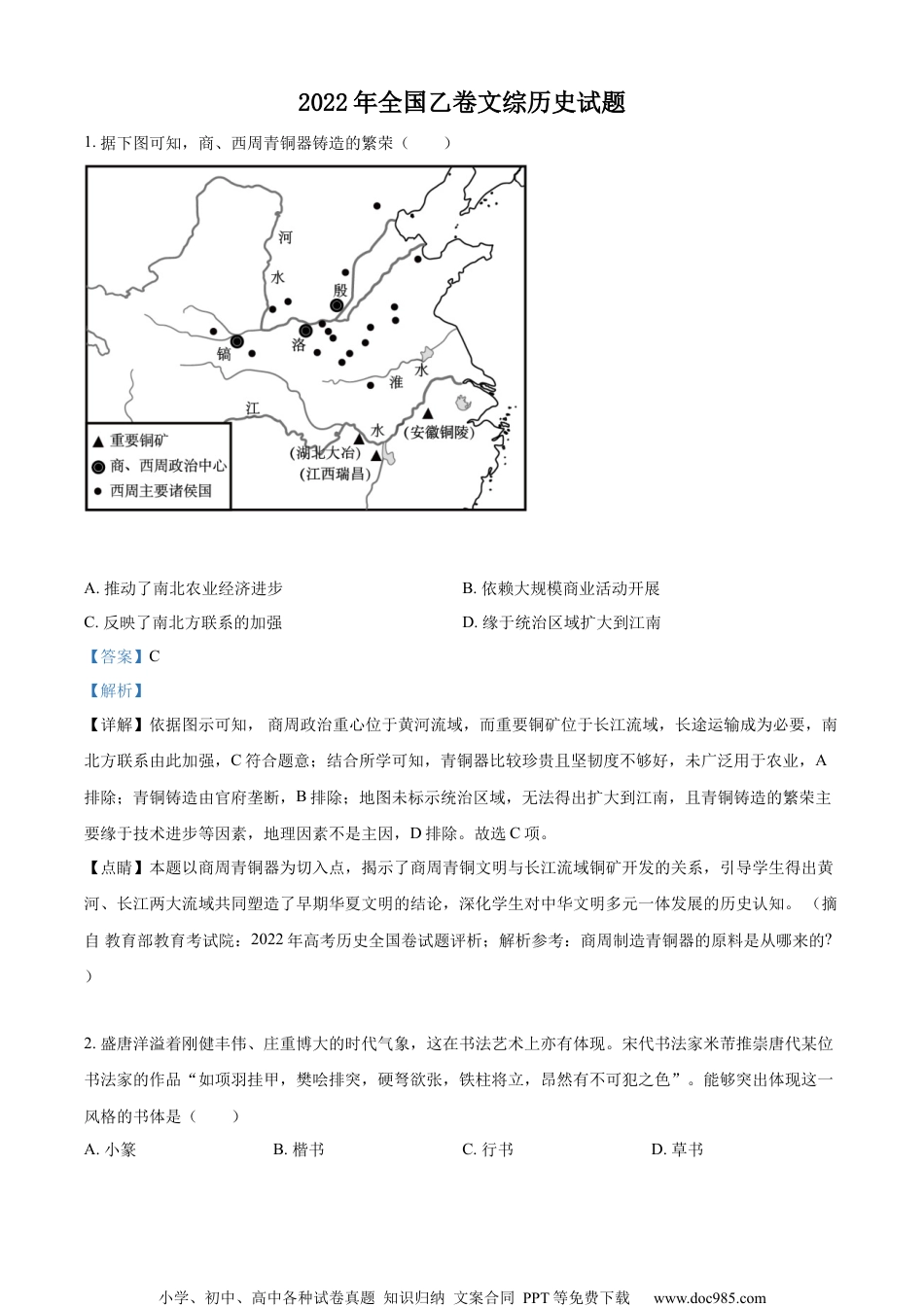 小学、初中、高中各种试卷真题知识归纳文案合同PPT等免费下载www.doc985.com2022年全国乙卷文综历史试题1.据下图可知,商、西周青铜器铸造的繁荣()A.推动了南北农业经济进步B.依赖大规模商业活动开展C.反映了南北方联系的加强D.缘于统治区域扩大到江南【答案】C【解析】【详解】依据图示可知,商周政治重心位于黄河流域,而重要铜矿位于长江流域,长途运输成为必要,南北方联系由此加强,C符合题意;结合所学可知,青铜器比较珍贵且坚韧度不够好,未广泛用于农业,A排除;青铜铸造由官府垄断,B排除;地图未标示统治区域,无法得出扩大到江南,且青铜铸造的繁荣主要缘于技术进步等因素,地理因素不是主因,D排除。故选C项。【点睛】本题以商周青铜器为切入点,揭示了商周青铜文明与长江流域铜矿开发的关系,引导学生得出黄河、长江两大流域共同塑造了早期华夏文明的结论,深化学生对中华文明多元一体发展的历史认知。(摘自教育部教育考试院:2022年高考历史全国卷试题评析;解析参考:商周制造青铜器的原料是从哪来的?)2.盛唐洋溢着刚健丰伟、庄重博大的时代气象,这在书法艺术上亦有体现。宋代书法家米芾推崇唐代某位书法家的作品“如项羽挂甲,樊哙排突,硬弩欲张,铁柱将立,昂然有不可犯之色”。能够突出体现这一风格的书体是()A.小篆B.楷书C.行书D.草书小学、初中、高中各种试卷真题知识归纳文案合同PPT等免费下载www.doc985.com【答案】B【解析】【详解】结合所学可知唐代楷书盛行,楷书具有字体方正、笔画工整、遒劲有力的特点,与材料形象化的描述相符,B项正确;小篆是秦朝时期的字体,且篆书比较舒朗,具有曲线美,排除A项;行书与草书都具有灵活、流动的特点,以适意为主,不要太受法度之限制,与材料信息不相符,排除CD项。故选B项。【点睛】本题围绕盛唐书法的时代气象和艺术风格创设情境,彰显了书法艺术承载的美学理念,引导学生培养审美感受力和领悟力,提高对美的鉴赏能力。(摘自教育部教育考试院:2022年高考历史全国卷试题评析)3.宋朝在州府设通判,重要州府设两名,民户少的州可以不置,但若武官任知州,则必置。通判有自己专属的衙门通判厅,与知州(府)共议政务、同署文书,“有军旅之事,则专任钱粮之责”。据此可知,设置通判的主要目的是()A.规范地方行政B.防止武人干政C.提升军事能力D.削弱州府权力【答案】A【解析】【详解】题干信息重点阐释了通判的建制员额、职责权限,通判的设置起到了协理政事、审核把关、权力监督及制衡等作用,有助于行政程序规范化和流程化、弥补知州(知府)不足之处、避免出现重大失误以及防止权力的滥用、误用,因此设置通判的主要目的在于规范地方行政,A项正确;“干政”是指干预朝政(中央权力),题干信息说的是地方,此外任知州的一般是文官,武官担任较少,说通判主要目的是为了防武人,显得多此一举,B排除;通判一般都是文官,且相互制约,不能提升军事能力,排除C项﹔通判与知州一起行使州府权力,州府总体权力未变,只是分散了,削弱的不是州府,而是知州,排除D项。故选A项。【点睛】本题围绕宋代官职“通判”的概念展开,通过对通判的建制员额、职责权限等进行阐述,从规范地方行政的角度考查通判设置的目的,学生只有深入理解“通判”这一概念的内涵和外延(通判协政理事,任责督察),方能准确作答。本题可尝试从“副手”、“参谋”、“审核员”“监督员”等身份理解通判。(改编自教育部教育考试院:2022年高考历史全国卷试题评析)4.明后期有士人称,江南流行“好名喜夸”之风,家中但凡有千金之产,必定会营建一园,“近聚土壤,远延木石,聊以矜眩于一时耳”,但“俗气扑人”。这可用于说明()A.士大夫传统观念的颠覆B.世俗化审美趣味的初现C.士农工商社会结构解体D.江南市镇工商业的繁荣【答案】D小学、初中、高中各种试卷真题知识归纳文案合同PPT等免费下载www.doc985.com【解析】【详解】结合所学可知,明后期随着商品经济的发展,江南地区出现了资本主义萌芽、市镇普遍兴起,市镇经济对传统的社会意识、当地风俗产生冲击,形成了“好名喜夸”之风,D项正确;“颠覆”表述过于绝对,士大夫...