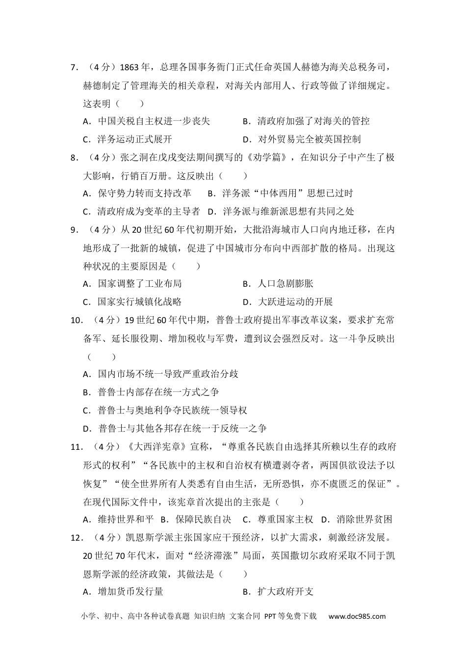 小学、初中、高中各种试卷真题知识归纳文案合同PPT等免费下载www.doc985.com2013年全国统一高考历史试卷(大纲版)一、选择题(共12小题,每小题4分,满分48分)1.(4分)中国历史上有监察区转为行政区的现象,如汉代的州、唐代的道、宋代的路。这体现出()A.中央集权促成地方行政制度变迁B.经济发展导致地方行政区域调整C.中央对地方的监察力度越来越弱D.疆域变化影响地方行政区域设置2.(4分)汉文帝说:“盖天下万物之萌生,靡有不死。死者天地之理,物之自然,奚可甚哀…厚葬以破业,重服以伤生,吾甚不取。”汉文帝在此强调的是()A.无为而治B.轻徭薄赋C.崇尚节俭D.民贵君轻3.(4分)范仲淹倡导的“庆历新政”与王安石变法的共同目的是改变北宋“积贫”“积弱”的现状,而“庆历新政”更侧重于()A.增加赋税B.澄清吏治C.培养人才D.充实边防4.(4分)《窦娥冤》揭露封建统治的黑暗,《水浒传》颂扬农民起义英雄杀富济贫。这反映了()A.封建社会的腐朽没落B.“异端”思想影响广泛C.普通民众的理想与愿望D.商业发展冲击传统观念5.(4分)明初的户役制度,将户籍分为若干类别,其中主要是民户,还有军户、匠户、灶户(煮盐户)等几十类,并严格禁止更换户别。这一措施有利于()A.缓和土地兼并B.促成社会分化C.强化社会控制D.发展商品经济6.(4分)乾隆三十七年,台湾海防同知朱景英称:“台地多用宋钱,如太平、元祜、天禧、至道等年号钱,钱质小薄,千钱贯之。”据此可知()A.宋代商品经济比清代更为繁荣B.当时两岸经济交往尚不密切C.海峡两岸有着不同的货币体系D.宋代以后台湾经济发展迟缓小学、初中、高中各种试卷真题知识归纳文案合同PPT等免费下载www.doc985.com7.(4分)1863年,总理各国事务衙门正式任命英国人赫德为海关总税务司,赫德制定了管理海关的相关章程,对海关内部用人、行政等做了详细规定。这表明()A.中国关税自主权进一步丧失B.清政府加强了对海关的管控C.洋务运动正式展开D.对外贸易完全被英国控制8.(4分)张之洞在戊戌变法期间撰写的《劝学篇》,在知识分子中产生了极大影响,行销百万册。这反映出()A.保守势力转而支持改革B.洋务派“中体西用”思想已过时C.清政府成为变革的主导者D.洋务派与维新派思想有共同之处9.(4分)从20世纪60年代初期开始,大批沿海城市人口向内地迁移,在内地形成了一批新的城镇,促进了中国城市分布向中西部扩散的格局。出现这种状况的主要原因是()A.国家调整了工业布局B.人口急剧膨胀C.国家实行城镇化战略D.大跃进运动的开展10.(4分)19世纪60年代中期,普鲁士政府提出军事改革议案,要求扩充常备军、延长服役期、增加税收与军费,遭到议会强烈反对。这一斗争反映出()A.国内市场不统一导致严重政治分歧B.普鲁士内部存在统一方式之争C.普鲁士与奥地利争夺民族统一领导权D.普鲁士与其他各邦存在统一于反统一之争11.(4分)《大西洋宪章》宣称,“尊重各民族自由选择其所赖以生存的政府形式的权利”“各民族中的主权和自治权有横遭剥夺者,两国俱欲设法予以恢复”“使全世界所有人类悉有自由生活,无所恐惧,亦不虞匮乏的保证”。在现代国际文件中,该宪章首次提出的主张是()A.维持世界和平B.保障民族自决C.尊重国家主权D.消除世界贫困12.(4分)凯恩斯学派主张国家应干预经济,以扩大需求,刺激经济发展。20世纪70年代末,面对“经济滞涨”局面,英国撒切尔政府采取不同于凯恩斯学派的经济政策,其做法是()A.增加货币发行量B.扩大政府开支小学、初中、高中各种试卷真题知识归纳文案合同PPT等免费下载www.doc985.comC.推行国有企业民营化D.增加政府税收二、解答题(共2小题,满分92分)13.(32分)阅读材料,完成下列要求。材料一孟德斯鸠(16891755﹣)曾任波尔多市法院院长,后遍游欧洲,考察各国制度,潜心著述。他认为,专制就是君王集一切权力于一身,“完全按照自己一个人一时的与反复无常的意志行事”“法律等于零”。专制君王依靠唯上是从的官吏做爪牙,借助庞大军队和严峻刑罚进行统治,可任意征收重税、没收个人财产。在此制度下,“...
