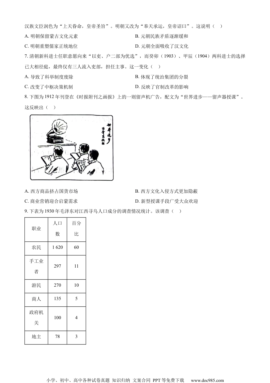 小学、初中、高中各种试卷真题知识归纳文案合同PPT等免费下载www.doc985.com2024年湖南省普通高中学业水平选择性考试历史一、选择题:本题共16小题,每小题3分,共48分。在每小题给出的四个选项中,只有一项是符合题目要求的。1.西周时期,国人可以对军国大事发表意见,甚至能够影响国君废立,但不能改变宗主世袭制,更换国君不过是更换宗主。这说明西周()A.军国大事取决于国人B.血缘政治色彩浓厚C.王权与神权紧密结合D.宗法制度遭到破坏2.据史料记载,秦人“畏有司而顺”,楚人“好游侠”“易发怒”。秦末,六国旧地都出现了反秦斗争,其中楚地声势最大,反应最为激烈。这可用于()A.证实秦对楚地的统治最为严苛B.说明秦楚之间文化冲突无法弥合C.证明秦朝的制度不适用于楚地D.解释汉初推行郡国并行制的原因3.下表为史籍所载东汉至南朝时期官府掌握的湖南地区户口数和人口数。其变化的主要原因是()时间户口数(万)人口数(万)东汉永和五年(140)64.98281.32西晋太康初年(280-289)14.2385.39南朝宋昇明三年(479)4.1933.48A.大规模的瘟疫流行B.战乱异常频繁C.豪强大族势力膨胀D.官府组织移民4.敦煌文书多见唐中叶以后的雇工契,如唐宣宗大中八年(854)某人雇长工,契约中写明工期和酬劳,规定受雇者必须认真劳作,不得旷工,“若先悔者,罚青麦十驮”。由此可推知当时()A.雇工经营成为主要经营方式B.国家对农民人身控制减弱C.小农经济仍然占据主导地位D.商品经济得到了快速发展5.唐末以后出现的新藩镇,其军队主要靠强迫征发而来,难以结成牢固的军人集团。到后周时,中央禁军成为最强大的力量。这些变化()A.有利于中央集权体制的重建B.从源头消除了藩镇割据现象C.促进了政府行政效率的提高D.使重文轻武观念逐渐被接受6.元朝圣旨多采用蒙古语法糅合汉语词汇的形式,开篇曰“长生天气力里,大福荫互助里,皇帝圣旨”。小学、初中、高中各种试卷真题知识归纳文案合同PPT等免费下载www.doc985.com汉族文臣润色为“上天眷命,皇帝圣旨”。明朝又改为“奉天承运,皇帝诏曰”。这说明()A.明朝保留蒙古文化元素B.元朝民族矛盾逐渐缓和C.明朝重塑儒家正统地位D.元朝全面吸收了汉文化7.清朝新科进士任职意愿向来“以吏、户二部为优选”,而癸卯(1903)、甲辰(1904)两科进士的选择已大相径庭,最终仅有三人流入吏部,担任主事。这一变化()A.导致了科举制度废除B.体现了统治集团的分裂C.改变了中枢决策机制D.反映了官制改革的影响8.下图为1912年刊登在《时报附刊之画报》上的一则留声机广告,配文为“世界进步——留声器授课”。这反映出()A.西方商品挤占国货市场B.西方文化入侵方式更加隐蔽C.商业营销迎合启蒙需求D.新型授课手段广受大众欢迎9.下表为1930年毛泽东对江西寻乌人口成分的调查情况统计。该调查()职业人口数百分比农民162060手工业者29711游民27010商人1355政府机关1004地主783小学、初中、高中各种试卷真题知识归纳文案合同PPT等免费下载www.doc985.com其他1847共计2684100A.阐明了中国革命的性质B.有助于粉碎国民党的“围剿”C.明确了革命的领导力量D.有利于制定正确的斗争策略10.新中国成立初期,很多农民不愿对同宗同姓的地主展开斗争,认为“卖命不卖姓”。随着土地改革深入农民中逐渐流行“天下农民是一家”“庄稼人向着庄稼人”的说法。这反映出土地改革()A.改造了农村基层组织结构B.推动了农村宗族观念消亡C.彰显了社会主义制度优势D.改变了小农经济的分散性11.1993年全国粮食作物播种面积为11050.9万公顷,比1978年减少1007.8万公顷。农村社会商品的零售总额达到6417亿元,比1978年增长6.9倍。导致上述现象的主要原因是()A.市场经济体制建立B.经营体制改革的推进C.农民收入不断增加D.乡镇企业的大量出现12.自6世纪末开始,以斯拉夫人为主体的北方族群大批涌入拜占庭帝国,为使新移民与原住民族和平共处,拜占庭皇帝不得不在新颁布的法律中吸收前者的某些习惯法。据此可知()A.斯拉夫人促进了大陆法系的形成B.北方族群文化逐渐占据主流地位C.习惯法逐步成为罗马法的主要部分D.拜占庭帝国的立法文化具有包容性13.18世纪,一些欧洲学者试图...