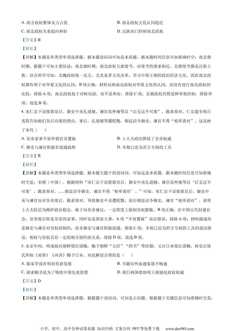 小学、初中、高中各种试卷真题知识归纳文案合同PPT等免费下载www.doc985.com2023年湖南省普通高中学业水平选择性考试历史试题本试卷满分100分,考试时间75分钟。一、选择题:本题共16小题,每小题3分,共48分。在每小题给出的四个选项中,只有一项是符合题目要求的。1.湖南澧县城头山古城遗址距今约6000年,是中国迄今已知最早的新石器时代城址。城址内外发掘出大片房屋建筑遗迹,多座陶窑,以及中国迄今已知最早的祭坛和古稻田。这说明()A.城市是最早出现的人类文明要素B.长江流域是中华文明的重要源头C.古城先民已摆脱对渔猎采集的依赖D.遗址所处时代已迈入阶级社会门槛【答案】B【解析】【详解】本题是单类型单项选择题。据本题设问词可知是本质题。据本题时间信息可知准确时空:约6000年新石器时代。据题干可知主要结论:湖南澧县城头山古城遗址距今约6000年,考古发掘反映出现原始农业、手工业、定居生活和祭祀活动,推动了中华文明的产生,因此长江流域的古城遗址说明长江流域是中华文明重要源头,B项正确;早期城市的出现促进了人类文明的产生,而城市不是人类文明的要素,排除A项;“已摆脱”说法绝对,排除C项;该遗址出现阶级分化,表明即将进入阶级社会,排除D项。故选B项。2.战国时期,关东六国国君任相多用其宗族及国人。数代秦王所用秦相,商鞅为卫人,楼缓为赵人,张仪、魏冉、范雎为魏人,蔡泽为燕人,吕不韦为韩人,李斯为楚人。据此可推知()A.秦国官僚制相对完善B.秦国用人政策不断改变C.六国严格遵行宗法制D.法家人物在六国遭排挤【答案】A【解析】【详解】本题是单类型单项选择题。根据题干设问词,可知是推断题。根据题干关键信息可知时空是:战国时期的中国。根据材料可知,与关东六国多用其宗族及国人不同,秦国的相主要来源于各诸侯国,说明当时秦国的官僚体制相对完善,并非采取世袭制,A项正确;材料未涉及秦国的用人政策改变,排除B项;战国时期宗法制遭到冲击,排除C项;材料未涉及六国的相的出身及派别,因此排挤一词无法得出,排除D项。故选A项。3.南北朝后期,南北政权遣使频繁,双方挑选使节,必求“容止可观,文学优赡者”。北朝使节皆为汉族高门人物,而非鲜卑子弟。这说明()小学、初中、高中各种试卷真题知识归纳文案合同PPT等免费下载www.doc985.comA.南方政权整体实力占优B.南北政权文化认同趋近C.南北政权关系趋向和好D.汉族高门控制南北政权【答案】B【解析】【详解】本题是单类型单项选择题。据本题设问词可知是本质题。据本题时间信息可知准确时空:南北朝时期。据题干可知主要结论:南北朝时期,南北政权互派使节,对使节的要求相近。北朝使节都是汉族士族。结合所学可知,北魏政权统一北方,尤其是孝文帝改革,学习中原王朝的政治经济文化。因此南北政权都有利于对华夏文化的认同,B项正确;材料反映南北政权对华夏文化的认同,而没有进行南北政权的比较,排除A项;南北政权处于对峙局面,而不是和好,排除C项;北朝政权仍然是鲜卑族控制,排除D项。故选B项。4.宋仁宗下诏废郭皇后。御史中丞孔道辅、谏官范仲淹等以“后无过不可废”,跪求奏对。仁宗遣宰相吕夷简告知他们皇后应废的理由。事后,孔道辅等遭贬黜,朝廷诏令御史、谏官不得“相率请对”。这反映了宋代()A.皇帝家事不容外朝官员置疑B.士大夫政治降低了皇帝权威C.御史与谏官职能有混通趋势D.宰相已沦为君主专制的工具【答案】B【解析】【详解】本题是单类型单项选择题。据本题主题干的设问词,可知这是本质题。据本题时间信息可知准确时空是:宋朝(中国)。根据材料“宋仁宗下诏废郭皇后。御史中丞孔道辅、谏官范仲淹等以‘后无过不可废’,跪求奏对。......朝廷诏令御史、谏官不得‘相率请对’。”可知,宋仁宗下诏废郭皇后,御史中丞与谏官反对皇帝废后,跪求奏对,导致御史中丞遭贬黜,而后朝廷诏令御史、谏官“相率请对”,说明士大夫阶层为维护政治稳定,敢于向皇帝谏议,一定程度上限制皇权膨胀,B项正确;在中国古代封建社会,皇帝废后即是皇帝的家事,同时也是国家大事,A项“不容置疑”说法错误,排除A项;材料描述的是御史与谏官对皇权的制约,而非御史与...