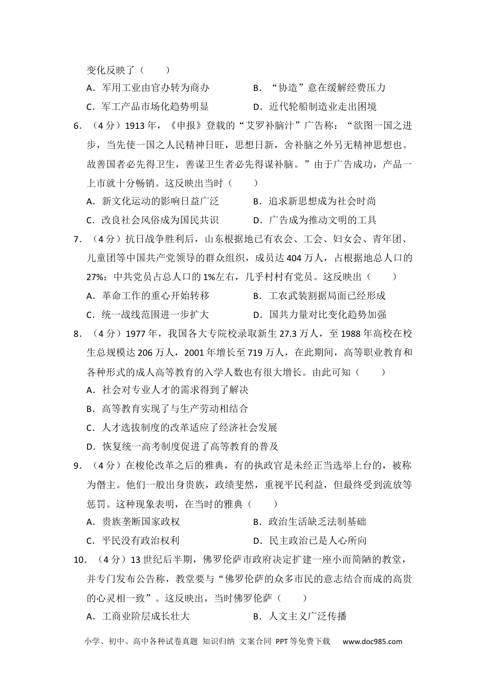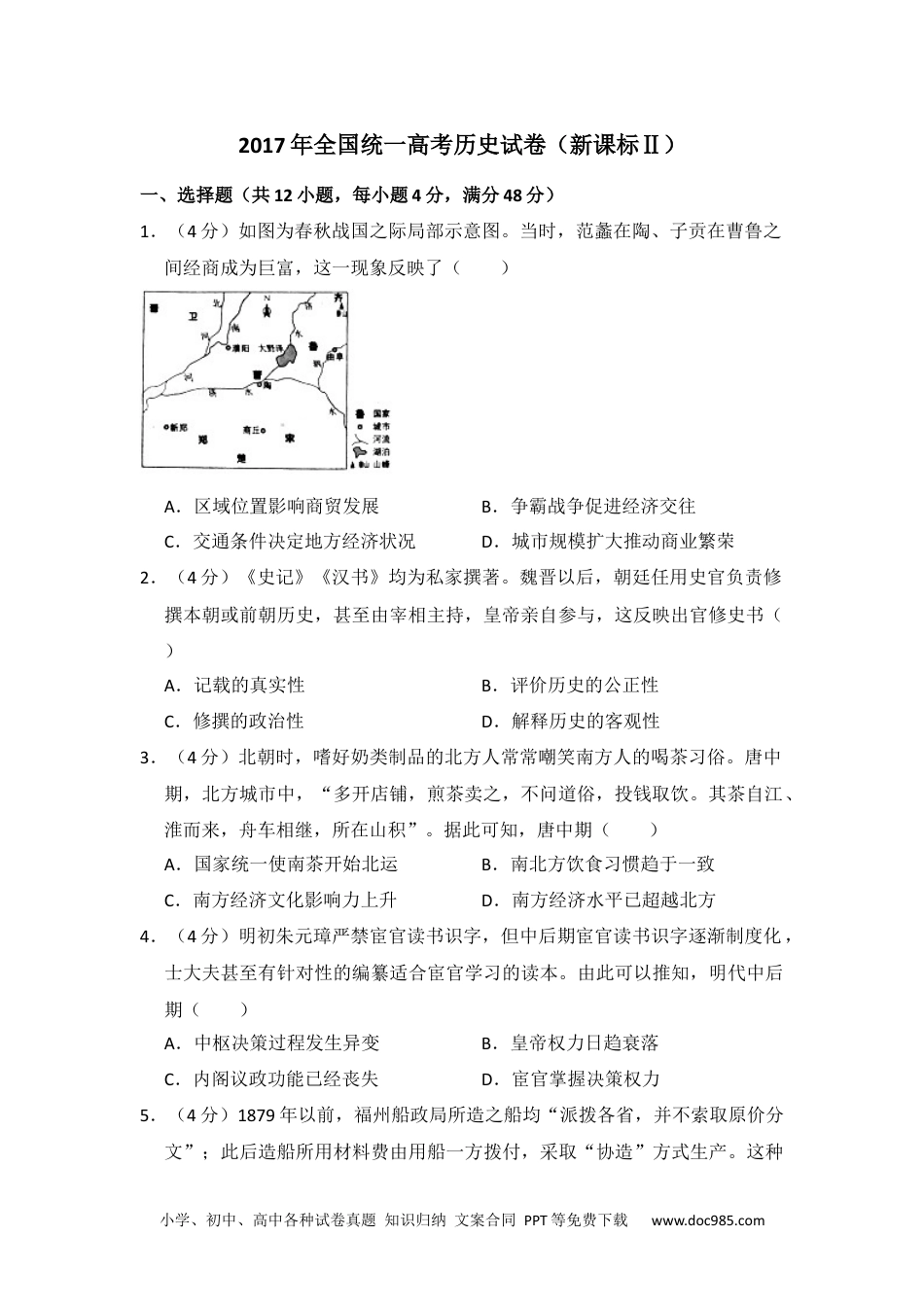 小学、初中、高中各种试卷真题知识归纳文案合同PPT等免费下载www.doc985.com2017年全国统一高考历史试卷(新课标Ⅱ)一、选择题(共12小题,每小题4分,满分48分)1.(4分)如图为春秋战国之际局部示意图。当时,范蠡在陶、子贡在曹鲁之间经商成为巨富,这一现象反映了()A.区域位置影响商贸发展B.争霸战争促进经济交往C.交通条件决定地方经济状况D.城市规模扩大推动商业繁荣2.(4分)《史记》《汉书》均为私家撰著。魏晋以后,朝廷任用史官负责修撰本朝或前朝历史,甚至由宰相主持,皇帝亲自参与,这反映出官修史书()A.记载的真实性B.评价历史的公正性C.修撰的政治性D.解释历史的客观性3.(4分)北朝时,嗜好奶类制品的北方人常常嘲笑南方人的喝茶习俗。唐中期,北方城市中,“多开店铺,煎茶卖之,不问道俗,投钱取饮。其茶自江、淮而来,舟车相继,所在山积”。据此可知,唐中期()A.国家统一使南茶开始北运B.南北方饮食习惯趋于一致C.南方经济文化影响力上升D.南方经济水平已超越北方4.(4分)明初朱元璋严禁宦官读书识字,但中后期宦官读书识字逐渐制度化,士大夫甚至有针对性的编纂适合宦官学习的读本。由此可以推知,明代中后期()A.中枢决策过程发生异变B.皇帝权力日趋衰落C.内阁议政功能已经丧失D.宦官掌握决策权力5.(4分)1879年以前,福州船政局所造之船均“派拨各省,并不索取原价分文”;此后造船所用材料费由用船一方拨付,采取“协造”方式生产。这种小学、初中、高中各种试卷真题知识归纳文案合同PPT等免费下载www.doc985.com变化反映了()A.军用工业由官办转为商办B.“协造”意在缓解经费压力C.军工产品市场化趋势明显D.近代轮船制造业走出困境6.(4分)1913年,《申报》登载的“艾罗补脑汁”广告称:“欲图一国之进步,当先使一国之人民精神日旺,思想日新,舍补脑之外另无精神思想也。故善国者必先得卫生,善谋卫生者必先得谋补脑。”由于广告成功,产品一上市就十分畅销。这反映出当时()A.新文化运动的影响日益广泛B.追求新思想成为社会时尚C.改良社会风俗成为国民共识D.广告成为推动文明的工具7.(4分)抗日战争胜利后,山东根据地已有农会、工会、妇女会、青年团、儿童团等中国共产党领导的群众组织,成员达404万人,占根据地总人口的27%;中共党员占总人口的1%左右,几乎村村有党员。这反映出()A.革命工作的重心开始转移B.工农武装割据局面已经形成C.统一战线范围进一步扩大D.国共力量对比变化趋势加强8.(4分)1977年,我国各大专院校录取新生27.3万人,至1988年高校在校生总规模达206万人,2001年增长至719万人,在此期间,高等职业教育和各种形式的成人高等教育的入学人数也有很大增长。由此可知()A.社会对专业人才的需求得到了解决B.高等教育实现了与生产劳动相结合C.人才选拔制度的改革适应了经济社会发展D.恢复统一高考制度促进了高等教育的普及9.(4分)在梭伦改革之后的雅典,有的执政官是未经正当选举上台的,被称为僭主。他们一般出身贵族,政绩斐然,重视平民利益,但最终受到流放等惩罚。这种现象表明,在当时的雅典()A.贵族垄断国家政权B.政治生活缺乏法制基础C.平民没有政治权利D.民主政治已是人心所向10.(4分)13世纪后半期,佛罗伦萨市政府决定扩建一座小而简陋的教堂,并专门发布公告称,教堂要与“佛罗伦萨的众多市民的意志结合而成的高贵的心灵相一致”。这反映出,当时佛罗伦萨()A.工商业阶层成长壮大B.人文主义广泛传播小学、初中、高中各种试卷真题知识归纳文案合同PPT等免费下载www.doc985.comC.教会权威进一步提升D.新教理论初步形成11.(4分)1800年,美国总统、联邦党人亚当斯要求政见不同的内阁成员皮克林辞职,遭到皮克林拒绝,于是亚当斯将其免职。皮克林因此成为美国历史上第一位被总统免职的内阁成员。亚当斯此举()A.加强了联邦政府的行政权力B.体现了总统与内阁之间权限不明C.行使了宪法赋予总统的职权D.反映了联邦党与其他党派的斗争12.(4分)20世纪70年代至今,《赫鲁晓夫回忆录》多次出版,并被翻译成多种语言。因其内容的复杂性,不同...