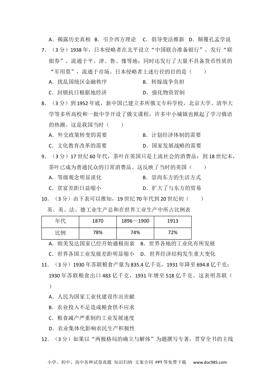 小学、初中、高中各种试卷真题知识归纳文案合同PPT等免费下载www.doc985.com2015年全国统一高考历史试卷(新课标Ⅱ)一、选择题1.(3分)古代儒家学者批评现实政治,往往称颂夏、商、周“三代”之美,甚至希望君主像尧、舜一样圣明。这表明了儒者()A.不能适应现实政治B.反对进行社会变革C.理想化的政治诉求D.以复古为政治目标2.(3分)汉宣帝曾称:“与朕共治天下者,其唯良二千石(郡太守)乎!”后来的帝王反复重申上述观念。这主要体现了()A.地方吏治是国家安定的重要因素B.中央集权与地方分权之间的矛盾C.汉代地方行政制度为后代所沿用D.历代帝王将汉宣帝作为治国榜样3.(3分)唐宋时期,江南经济迅猛发展,南宋时全国经济重心已移至江南。促成这一转变的主要动力之一是()A.坊市制度瓦解B.土地集中加剧C.农业技术进步D.海外贸易拓展4.(3分)明成祖朱棣认为,北京“山川形胜,足以控四夷,制天下”,将都城从南京迁至北京。这一举措客观上()A.推动了国家政治统一进程B.促进了跨区域贸易的繁荣C.抑制了区域性商帮的形成D.改变了南北经济文化格局5.(3分)奕䜣力倡洋务,又因在兄弟中排行第六,被称为“鬼子六”;洋务派官员丁日昌被称为“丁鬼奴”;郭嵩焘在一片冷嘲热讽中出任第一任驻英公使。这反映了()A.洋务运动与传统的观念发生冲突B.崇洋媚外行为遭到社会鄙视C.洋务派改器物不改制度受到批判D.西方列强侵略激起国人抵制6.(3分)康有为在《新学伪经考》中认为,被奉为儒家经典的古文经实系伪造。1891年该书刊印后风行国内,但很快遭到清政府禁毁。这主要是因为该书旨在()小学、初中、高中各种试卷真题知识归纳文案合同PPT等免费下载www.doc985.comA.揭露历史真相B.引介西方理论C.倡导变法维新D.颠覆孔孟学说7.(3分)1938年,日本侵略者在北平设立“中国联合准备银行”,发行“联银券”,流通于平、津、鲁、豫等地;同时还发行了大量不具备货币性质的“军用票”,流通于市场。日本侵略者上述行径的目的是()A.扰乱国统区金融秩序B.转嫁战争负担C.封锁抗日根据地经济D.强化物资管制8.(3分)到1952年底,新中国已建立多所俄文专科学校,北京大学、清华大学等多所高校和一批中学开设了俄文课程,许多中小城镇也掀起了学习俄语的热潮。这是我国当时()A.外交政策转变的需要B.计划经济体制的需要C.文化教育改革的需要D.国家发展战略的需要9.(3分)17世纪60年代,茶叶在英国只是上流社会的消费品;到18世纪末,茶叶已成为普通民众的日常消费品。这反映了当时的英国()A.等级观念明显淡化B.崇尚东方的生活方式C.贫富差距日益缩小D.扩大了与东方的贸易10.(3分)由下表可以推知,19世纪70年代到20世纪初()英、美、法、德工业生产总和在世界工业生产中所占比例表年代18701896~19001913比例78%74%72%A.欧美发达国家已经开始盛极而衰B.世界各地的工业化有所发展C.世界各国工业发展差距明显缩小D.世界经济结构发生重大变化11.(3分)1930年苏联粮食产量为835.4亿千克,1931年降至694.8亿千克;1930年苏联粮食出口483亿千克,1931年增至518亿千克。这表明苏联()A.人民为国家工业化建设作出贡献B.农业投入不足造成粮食供不应求C.粮食减产严重制约工业发展速度D.农业集体化影响农民生产积极性12.(3分)如果以“两极格局的确立与解体”为题撰写专著,贯穿全书的主线小学、初中、高中各种试卷真题知识归纳文案合同PPT等免费下载www.doc985.com应该是,美苏两国()A.根本利益的趋同B.军事冲突的加剧C.国家实力的消长D.敌对意识的淡化二、非选择题13.(25分)阅读材料,完成下列要求。材料一《孟子》中记载了孟子与其学生关于法律问题的讨论。学生问:“舜做了天子后,假如其父杀人,舜的法官该怎么办呢?”孟子回答:“抓起来就行了。”学生又问:“难道舜不阻止法官吗?”孟子说:“舜怎么能阻止呢?法官是按职责办事。”学生问:“那舜又该怎么办呢?”孟子说:“舜应当放弃天子之位,毫不顾惜。然后偷偷地背上父亲逃到海边住下,一辈子都很快乐,把曾经做过天子的事情忘掉。”﹣﹣据《孟子》材料...