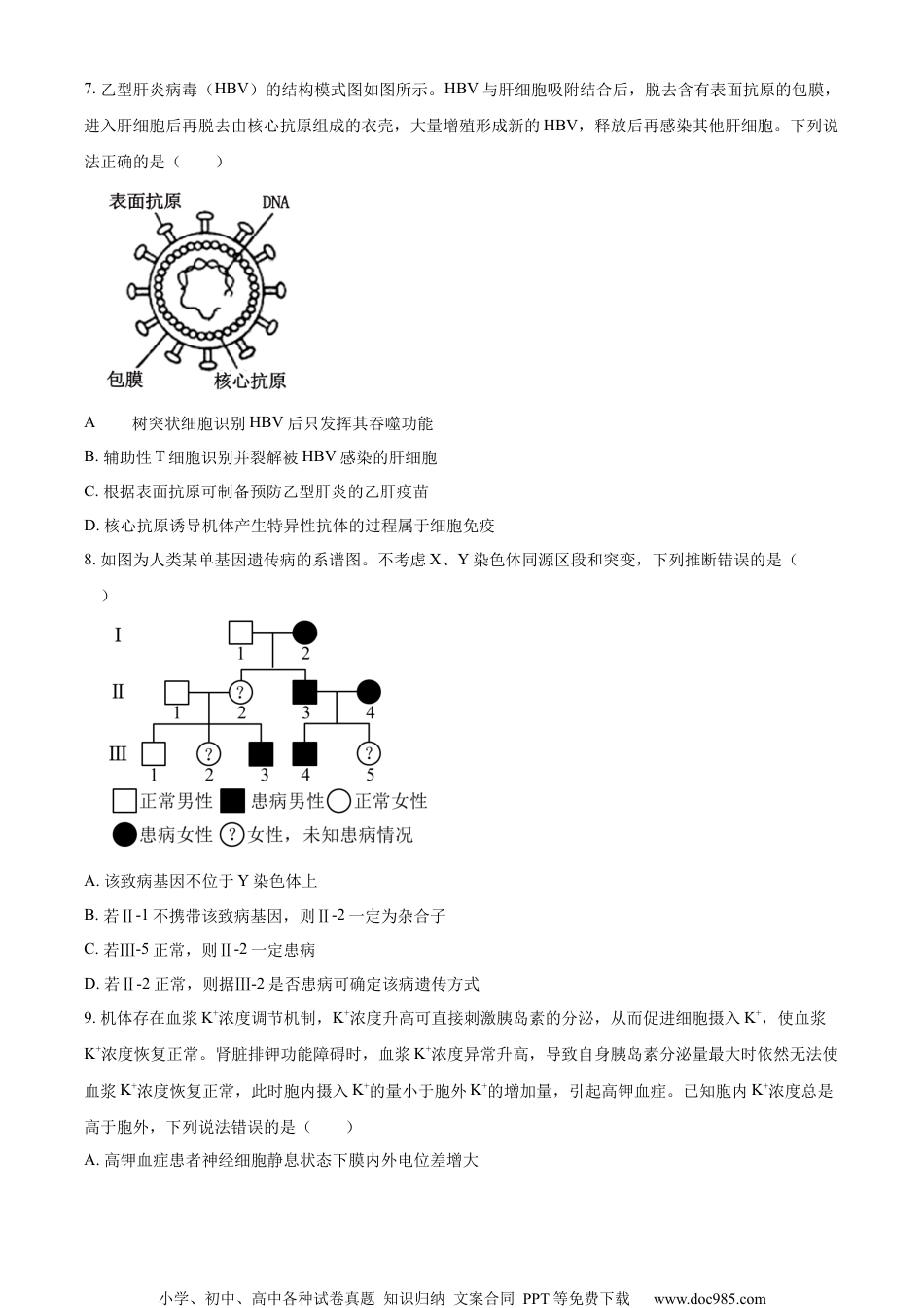 小学、初中、高中各种试卷真题知识归纳文案合同PPT等免费下载www.doc985.com机密★启用前2024年全省普通高中学业水平等级考试生物注意事项:1.答卷前,考生务必将自己的姓名、考生号等填写在答题卡和试卷指定位置。2.回答选择题时,选出每小题答案后,用铅笔把答题卡上对应题目的答案标号涂黑。如需改动,用橡皮擦干净后,再选涂其他答案标号。回答非选择题时,将答案写在答题卡上。写在本试卷上无效。3.考试结束后,将本试卷和答题卡一并交回。一、选择题:本题共15小题,每小题2分,共30分。每小题只有一个选项符合题目要求。1.植物细胞被感染后产生的环核苷酸结合并打开细胞膜上的Ca2+通道蛋白,使细胞内Ca2+浓度升高,调控相关基因表达,导致H2O2含量升高进而对细胞造成伤害;细胞膜上的受体激酶BAK1被油菜素内酯活化后关闭上述Ca2+通道蛋白。下列说法正确的是()A.环核苷酸与Ca2+均可结合Ca2+通道蛋白B.维持细胞Ca2+浓度的内低外高需消耗能量C.Ca2+作为信号分子直接抑制H2O2的分解D.油菜素内酯可使BAK1缺失的被感染细胞内H2O2含量降低2.心肌损伤诱导某种巨噬细胞吞噬、清除死亡的细胞,随后该巨噬细胞线粒体中NAD+浓度降低,生成NADH的速率减小,引起有机酸ITA的生成增加。ITA可被细胞膜上的载体蛋白L转运到细胞外。下列说法错误的是()A.细胞呼吸为巨噬细胞吞噬死亡细胞的过程提供能量B.转运ITA时,载体蛋白L的构象会发生改变C.该巨噬细胞清除死亡细胞后,有氧呼吸产生CO2的速率增大D.被吞噬的死亡细胞可由巨噬细胞的溶酶体分解3.某植物的蛋白P由其前体加工修饰后形成,并通过胞吐被排出细胞。在胞外酸性环境下,蛋白P被分生区细胞膜上的受体识别并结合,引起分生区细胞分裂。病原菌侵染使胞外环境成为碱性,导致蛋白P空间结构改变,使其不被受体识别。下列说法正确的是()A.蛋白P前体通过囊泡从核糖体转移至内质网B.蛋白P被排出细胞的过程依赖细胞膜的流动性C.提取蛋白P过程中为保持其生物活性,所用缓冲体系应为碱性D.病原菌侵染使蛋白P不被受体识别,不能体现受体识别的专一性4.仙人掌的茎由内部薄壁细胞和进行光合作用的外层细胞等组成,内部薄壁细胞的细胞壁伸缩性更大。水小学、初中、高中各种试卷真题知识归纳文案合同PPT等免费下载www.doc985.com分充足时,内部薄壁细胞和外层细胞的渗透压保持相等;干旱环境下,内部薄壁细胞中单糖合成多糖的速率比外层细胞快。下列说法错误的是()A.细胞失水过程中,细胞液浓度增大B.干旱环境下,外层细胞的细胞液浓度比内部薄壁细胞的低C.失水比例相同的情况下,外层细胞更易发生质壁分离D.干旱环境下内部薄壁细胞合成多糖的速率更快,有利于外层细胞的光合作用5.制备荧光标记的DNA探针时,需要模板、引物、DNA聚合酶等。在只含大肠杆菌DNA聚合酶、扩增缓冲液、H2O和4种脱氧核苷酸(dCTP、dTTP、dGTP和碱基被荧光标记的dATP)的反应管①~④中,分别加入如表所示的适量单链DNA.已知形成的双链DNA区遵循碱基互补配对原则,且在本实验的温度条件下不能产生小于9个连续碱基对的双链DNA区。能得到带有荧光标记的DNA探针的反应管有()反应管加入的单链DNA①5'-GCCGATCTTTATA-3'3'-GACCGGCTAGAAA-5'②5'-AGAGCCAATTGGC-3'③5'-ATTTCCCGATCCG-3'3'-AGGGCTAGGCATA-5'④5'-TTCACTGGCCAGT-3'A.①②B.②③C.①④D.③④6.某二倍体生物通过无性繁殖获得二倍体子代的机制有3种:①配子中染色体复制1次;②减数分裂Ⅰ正常,减数分裂Ⅱ姐妹染色单体分离但细胞不分裂;③减数分裂Ⅰ细胞不分裂,减数分裂Ⅱ时每个四分体形成的4条染色体中任意2条进入1个子细胞。某个体的1号染色体所含全部基因如图所示,其中A1、A2为显性基因,a1、a2为隐性基因。该个体通过无性繁殖获得了某个二倍体子代,该子代体细胞中所有1号染色体上的显性基因数与隐性基因数相等。已知发育为该子代的细胞在四分体时,1号染色体仅2条非姐妹染色单体发生了1次互换并引起了基因重组。不考虑突变,获得该子代的所有可能机制为()A.①②B.①③C.②③D.①②③小学、初中、高中各种试卷真题知识归纳文案合同PPT等免费下载www.doc985.com7.乙型肝炎病毒(HBV)的结构模式图如图所...