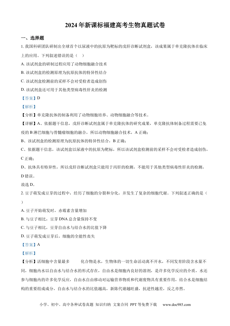 小学、初中、高中各种试卷真题知识归纳文案合同PPT等免费下载www.doc985.com2024年新课标福建高考生物真题试卷一、选择题1.我国科研团队研制出全球首个以尿液中的抗原为靶标的戊肝诊断试剂盒,该成果属于单克隆抗体在临床上的应用。下列叙述错误的是()A.该试剂盒的研制过程应用了动物细胞融合技术B.该试剂盒的检测原理为抗原抗体的特异性结合C.该试剂盒检测前的采样不会对受检者造成创伤D.该试剂盒还可用于其他类型病毒性肝炎的检测【答案】D【解析】【分析】单克隆抗体的制备利用了动物细胞培养、动物细胞融合等技术。【详解】A、依据题干信息,戊肝诊断试剂盒属于单克隆抗体的研究成果,单克隆抗体制备过程需要已免疫的B淋巴细胞与骨髓瘤细胞的融合,所以动物细胞融合技术,A正确;B、该试剂盒的检测原理为抗原抗体的特异性结合,B正确;C、依据题干信息,该试剂盒以尿液中的抗原为靶标,所以该试剂盒检测前的采样不会对受检者造成创伤,C正确;D、抗体具有特异性,所以戊肝诊断试剂盒只能用于丙肝的检测,不能用于其他类型病毒性肝炎的检测,D错误。故选D。2.豆子萌发成豆芽的过程中,经历了细胞的分裂和分化,并发生了复杂的细胞代谢。下列叙述正确的是()A.豆子开始萌发时,赤霉素含量增加B.与豆子相比,豆芽DNA总含量保持不变C.与豆子相比,豆芽自由水与结合水的比值下降D.豆子萌发成豆芽后,细胞的全能性丧失【答案】A【解析】【分析】活细胞中含量最多的化合物是水,生物体的一切生命活动离不开水,不同发育阶段含水量不同,细胞内水以自由水与结合水的形式存在,自由水是细胞内良好的溶剂,是许多化学反应的介质,水还参与细胞内的许多化学反应,自由水自由移动对运输营养物质和代谢废物具有重要作用,结合水是细胞结构的重要组成成分,自由水与结合水的比值越高,新陈代谢越旺盛,抗逆性越差,反之亦然。小学、初中、高中各种试卷真题知识归纳文案合同PPT等免费下载www.doc985.com【详解】A、赤霉素能促进种子的萌发,据此可推测,豆子开始萌发时,赤霉素含量增加,A正确;B、豆子萌发过程中细胞经过了增殖、分化,细胞增殖过程中有DNA复制,因此,与豆子相比,豆芽DNA总含量应该增加,B错误;C、种子萌发时细胞代谢加强,结合水向自由水转化,自由水与结合水的比值上升,C错误;D、豆子萌发成豆芽后,由于细胞分化程度上升,因而细胞的全能性降低,但细胞的全能性并未丧失,D错误。故选A。3.幽门螺杆菌是一种定植在胃黏膜上皮细胞表面的细菌,可导致胃溃疡甚至胃癌的发生。下列叙述正确的是()A.幽门螺杆菌通过减数分裂进行繁殖B.幽门螺杆菌导致的胃癌可遗传给后代C.抗病毒药物无法治疗幽门螺杆菌感染D.临床检测幽门螺杆菌前应口服抗生素以杀死杂菌【答案】C【解析】【分析】幽门螺旋杆菌为原核生物,没有细胞核,只有核糖体一种细胞器,以DNA为遗传物质,产生的脲酶催化分解尿素为NH3和CO2。【详解】A、幽门螺杆菌是细菌,细菌通过二分裂的方式进行繁殖,而不是减数分裂,减数分裂是有性生殖生物在产生生殖细胞时进行的特殊分裂方式,A错误;B、幽门螺杆菌导致的胃癌是由于细菌感染引起的疾病,不是遗传病,不会遗传给后代,B错误;C、幽门螺杆菌是细菌,抗病毒药物是用于治疗病毒感染的,对细菌感染无效,C正确;D、临床检测幽门螺杆菌前口服抗生素会杀死幽门螺杆菌,影响检测结果,D错误。故选C。4.朱鹮是国家一级保护鸟类。我国在朱鹮保护方面取得了重大成就,其数量从1981年的7只增加到现在的11000多只。下列保护措施中,不能提高朱鹮环境容纳量的是()A.多种植朱鹮的筑巢树木B.增加朱鹮觅食的湿地面积C.扩大朱鹮自然保护区的范围D.加强对受伤朱鹮个体的救护【答案】D【解析】【分析】环境容纳量是指环境不被破坏的前提下所能容纳的最大值,即K值,但K值并不是种群数量的最小学、初中、高中各种试卷真题知识归纳文案合同PPT等免费下载www.doc985.com大值,K值也不是一成不变的,在一个处于平衡状态的自然生态系统中,种群的数量围绕一个平均水平上下波动,这个平均水平就是合理的环境容纳量。【详解】A、多种植朱鹮的筑巢树木,能够为朱鹮提供更多的栖息空间...