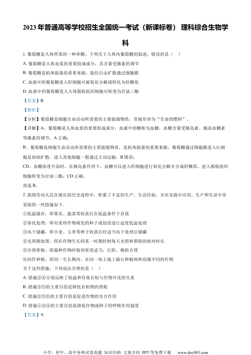 小学、初中、高中各种试卷真题知识归纳文案合同PPT等免费下载www.doc985.com2023年普通高等学校招生全国统一考试(新课标卷)理科综合生物学科1.葡萄糖是人体所需的一种单糖。下列关于人体内葡萄糖的叙述,错误的是()A.葡萄糖是人体血浆的重要组成成分,其含量受激素的调节B.葡萄糖是机体能量的重要来源,能经自由扩散通过细胞膜C.血液中的葡萄糖进入肝细胞可被氧化分解或转化为肝糖原D.血液中的葡萄糖进入人体脂肪组织细胞可转变为甘油三酯【答案】B【解析】【分析】葡萄糖是细胞生命活动所需要的主要能源物质,常被形容为“生命的燃料”。【详解】A、葡萄糖是人体血浆的重要组成成分,血液中的糖称为血糖,血糖含量受胰岛素、胰高血糖素等激素的调节,A正确;B、葡萄糖是细胞生命活动所需要的主要能源物质,是机体能量的重要来源,葡萄糖通过细胞膜进入红细胞是协助扩散,进入其他细胞一般通过主动运输,B错误;CD、血糖浓度升高时,在胰岛素作用下,血糖可以进入肝细胞进行氧化分解并合成肝糖原,进入脂肪组织细胞转变为甘油三酯,CD正确。故选B。2.我国劳动人民在漫长的历史进程中,积累了丰富的生产、生活经验,并在实践中应用。生产和生活中常采取的一些措施如下。①低温储存,即果实、蔬菜等收获后在低温条件下存放②春化处理,即对某些作物萌发的种子或幼苗进行适度低温处理③风干储藏,即小麦、玉米等种子收获后经适当风干处理后储藏④光周期处理,即在作物生长的某一时期控制每天光照和黑暗的相对时长⑤合理密植,即裁种作物时做到密度适当,行距、株距合理⑥间作种植,即同一生长期内,在同一块土地上隔行种植两种高矮不同的作物关于这些措施,下列说法合理的是()A.措施②④分别反映了低温和昼夜长短与作物开花的关系B.措施③⑤的主要目的是降低有机物的消耗C.措施②⑤⑥的主要目的是促进作物的光合作用D.措施①③④的主要目的是降低作物或种子的呼吸作用强度【答案】A小学、初中、高中各种试卷真题知识归纳文案合同PPT等免费下载www.doc985.com【解析】【分析】常考的细胞呼吸原理的应用:1、用透气纱布或“创可贴”包扎伤口:增加通气量,抑制致病菌的无氧呼吸。2、酿酒时:早期通气--促进酵母菌有氧呼吸,利于菌种繁殖,后期密封发酵罐--促进酵母菌无氧呼吸,利于产生酒精。3、做馒头或面包时,加入酵母菌,酵母菌经过发酵可以分解面粉中的葡萄糖,产生二氧化碳,二氧化碳是气体,遇热膨胀而形成小孔,使得馒头或面包暄软多孔。4、食醋、味精制作:向发酵罐中通入无菌空气,促进醋酸杆菌、谷氨酸棒状杆菌进行有氧呼吸。5、土壤松土,促进根细胞呼吸作用,有利于主动运输,为矿质元素吸收供应能量。6、稻田定期排水:促进水稻根细胞有氧呼吸。7、提倡慢跑:促进肌细胞有氧呼吸,防止无氧呼吸产生乳酸使肌肉酸胀。【详解】A、措施②春化处理是为了促进花芽形成,反映了低温与作物开花的关系,④光周期处理,反映了昼夜长短与作物开花的关系,A正确;B、措施③风干储藏可以减少自由水,从而减弱细胞呼吸,降低有机物的消耗,⑤合理密植的主要目的是提高能量利用率,促进光合作用,B错误;C、措施②春化处理是为了促进花芽形成,⑤⑥的主要目的是促进作物的光合作用,C错误;D、措施①③的主要目的是降低作物或种子的呼吸作用强度,④光周期处理,目的是促进或抑制植物开花,D错误。故选A。3.人体内的免疫细胞是体液免疫和细胞免疫过程的重要参与者。下列叙述正确的是()①免疫细胞表面的受体可识别细菌、病毒等入侵机体的病原体②树突状细胞能够处理和呈递抗原,淋巴细胞不能呈递抗原③辅助性T细胞参与体液免疫过程而不参与细胞免疫过程④体液免疫可产生记忆B细胞,细胞免疫可产生记忆T细胞⑤某些致病细菌感染人体既可引发体液免疫又可引发细胞免疫A.①②④B.①④⑤C.②③⑤D.③④⑤【答案】B【解析】【分析】免疫细胞是执行免疫功能的细胞,它们来自骨髓的造血干细胞,包括各种类型的白细胞,如淋巴细胞、树突状细胞和巨噬细胞等。【详解】①病原体进入机体后,其表面一些特定的蛋白质等物质,能够与免疫细胞表面的受体结合,从而引发免疫反应,故免疫细胞表面的...