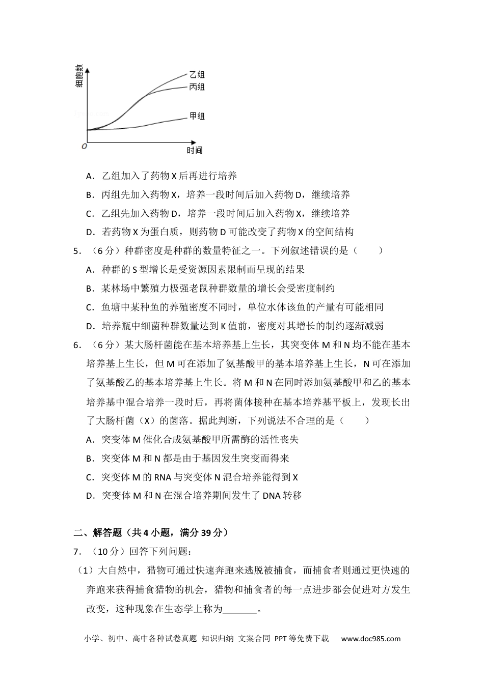 小学、初中、高中各种试卷真题知识归纳文案合同PPT等免费下载www.doc985.com2018年全国统一高考生物试卷(新课标Ⅰ)一、选择题(共6小题,每小题6分,满分36分)1.(6分)生物膜的结构与功能存在密切的联系,下列有关叙述错误的是()A.叶绿体的类囊体膜上存在催化ATP合成的酶B.溶酶体膜破裂后释放出的酶会造成细胞结构的破坏C.细胞的核膜是双层膜结构,核孔是物质进出细胞核的通道D.线粒体DNA位于线粒体外膜上,编码参与呼吸作用的酶2.(6分)生物体内的DNA常与蛋白质结合,以DNA﹣蛋白质复合物的形式存在。下列相关叙述错误的是()A.真核细胞染色体和染色质中都存在DNA﹣蛋白质复合物B.真核细胞的核中有DNA﹣蛋白质复合物,而原核细胞的拟核中没有C.若复合物中的某蛋白参与DNA复制,则该蛋白可能是DNA聚合酶D.若复合物中正在进行RNA的合成,则该复合物中含有RNA聚合酶3.(6分)下列有关植物根系吸收利用营养元素的叙述,错误的是()A.在酸性土壤中,小麦可吸收利用土壤中的N2和NO3﹣B.农田适时松土有利于农作物根细胞对矿质元素的吸收C.土壤微生物降解植物秸秆产生的无机离子可被根系吸收D.给玉米施肥过多时,会因根系水分外流引起“烧苗”现象4.(6分)已知药物X对细胞增殖有促进作用,药物D可抑制药物X的作用。某同学将同一瓶小鼠皮肤细胞平均分为甲、乙、丙三组,分别置于培养液中培养,培养过程中进行不同的处理(其中甲组未加药物),每隔一段时间测定各组细胞数。结果如图所示。据图分析,下列相关叙述不合理的是()小学、初中、高中各种试卷真题知识归纳文案合同PPT等免费下载www.doc985.comA.乙组加入了药物X后再进行培养B.丙组先加入药物X,培养一段时间后加入药物D,继续培养C.乙组先加入药物D,培养一段时间后加入药物X,继续培养D.若药物X为蛋白质,则药物D可能改变了药物X的空间结构5.(6分)种群密度是种群的数量特征之一。下列叙述错误的是()A.种群的S型增长是受资源因素限制而呈现的结果B.某林场中繁殖力极强老鼠种群数量的增长会受密度制约C.鱼塘中某种鱼的养殖密度不同时,单位水体该鱼的产量有可能相同D.培养瓶中细菌种群数量达到K值前,密度对其增长的制约逐渐减弱6.(6分)某大肠杆菌能在基本培养基上生长,其突变体M和N均不能在基本培养基上生长,但M可在添加了氨基酸甲的基本培养基上生长,N可在添加了氨基酸乙的基本培养基上生长。将M和N在同时添加氨基酸甲和乙的基本培养基中混合培养一段时后,再将菌体接种在基本培养基平板上,发现长出了大肠杆菌(X)的菌落。据此判断,下列说法不合理的是()A.突变体M催化合成氨基酸甲所需酶的活性丧失B.突变体M和N都是由于基因发生突变而得来C.突变体M的RNA与突变体N混合培养能得到XD.突变体M和N在混合培养期间发生了DNA转移二、解答题(共4小题,满分39分)7.(10分)回答下列问题:(1)大自然中,猎物可通过快速奔跑来逃脱被捕食,而捕食者则通过更快速的奔跑来获得捕食猎物的机会,猎物和捕食者的每一点进步都会促进对方发生改变,这种现象在生态学上称为。小学、初中、高中各种试卷真题知识归纳文案合同PPT等免费下载www.doc985.com(2)根据生态学家斯坦利的“收割理论”,食性广捕食者的存在有利于增加物种多样性,在这个过程中,捕食者使物种多样性增加的方式是。(3)太阳能进入生态系统的主要过程是。分解者通过来获得生命活动所需的能量。8.(9分)甲、乙两种植物净光合速率随光照强度的变化趋势如图所示,回答下列问题:(1)当光照强度大于a时,甲、乙两种植物中,对光能的利用率较高的植物是。(2)甲、乙两种植物单独种植时,如果种植密度过大,那么净光台速率下降幅度较大的植物是。判断的依据是。(3)甲、乙两种植物中,更适合在林下种植的是。(4)某植物夏日晴天中午12:00时叶片的光合速率明显下降,其原因是进入叶肉细胞的(填“O2”或“CO2”)不足。9.(8分)为探究不同因素对尿量的影响,某同学用麻醉后的实验兔进行不同的实验,实验内容如下:a.记录实验兔的尿量(单位:滴/分钟)。b.耳缘静脉注射垂体提取液0.5mL,记录尿量。c.待尿量恢复...