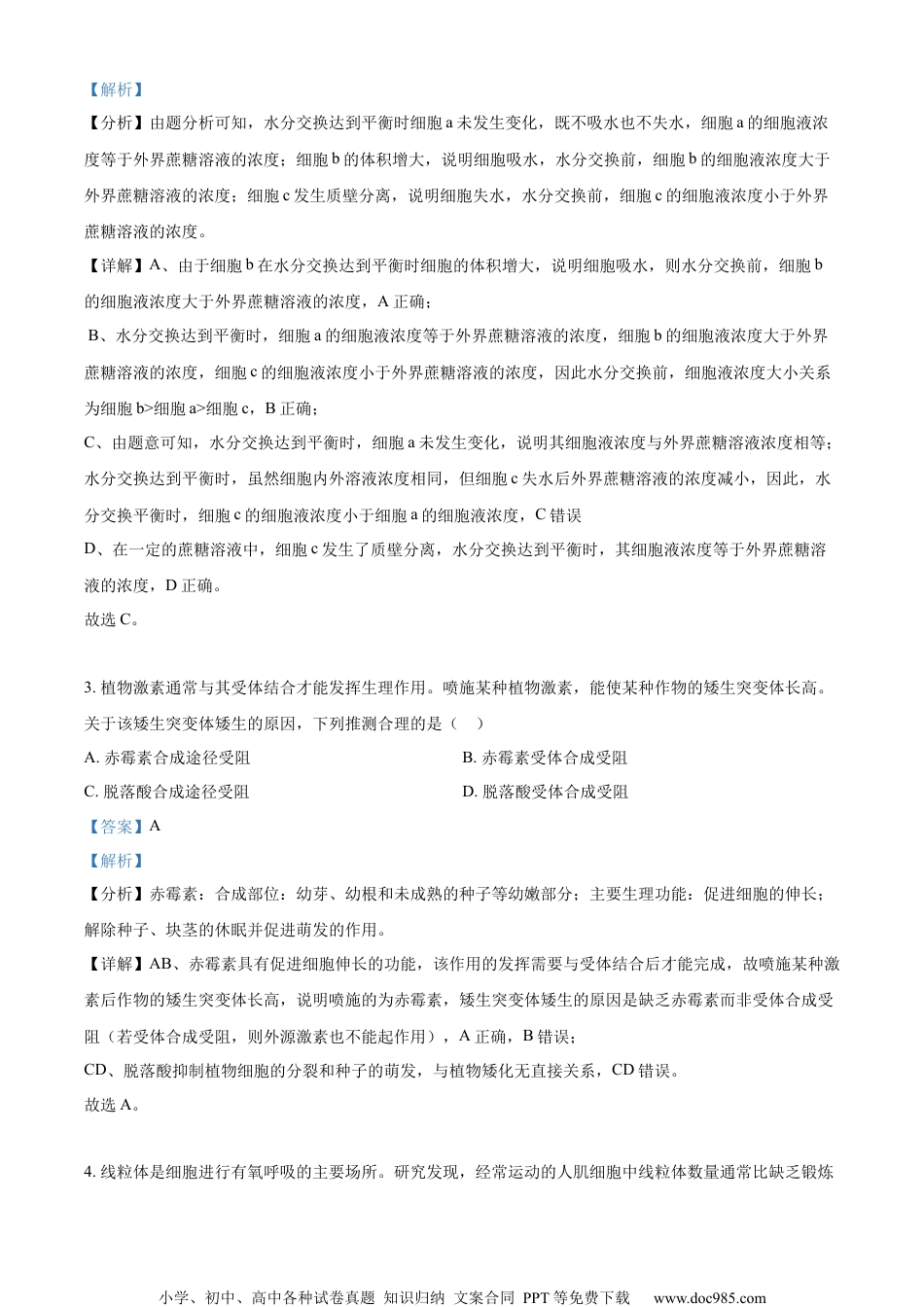 小学、初中、高中各种试卷真题知识归纳文案合同PPT等免费下载www.doc985.com2022年普通高等学校招生全国统一考试理科综合能力测试一、选择题1.钙在骨骼生长和肌肉收缩等过程中发挥重要作用。晒太阳有助于青少年骨骼生长,预防老年人骨质疏松。下列叙述错误的是()A.细胞中有以无机离子形式存在的钙B.人体内Ca2+可自由通过细胞膜的磷脂双分子层C.适当补充维生素D可以促进肠道对钙的吸收D.人体血液中钙离子浓度过低易出现抽搐现象【答案】B【解析】【分析】无机盐的存在形式与作用:(1)存在形式:细胞中大多数无机盐以离子的形式存在;(2)无机盐的功能:对维持细胞和生物体生命活动有重要作用,如:Fe是构成血红素的元素;Mg是构成叶绿素的元素。【详解】A、细胞中有以无机离子形式存在的钙,也有以化合物形式存在的钙(如CaCO3),A正确;B、Ca2+不能自由通过细胞膜的磷脂双分子层,需要载体协助,B错误;C、维生素D能有效地促进人体肠道对钙和磷的吸收,故适当补充维生素D可以促进肠道对钙的吸收,C正确;D、哺乳动物的血液中必须含有一定量的Ca2+,Ca2+的含量太低,会出现抽搐等症状,D正确。故选B。2.植物成熟叶肉细胞的细胞液浓度可以不同。现将a、b、c三种细胞液浓度不同的某种植物成熟叶肉细胞,分别放入三个装有相同浓度蔗糖溶液的试管中,当水分交换达到平衡时观察到:①细胞a未发生变化;②细胞b体积增大;③细胞c发生了质壁分离。若在水分交换期间细胞与蔗糖溶液没有溶质的交换,下列关于这一实验的叙述,不合理的是()A.水分交换前,细胞b的细胞液浓度大于外界蔗糖溶液的浓度B.水分交换前,细胞液浓度大小关系为细胞b>细胞a>细胞cC.水分交换平衡时,细胞c的细胞液浓度大于细胞a的细胞液浓度D.水分交换平衡时,细胞c的细胞液浓度等于外界蔗糖溶液的浓度【答案】C小学、初中、高中各种试卷真题知识归纳文案合同PPT等免费下载www.doc985.com【解析】【分析】由题分析可知,水分交换达到平衡时细胞a未发生变化,既不吸水也不失水,细胞a的细胞液浓度等于外界蔗糖溶液的浓度;细胞b的体积增大,说明细胞吸水,水分交换前,细胞b的细胞液浓度大于外界蔗糖溶液的浓度;细胞c发生质壁分离,说明细胞失水,水分交换前,细胞c的细胞液浓度小于外界蔗糖溶液的浓度。【详解】A、由于细胞b在水分交换达到平衡时细胞的体积增大,说明细胞吸水,则水分交换前,细胞b的细胞液浓度大于外界蔗糖溶液的浓度,A正确;B、水分交换达到平衡时,细胞a的细胞液浓度等于外界蔗糖溶液的浓度,细胞b的细胞液浓度大于外界蔗糖溶液的浓度,细胞c的细胞液浓度小于外界蔗糖溶液的浓度,因此水分交换前,细胞液浓度大小关系为细胞b>细胞a>细胞c,B正确;C、由题意可知,水分交换达到平衡时,细胞a未发生变化,说明其细胞液浓度与外界蔗糖溶液浓度相等;水分交换达到平衡时,虽然细胞内外溶液浓度相同,但细胞c失水后外界蔗糖溶液的浓度减小,因此,水分交换平衡时,细胞c的细胞液浓度小于细胞a的细胞液浓度,C错误D、在一定的蔗糖溶液中,细胞c发生了质壁分离,水分交换达到平衡时,其细胞液浓度等于外界蔗糖溶液的浓度,D正确。故选C。3.植物激素通常与其受体结合才能发挥生理作用。喷施某种植物激素,能使某种作物的矮生突变体长高。关于该矮生突变体矮生的原因,下列推测合理的是()A.赤霉素合成途径受阻B.赤霉素受体合成受阻C.脱落酸合成途径受阻D.脱落酸受体合成受阻【答案】A【解析】【分析】赤霉素:合成部位:幼芽、幼根和未成熟的种子等幼嫩部分;主要生理功能:促进细胞的伸长;解除种子、块茎的休眠并促进萌发的作用。【详解】AB、赤霉素具有促进细胞伸长的功能,该作用的发挥需要与受体结合后才能完成,故喷施某种激素后作物的矮生突变体长高,说明喷施的为赤霉素,矮生突变体矮生的原因是缺乏赤霉素而非受体合成受阻(若受体合成受阻,则外源激素也不能起作用),A正确,B错误;CD、脱落酸抑制植物细胞的分裂和种子的萌发,与植物矮化无直接关系,CD错误。故选A。4.线粒体是细胞进行有氧呼吸的主要场所。研究发现,经常运动的人肌细胞中线粒体数量通常比缺乏锻炼小学、初中、高中各种...