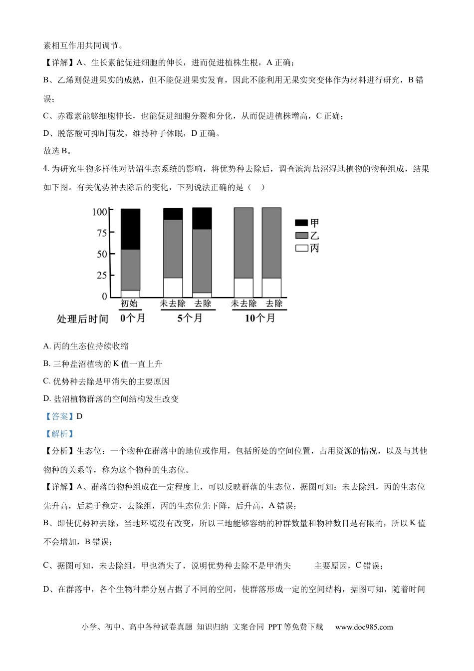 小学、初中、高中各种试卷真题知识归纳文案合同PPT等免费下载www.doc985.com2024年新课标天津高考生物真题试卷1.植物液泡含有多种水解酶,能分解衰老、损伤的细胞器,维持细胞内稳态。动物细胞内功能类似的细胞器是()A.核糖体B.溶酶体C.中心体D.高尔基体【答案】B【解析】【分析】各种细胞器在功能上既有分工又有合作,分布在细胞质基质中。【详解】A、核糖体是合成蛋白质的场所,A错误;B、溶酶体内含有多种水解酶,能分解衰老、损伤的细胞器,吞噬并杀死侵入细胞的病毒或细菌,B正确;C、中心体存在于动物细胞和低等植物细胞中,与动物细胞的有丝分裂有关,C错误;D、高尔基体是对来自内质网的蛋白质进行加工、分类、包装的“车间”和“发送站”,D错误。故选B。2.白细胞介素-14是一种由T细胞分泌的细胞因子,通过刺激B细胞增殖分化而促进()A.浆细胞形成B.树突状细胞呈递抗原C.细胞毒性T细胞分化D.巨噬细胞吞噬抗原【答案】A【解析】【分析】体液免疫过程会产生相应的浆细胞和记忆细胞,再由浆细胞产生相应的抗体;病毒侵入细胞后会引起机体发生特异性免疫中的细胞免疫,产生相应的记忆细胞和细胞毒性T细胞,细胞毒性T细胞与被病毒侵入的靶细胞结合,使得靶细胞裂解释放病毒。【详解】体液免疫过程中,白细胞介素-14是一种由T细胞分泌的细胞因子,通过刺激B细胞增殖分化而促进浆细胞形成,同时可形成记忆B细胞,其中浆细胞能够分泌抗体。故选A。3.突变体是研究植物激素功能的常用材料,以下研究材料选择不当的是()A.生长素促进植物生根——无侧根突变体B.乙烯促进果实的成熟——无果实突变体C.赤霉素促进植株增高——麦苗疯长突变体D.脱落酸维持种子休眠——种子成熟后随即萌发突变体【答案】B【解析】【分析】植物激素:由植物体内产生,能从产生部位运送到作用部位,对植物的生长发育有显著影响的微量有机物。在植物的生长发育和适应环境变化的过程中,各种植物激素并不是孤立地起作用,而是多种激小学、初中、高中各种试卷真题知识归纳文案合同PPT等免费下载www.doc985.com素相互作用共同调节。【详解】A、生长素能促进细胞的伸长,进而促进植株生根,A正确;B、乙烯则促进果实的成熟,但不能促进果实发育,因此不能利用无果实突变体作为材料进行研究,B错误;C、赤霉素能够细胞伸长,也能促进细胞分裂和分化,从而促进植株增高,C正确;D、脱落酸可抑制萌发,维持种子休眠,D正确。故选B。4.为研究生物多样性对盐沼生态系统的影响,将优势种去除后,调查滨海盐沼湿地植物的物种组成,结果如下图。有关优势种去除后的变化,下列说法正确的是()A.丙的生态位持续收缩B.三种盐沼植物的K值一直上升C.优势种去除是甲消失的主要原因D.盐沼植物群落的空间结构发生改变【答案】D【解析】【分析】生态位:一个物种在群落中的地位或作用,包括所处的空间位置,占用资源的情况,以及与其他物种的关系等,称为这个物种的生态位。【详解】A、群落的物种组成在一定程度上,可以反映群落的生态位,据图可知:未去除组,丙的生态位先升高,后趋于稳定,去除组,丙的生态位先下降,后升高,A错误;B、即使优势种去除,当地环境没有改变,所以三地能够容纳的种群数量和物种数目是有限的,所以K值不会增加,B错误;C、据图可知,未去除组,甲也消失了,说明优势种去除不是甲消失的主要原因,C错误;D、在群落中,各个生物种群分别占据了不同的空间,使群落形成一定的空间结构,据图可知,随着时间小学、初中、高中各种试卷真题知识归纳文案合同PPT等免费下载www.doc985.com的推移,群落的物种组成在不断地发生变化,盐沼植物群落的空间结构也会发生改变,D正确。故选D。5.胰岛素的研发走过了:动物提取—化学合成—重组胰岛素—生产胰岛素类似物生产等历程。有关叙述错误的是()A.动物体内胰岛素由胰岛B细胞合成并胞吐出细胞B.氨基酸是化学合成胰岛素的原料C.用大肠杆菌和乳腺生物反应器生产胰岛素需相同的启动子D.利用蛋白质工程可生产速效胰岛素等胰岛素类似物【答案】C【解析】【分析】胰岛素是由胰脏内的胰岛B细胞受内源性或外源性物质如葡萄糖、乳糖、核糖、精氨酸、胰高血糖素等的...