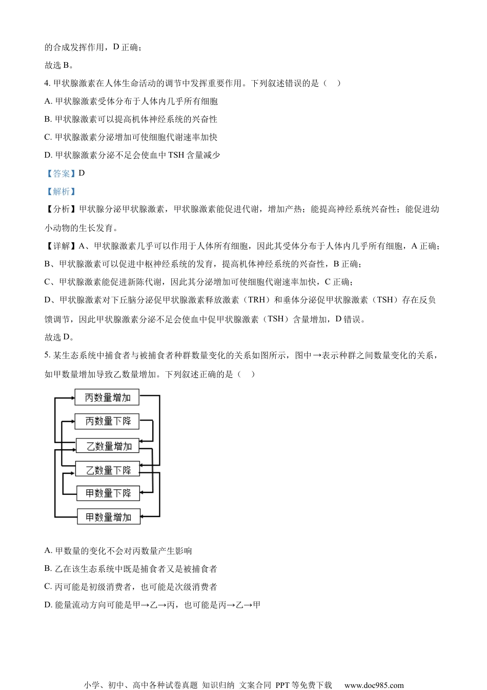 小学、初中、高中各种试卷真题知识归纳文案合同PPT等免费下载www.doc985.com2024年高考全国甲卷生物学试题一、单选题(每小题6分,共36分)1.细胞是生物体结构和功能的基本单位。下列叙述正确的是()A.病毒通常是由蛋白质外壳和核酸构成的单细胞生物B.原核生物因为没有线粒体所以都不能进行有氧呼吸C.哺乳动物同一个体中细胞的染色体数目有可能不同D.小麦根细胞吸收离子消耗的ATP主要由叶绿体产生【答案】C【解析】【分析】原核细胞和真核细胞最主要的区别是原核细胞没有核膜包被的典型的细胞核,但是它们均具有细胞膜、细胞质、核糖体以及遗传物质DNA等结构。原核生物虽没有叶绿体和线粒体,但是少数生物也能进行光合作用和有氧呼吸,如蓝藻。【详解】A、病毒没有细胞结构,A错误;B、原核生物也可以进行有氧呼吸,原核细胞中含有与有氧呼吸相关的酶,B错误;C、哺乳动物同一个体中细胞的染色体数目有可能不同,如生殖细胞中染色体数目是体细胞的一半,C正确;D、小麦根细胞不含叶绿体,而线粒体是有氧呼吸的主要场所,小麦根细胞吸收离子消耗的ATP主要由线粒体产生,D错误。故选C。2.ATP可为代谢提供能量,也参与RNA的合成,ATP结构如图所示,图中~表示高能磷酸键,下列叙述错误的是()A.ATP转化为ADP可为离子的主动运输提供能量B.用α位32P标记的ATP可以合成带有32P的RNAC.β和γ位磷酸基团之间的高能磷酸键不能在细胞核中断裂D.光合作用可将光能转化为化学能储存于β和γ位磷酸基团之间的高能磷酸键【答案】C【解析】【分析】细胞生命活动的直接能源物质是ATP,ATP的结构简式是A-P~P~P,其中“A”是腺苷,“P”是磷酸;“A”代表腺苷,“T”代表3个。小学、初中、高中各种试卷真题知识归纳文案合同PPT等免费下载www.doc985.com【详解】A、ATP为直接能源物质,γ位磷酸基团脱离ATP形成ADP的过程释放能量,可为离子主动运输提供能量,A正确;B、ATP分子水解两个高能磷酸键后,得到RNA的基本单位之一——腺嘌呤核糖核苷酸,故用α位32P标记的ATP可以合成带有32P的RNA,B正确;C、ATP可在细胞核中发挥作用,如为rRNA合成提供能量,故β和γ位磷酸基团之间的高能磷酸键能在细胞核中断裂,C错误;D、光合作用光反应,可将光能转化活跃的化学能储存于ATP的高能磷酸键中,故光合作用可将光能转化为化学能储存于β和γ位磷酸基团之间的高能磷酸键,D正确。故选C。3.植物生长发育受植物激素的调控。下列叙述错误的是()A.赤霉素可以诱导某些酶的合成促进种子萌发B.单侧光下生长素的极性运输不需要载体蛋白C.植物激素可与特异性受体结合调节基因表达D.一种激素可通过诱导其他激素的合成发挥作用【答案】B【解析】【分析】1、植物激素是由植物体内产生,能从产生部位送到作用部位,对植物的生长发育有显著影响的微量有机物;植物激素主要有生长素、赤霉素、细胞分裂素、乙烯和脱落酸等,它们对植物各种生命活动起着不同的调节作用。2、植物激素包括生长素、细胞分裂素、赤霉素、脱落酸、乙烯等。其中生长素、细胞分裂素、赤霉素能促进植物的生长,而脱落酸和乙烯是抑制植物的生长。生长素能促进子房发育成果实,而乙烯能促进果实成熟。3、调节植物生命活动的激素不是孤立的,而是相互作用共同调节的,植物生命活动的调节从根本上说是植物基因组程序性表达的结果。植物的生长发育既受内部因子(激素)的调节,也受外部因子(如光、温度、日照长度、重力、化学物质等)的影响。这些化学和物理因子通过信号转导,诱导相关基因表达,调控生长发育。【详解】A、赤霉素主要合成部位是未成熟的种子、幼根和幼芽,赤霉素能促进植物的生长,可以诱导某些酶的合成促进种子萌发,A正确;B、生长素的极性运输属于主动运输,主动运输需要载体蛋白的协助并消耗能量,B错误;C、植物激素与受体特异性结合,引发细胞内发生一系列信号转导过程,进而诱导特定基因的表达,从而产生效应,C正确;D、调节植物生命活动的激素不是孤立的,而是相互作用共同调节的,因此一种激素可通过诱导其他激素小学、初中、高中各种试卷真题知识归纳文案合同PPT等免费下载www.doc985.com的合成发挥作用,D正确;故选B。4....