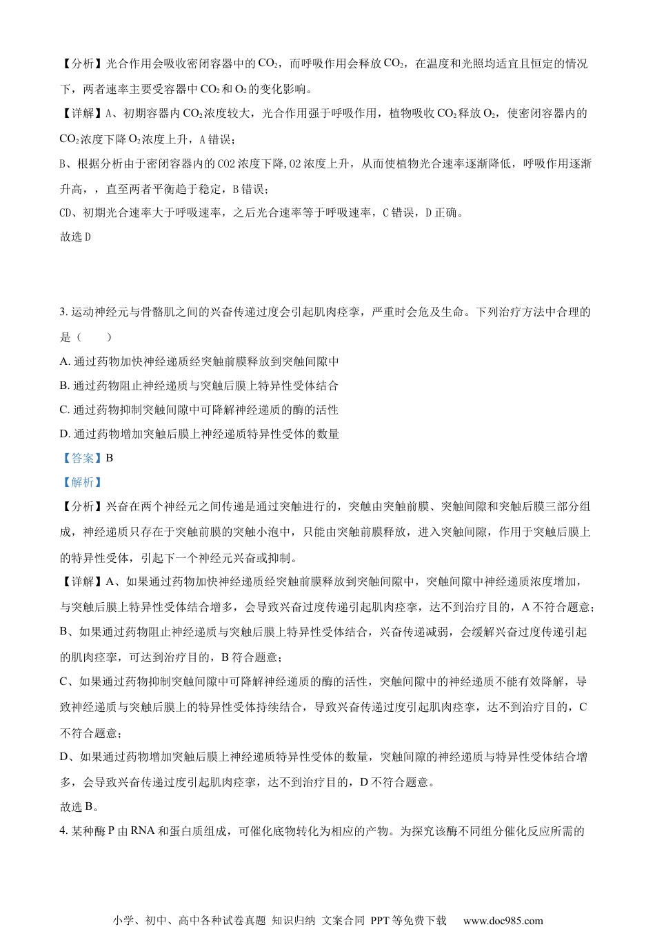 小学、初中、高中各种试卷真题知识归纳文案合同PPT等免费下载www.doc985.com2022年普通高等学校招生全国统一考试(乙卷)生物部分一、单选题1.有丝分裂和减数分裂是哺乳动物细胞分裂的两种形式。某动物的基因型是Aa,若该动物的某细胞在四分体时期一条染色单体上的A和另一条染色单体上的a发生了互换,则通常情况下姐妹染色单体分离导致等位基因A和a进入不同细胞的时期是()A.有丝分裂的后期B.有丝分裂的末期C.减数第一次分裂D.减数第二次分裂【答案】D【解析】【分析】减数分裂过程包括减数第一次分裂和减数第二次分裂;主要特点是减数第一次分裂前期同源染色体联会,可能发生同源染色体非姐妹单体之间的交叉互换,后期同源染色体分开,同时非同源染色体自由组合,实现基因的重组,减数第二次分裂则为姐妹染色单体的分离。【详解】AB、有丝分裂过程中不会发生同源染色体联会形成四分体的过程,这样就不会发生姐妹染色单体分离导致等位基因A和a进入不同细胞的现象,A、B错误;C、D、根据题意,某动物基因型是Aa,经过间期复制,初级性母细胞中有AAaa四个基因,该动物的某细胞在四分体时期发生交叉互换,涉及A和a的交换,交换后两条同源染色的姐妹染色单体上均分别具有A和a基因,减数第一次分裂时,同源染色体分开,两组Aa彼此分开进入次级性母细胞,但不会发生姐妹染色单体分离导致等位基因A和a的现象,而在减数第二次分裂时,姐妹染色单体分离,其上的A和a分开进入两个子细胞,C错误,D正确。故选D。2.某同学将一株生长正常的小麦置于密闭容器中,在适宜且恒定的温度和光照条件下培养,发现容器内CO2含量初期逐渐降低,之后保持相对稳定。关于这一实验现象,下列解释合理的是()A.初期光合速率逐渐升高,之后光合速率等于呼吸速率B.初期光合速率和呼吸速率均降低,之后呼吸速率保持稳定C.初期呼吸速率大于光合速率,之后呼吸速率等于光合速率D.初期光合速率大于呼吸速率,之后光合速率等于呼吸速率【答案】D【解析】小学、初中、高中各种试卷真题知识归纳文案合同PPT等免费下载www.doc985.com【分析】光合作用会吸收密闭容器中的CO2,而呼吸作用会释放CO2,在温度和光照均适宜且恒定的情况下,两者速率主要受容器中CO2和O2的变化影响。【详解】A、初期容器内CO2浓度较大,光合作用强于呼吸作用,植物吸收CO2释放O2,使密闭容器内的CO2浓度下降O2浓度上升,A错误;B、根据分析由于密闭容器内的CO2浓度下降,O2浓度上升,从而使植物光合速率逐渐降低,呼吸作用逐渐升高,,直至两者平衡趋于稳定,B错误;CD、初期光合速率大于呼吸速率,之后光合速率等于呼吸速率,C错误,D正确。故选D。3.运动神经元与骨骼肌之间的兴奋传递过度会引起肌肉痉挛,严重时会危及生命。下列治疗方法中合理的是()A.通过药物加快神经递质经突触前膜释放到突触间隙中B.通过药物阻止神经递质与突触后膜上特异性受体结合C.通过药物抑制突触间隙中可降解神经递质的酶的活性D.通过药物增加突触后膜上神经递质特异性受体的数量【答案】B【解析】【分析】兴奋在两个神经元之间传递是通过突触进行的,突触由突触前膜、突触间隙和突触后膜三部分组成,神经递质只存在于突触前膜的突触小泡中,只能由突触前膜释放,进入突触间隙,作用于突触后膜上的特异性受体,引起下一个神经元兴奋或抑制。【详解】A、如果通过药物加快神经递质经突触前膜释放到突触间隙中,突触间隙中神经递质浓度增加,与突触后膜上特异性受体结合增多,会导致兴奋过度传递引起肌肉痉挛,达不到治疗目的,A不符合题意;B、如果通过药物阻止神经递质与突触后膜上特异性受体结合,兴奋传递减弱,会缓解兴奋过度传递引起的肌肉痉挛,可达到治疗目的,B符合题意;C、如果通过药物抑制突触间隙中可降解神经递质的酶的活性,突触间隙中的神经递质不能有效降解,导致神经递质与突触后膜上的特异性受体持续结合,导致兴奋传递过度引起肌肉痉挛,达不到治疗目的,C不符合题意;D、如果通过药物增加突触后膜上神经递质特异性受体的数量,突触间隙的神经递质与特异性受体结合增多,会导致兴奋传递过度引起肌肉痉挛,达不到治疗目的,D不符合题意。故选B。4...