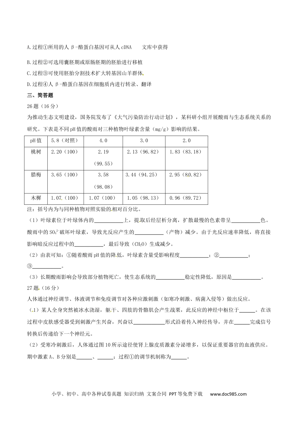 小学、初中、高中各种试卷真题知识归纳文案合同PPT等免费下载www.doc985.com一、单项选择题1.下列各组细胞器均具单层膜的是()A液泡和核糖体B中心体和叶绿体C溶酶体和高尔基体D内质网和线粒体2.关于人胰岛素的叙述,正确的是()①以碳链为基本骨架②与双缩脲试剂反应呈蓝色③促进肝糖原分解④由胰岛B细胞合成、分泌A①③B①④C②③D③④[来源:Zxxk.Com]3.关于DNA的实验,叙述正确的是()A用兔的成熟红细胞可提取DNABPCR的每个循环一般依次经过变性-延伸-复性三步CDNA溶液与二苯胺试剂混合,沸水浴后生成蓝色产物D用甲基绿对人的口腔上皮细胞染色,细胞核呈绿色,细胞质呈红色4.图1表示在一个10ml的密闭培养体系中酵母菌细胞数量的动态变化,关于酵母菌数量的叙述,正确的是()A种内斗争导致初始阶段增长缓慢B可用数学模型Nt=N0λt表示C可用取样器取样法计数DK值约为120000个5.水仙素处理二倍体植物的愈伤组织,从获得的再生植株中筛选四倍体植株,预实验结果如右表,正式实验时秋水仙素浓度设计最合理的是()秋水仙素浓度(g/L)再生植株(棵)四倍体植株(棵)0480小学、初中、高中各种试卷真题知识归纳文案合同PPT等免费下载www.doc985.com244443786281181851092A.0、2、3、4、5、6B.0、4、5、6、7、8C.0、6、7、8、9、10D.0、3、6、9、12、156.以下选项正确的是()二、双项选择题24.由苯丙氨酸羟化酶基因突变引起的苯丙酮尿症是常染色体隐性遗传病,我国部分地市对新生儿进行免费筛查并为患儿提供低苯丙氨酸奶粉。下列叙述正确的是()A.检测出携带者是预防该病的关键B.在某群体中发病率为1/10000,则携带者的频率约为1/100C.通过染色体检查及系谱图分析,可明确诊断携带者和新生儿患者D.减少苯丙氨酸摄入可改善新生儿患者症状,说明环境能影响表现型25.图9为培育转基因山羊生产人β-酪蛋白的流程图[来源:学&科&网Z&X&X&K]下列叙述正确的是()小学、初中、高中各种试卷真题知识归纳文案合同PPT等免费下载www.doc985.comA.过程①所用的人β-酪蛋白基因可从人cDNA文库中获得B.过程②可选用囊胚期或原肠胚期的胚胎进行移植C.过程③可使用胚胎分割技术扩大转基因山羊群体D.过程④人β-酪蛋白基因在细胞质内进行转录、翻译三、简答题26题(16分)为推动生态文明建设,国务院发布了《大气污染防治行动计划》,某科研小组开展酸雨与生态系统关系的研究。下表是不同pH值的酸雨对三种植物叶绿素含量(mg/g)影响的结果。pH值5.8(对照)4.03.02.0桃树2.20(100)2.19(99.55)2.13(96.82)1.83(83.18)腊梅3.65(100)3.58(98.08)3.44(94.25)[来源:2.95(80.82)木樨1.07(100)1.07(100)1.05(98.13)0.96(89.72)注:括号内为与同种植物对照实验的相对百分比。(1)叶绿素位于叶绿体内的___________上,提取后经层析分离,扩散最慢的色素带呈___________色。酸雨中的SO42-破坏叶绿素,导致光反应产生的___________(产物)减少。由于光反应速率降低,将直接影响暗反应过程中的___________,最后导致(CH2O)生成减少。(2)由表可知:①随着酸雨pH值的降低,叶绿素含量受影响程度___________;②___________;③___________。(3)长期酸雨影响会导致部分植物死亡,使生态系统的___________稳定性降低,原因是___________。27题(16分)人体通过神经调节、体液调节和免疫调节对各种应激刺激(如寒冷刺激、病菌入侵等)做出反应。(1)某人全身突然被冰水浇湿,躯干、四肢的骨骼肌会产生战栗,此反应的神经中枢位于______。在该过程中皮肤感受器受到刺激产生兴奋,兴奋以____________形式沿着传入神经传导,并在______完成信号转换后传递给下一个神经元。(2)受寒冷刺激后,人体通过图10所示途径使肾上腺皮质激素分泌增多,以保证重要器官的血液供应。期中激素A、B分别是______、______;过程①的调节机制称为______。小学、初中、高中各种试卷真题知识归纳文案合同PPT等免费下载www.doc985.com(3)儿童按计划免疫接种卡介苗以预防结核病,机体会产生抗体,记忆T细胞和记忆B细胞等。此后当外界结核杆菌侵入机体,机体启动特异性免疫,一方面由______产生特异性抗体进行...