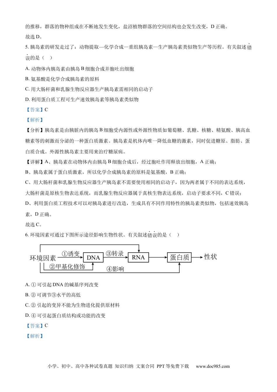 小学、初中、高中各种试卷真题知识归纳文案合同PPT等免费下载www.doc985.com2024年新课标天津高考生物真题试卷1.植物液泡含有多种水解酶,能分解衰老、损伤的细胞器,维持细胞内稳态。动物细胞内功能类似的细胞器是()A.核糖体B.溶酶体C.中心体D.高尔基体【答案】B【解析】【分析】各种细胞器在功能上既有分工又有合作,分布在细胞质基质中。【详解】A、核糖体是合成蛋白质的场所,A错误;B、溶酶体内含有多种水解酶,能分解衰老、损伤的细胞器,吞噬并杀死侵入细胞的病毒或细菌,B正确;C、中心体存在于动物细胞和低等植物细胞中,与动物细胞的有丝分裂有关,C错误;D、高尔基体是对来自内质网的蛋白质进行加工、分类、包装的“车间”和“发送站”,D错误。故选B。2.白细胞介素-14是一种由T细胞分泌的细胞因子,通过刺激B细胞增殖分化而促进()A.浆细胞形成B.树突状细胞呈递抗原C.细胞毒性T细胞分化D.巨噬细胞吞噬抗原【答案】A【解析】【分析】体液免疫过程会产生相应的浆细胞和记忆细胞,再由浆细胞产生相应的抗体;病毒侵入细胞后会引起机体发生特异性免疫中的细胞免疫,产生相应的记忆细胞和细胞毒性T细胞,细胞毒性T细胞与被病毒侵入的靶细胞结合,使得靶细胞裂解释放病毒。【详解】体液免疫过程中,白细胞介素-14是一种由T细胞分泌的细胞因子,通过刺激B细胞增殖分化而促进浆细胞形成,同时可形成记忆B细胞,其中浆细胞能够分泌抗体。故选A。3.突变体是研究植物激素功能的常用材料,以下研究材料选择不当的是()A.生长素促进植物生根——无侧根突变体B.乙烯促进果实的成熟——无果实突变体C.赤霉素促进植株增高——麦苗疯长突变体D.脱落酸维持种子休眠——种子成熟后随即萌发突变体【答案】B【解析】【分析】植物激素:由植物体内产生,能从产生部位运送到作用部位,对植物的生长发育有显著影响的微量有机物。在植物的生长发育和适应环境变化的过程中,各种植物激素并不是孤立地起作用,而是多种激小学、初中、高中各种试卷真题知识归纳文案合同PPT等免费下载www.doc985.com素相互作用共同调节。【详解】A、生长素能促进细胞的伸长,进而促进植株生根,A正确;B、乙烯则促进果实的成熟,但不能促进果实发育,因此不能利用无果实突变体作为材料进行研究,B错误;C、赤霉素能够细胞伸长,也能促进细胞分裂和分化,从而促进植株增高,C正确;D、脱落酸可抑制萌发,维持种子休眠,D正确。故选B。4.为研究生物多样性对盐沼生态系统的影响,将优势种去除后,调查滨海盐沼湿地植物的物种组成,结果如下图。有关优势种去除后的变化,下列说法正确的是()A.丙的生态位持续收缩B.三种盐沼植物的K值一直上升C.优势种去除是甲消失的主要原因D.盐沼植物群落的空间结构发生改变【答案】D【解析】【分析】生态位:一个物种在群落中的地位或作用,包括所处的空间位置,占用资源的情况,以及与其他物种的关系等,称为这个物种的生态位。【详解】A、群落的物种组成在一定程度上,可以反映群落的生态位,据图可知:未去除组,丙的生态位先升高,后趋于稳定,去除组,丙的生态位先下降,后升高,A错误;B、即使优势种去除,当地环境没有改变,所以三地能够容纳的种群数量和物种数目是有限的,所以K值不会增加,B错误;C、据图可知,未去除组,甲也消失了,说明优势种去除不是甲消失的主要原因,C错误;D、在群落中,各个生物种群分别占据了不同的空间,使群落形成一定的空间结构,据图可知,随着时间小学、初中、高中各种试卷真题知识归纳文案合同PPT等免费下载www.doc985.com的推移,群落的物种组成在不断地发生变化,盐沼植物群落的空间结构也会发生改变,D正确。故选D。5.胰岛素的研发走过了:动物提取—化学合成—重组胰岛素—生产胰岛素类似物生产等历程。有关叙述错误的是()A.动物体内胰岛素由胰岛B细胞合成并胞吐出细胞B.氨基酸是化学合成胰岛素的原料C.用大肠杆菌和乳腺生物反应器生产胰岛素需相同的启动子D.利用蛋白质工程可生产速效胰岛素等胰岛素类似物【答案】C【解析】【分析】胰岛素是由胰脏内的胰岛B细胞受内源性或外源性物质如葡萄糖、乳糖、核糖、精氨酸、胰高血糖素等的...