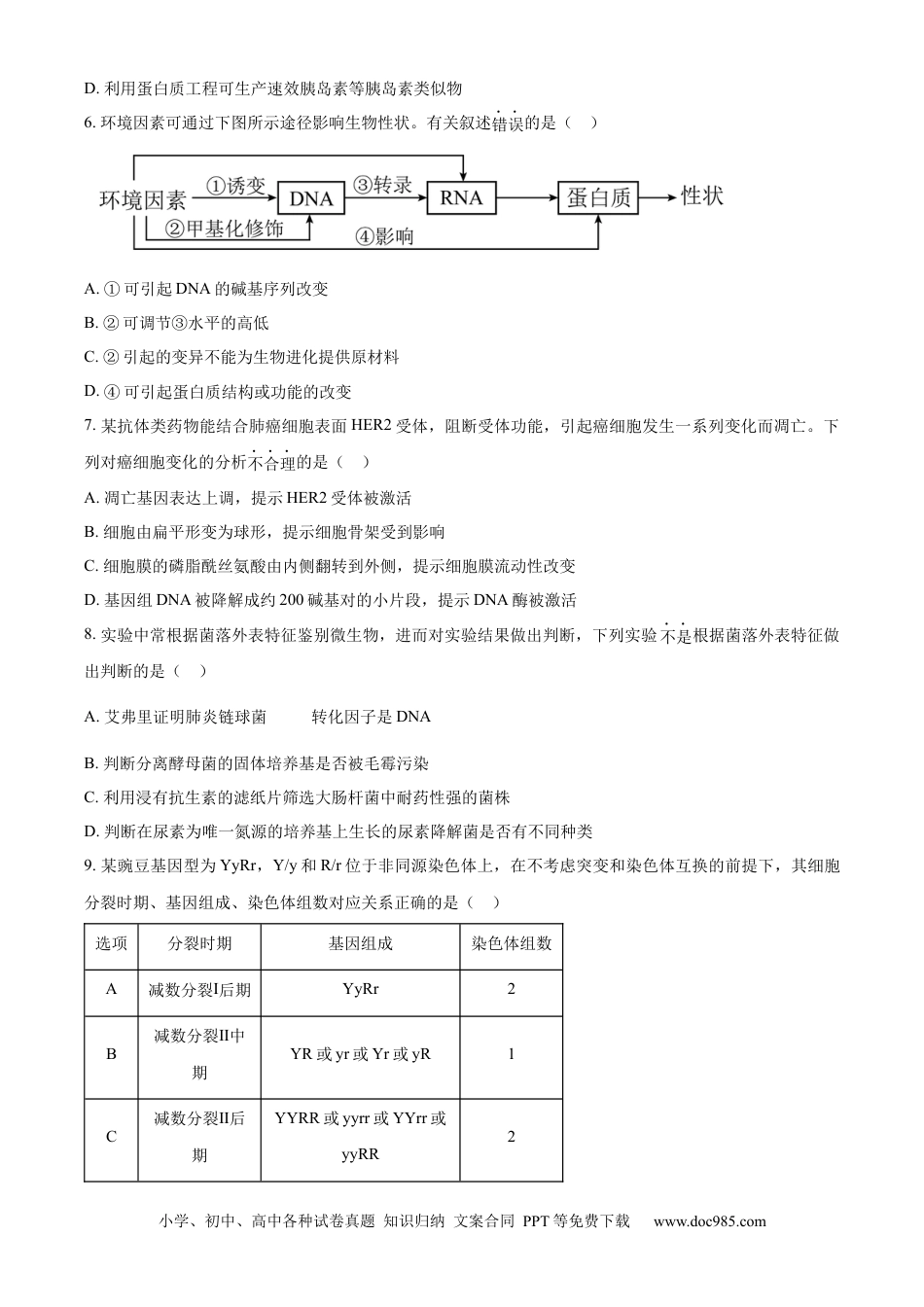 小学、初中、高中各种试卷真题知识归纳文案合同PPT等免费下载www.doc985.com2024年新课标天津高考生物真题试卷1.植物液泡含有多种水解酶,能分解衰老、损伤的细胞器,维持细胞内稳态。动物细胞内功能类似的细胞器是()A.核糖体B.溶酶体C.中心体D.高尔基体2.白细胞介素-14是一种由T细胞分泌的细胞因子,通过刺激B细胞增殖分化而促进()A.浆细胞形成B.树突状细胞呈递抗原C.细胞毒性T细胞分化D.巨噬细胞吞噬抗原3.突变体是研究植物激素功能的常用材料,以下研究材料选择不当的是()A.生长素促进植物生根——无侧根突变体B.乙烯促进果实的成熟——无果实突变体C.赤霉素促进植株增高——麦苗疯长突变体D.脱落酸维持种子休眠——种子成熟后随即萌发突变体4.为研究生物多样性对盐沼生态系统的影响,将优势种去除后,调查滨海盐沼湿地植物的物种组成,结果如下图。有关优势种去除后的变化,下列说法正确的是()A.丙的生态位持续收缩B.三种盐沼植物的K值一直上升C.优势种去除是甲消失的主要原因D.盐沼植物群落的空间结构发生改变5.胰岛素的研发走过了:动物提取—化学合成—重组胰岛素—生产胰岛素类似物生产等历程。有关叙述错误的是()A.动物体内胰岛素由胰岛B细胞合成并胞吐出细胞B.氨基酸是化学合成胰岛素的原料C.用大肠杆菌和乳腺生物反应器生产胰岛素需相同的启动子小学、初中、高中各种试卷真题知识归纳文案合同PPT等免费下载www.doc985.comD.利用蛋白质工程可生产速效胰岛素等胰岛素类似物6.环境因素可通过下图所示途径影响生物性状。有关叙述错误的是()A.①可引起DNA的碱基序列改变B.②可调节③水平的高低C.②引起的变异不能为生物进化提供原材料D.④可引起蛋白质结构或功能的改变7.某抗体类药物能结合肺癌细胞表面HER2受体,阻断受体功能,引起癌细胞发生一系列变化而凋亡。下列对癌细胞变化的分析不合理的是()A.凋亡基因表达上调,提示HER2受体被激活B.细胞由扁平形变为球形,提示细胞骨架受到影响C.细胞膜的磷脂酰丝氨酸由内侧翻转到外侧,提示细胞膜流动性改变D.基因组DNA被降解成约200碱基对的小片段,提示DNA酶被激活8.实验中常根据菌落外表特征鉴别微生物,进而对实验结果做出判断,下列实验不是根据菌落外表特征做出判断的是()A.艾弗里证明肺炎链球菌的转化因子是DNAB.判断分离酵母菌的固体培养基是否被毛霉污染C.利用浸有抗生素的滤纸片筛选大肠杆菌中耐药性强的菌株D.判断在尿素为唯一氮源的培养基上生长的尿素降解菌是否有不同种类9.某豌豆基因型为YyRr,Y/y和R/r位于非同源染色体上,在不考虑突变和染色体互换的前提下,其细胞分裂时期、基因组成、染色体组数对应关系正确的是()选项分裂时期基因组成染色体组数A减数分裂Ⅰ后期YyRr2B减数分裂Ⅱ中期YR或yr或Yr或yR1C减数分裂Ⅱ后期YYRR或yyrr或YYrr或yyRR2小学、初中、高中各种试卷真题知识归纳文案合同PPT等免费下载www.doc985.comD有丝分裂后期YYyyRRrr2A.AB.BC.CD.D阅读下列材料,完成下面小题。蛋白质的2-羟基异丁酰化(Khib)修饰与去修饰对植物抗病性具有重要调节作用。棉花M蛋白是去除Khib修饰的酶,大丽轮枝菌感染可以诱导易感棉M基因表达上调,而抗病棉无论感染与否,M基因一直低表达。H4是结合并稳定染色质DNA的组蛋白之一。M蛋白可降低H4的Khib修饰,导致DNA螺旋化程度提高,使转录相关酶更难与DNA结合,降低抗病相关基因(如水杨酸受体基因)的表达。P蛋白由核内P基因编码,经翻译后转移并定位于叶绿体中,参与捕光复合体Ⅱ的损伤修复。M蛋白可降低P蛋白的Khib修饰,从而削弱P蛋白对捕光复合体Ⅱ的修复功能,进而降低叶绿体产生活性氧的能力,导致易感棉抗病性下降。10.H4的Khib修饰改变了()A.染色质的DNA序列B.水杨酸受体基因的转录水平C.转录相关酶的活性D.M蛋白的活性11.为提高易感棉的抗病性,采取的措施正确的是()A.将抗病棉的M基因转入易感棉B.上调M基因表达C.降低H4的Khib修饰D.增加P蛋白的Khib修饰12.棉花通过复杂的机制调节其抗病能力,下列说法错误的是()A.P基因表达及其产物行使功能涉及细胞核、核糖体和叶绿体等B.棉花的抗病能力既受核蛋白也受叶绿体蛋白的调控C.Khib修饰...
